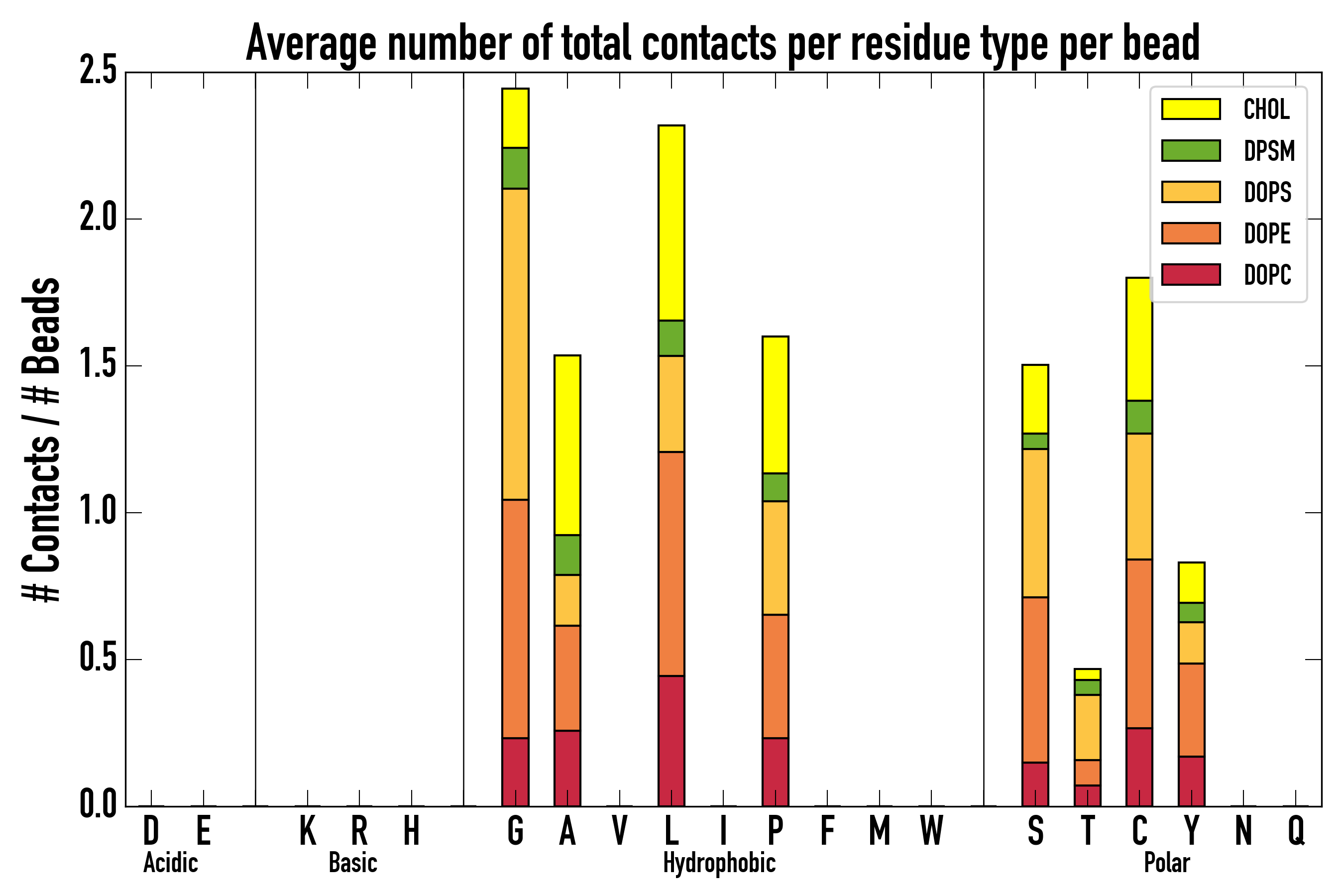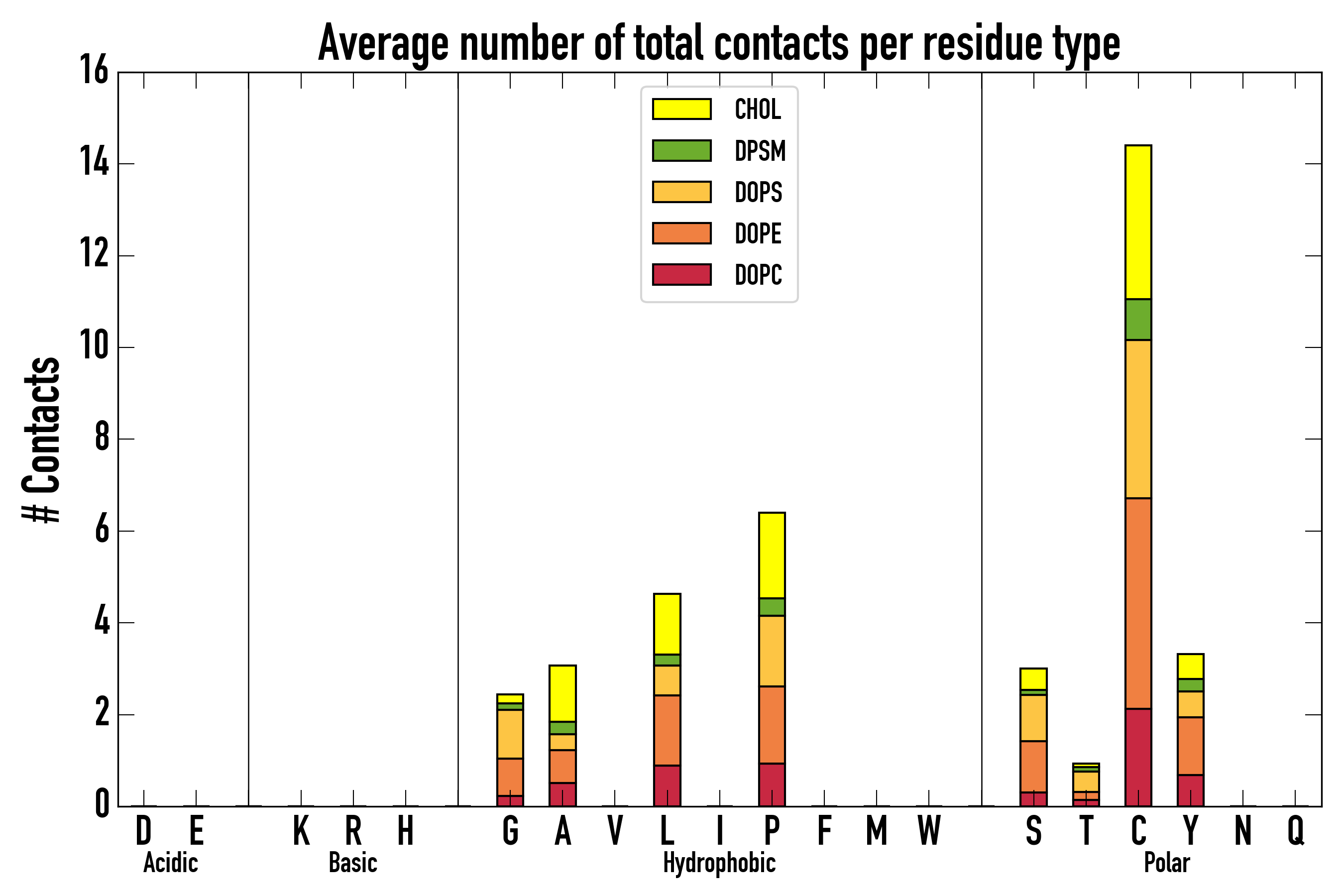 Number of contacts between each residue of the peptide backbone and the different lipid types, averaged over the last microsecond and using a cut-off of 0.6 nm.