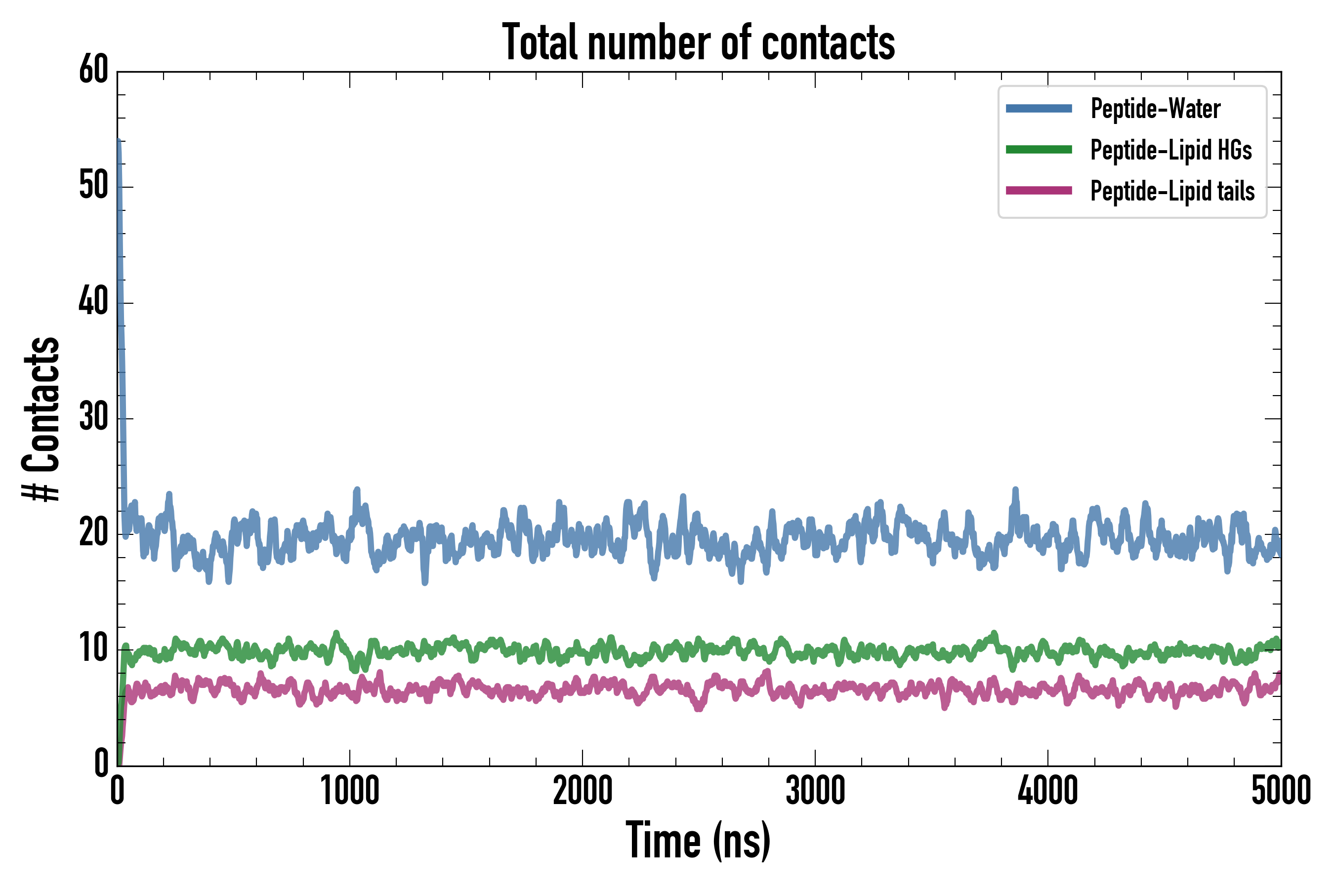 Number of contacts between each residue of the peptide backbone and the different lipid types, averaged over the last microsecond and using a cut-off of 0.6 nm.