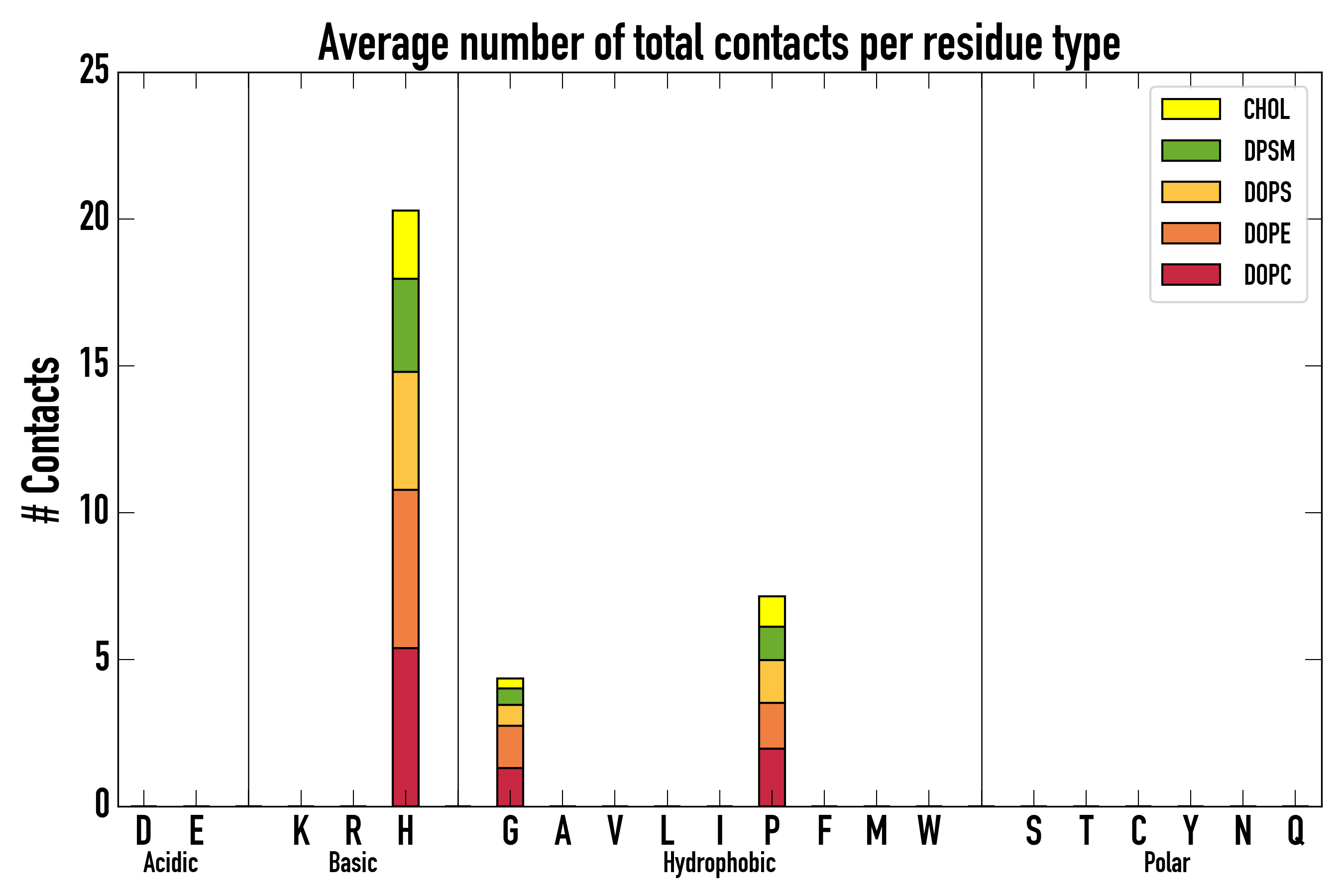 Number of contacts between each residue of the peptide backbone and the different lipid types, averaged over the last microsecond and using a cut-off of 0.6 nm.