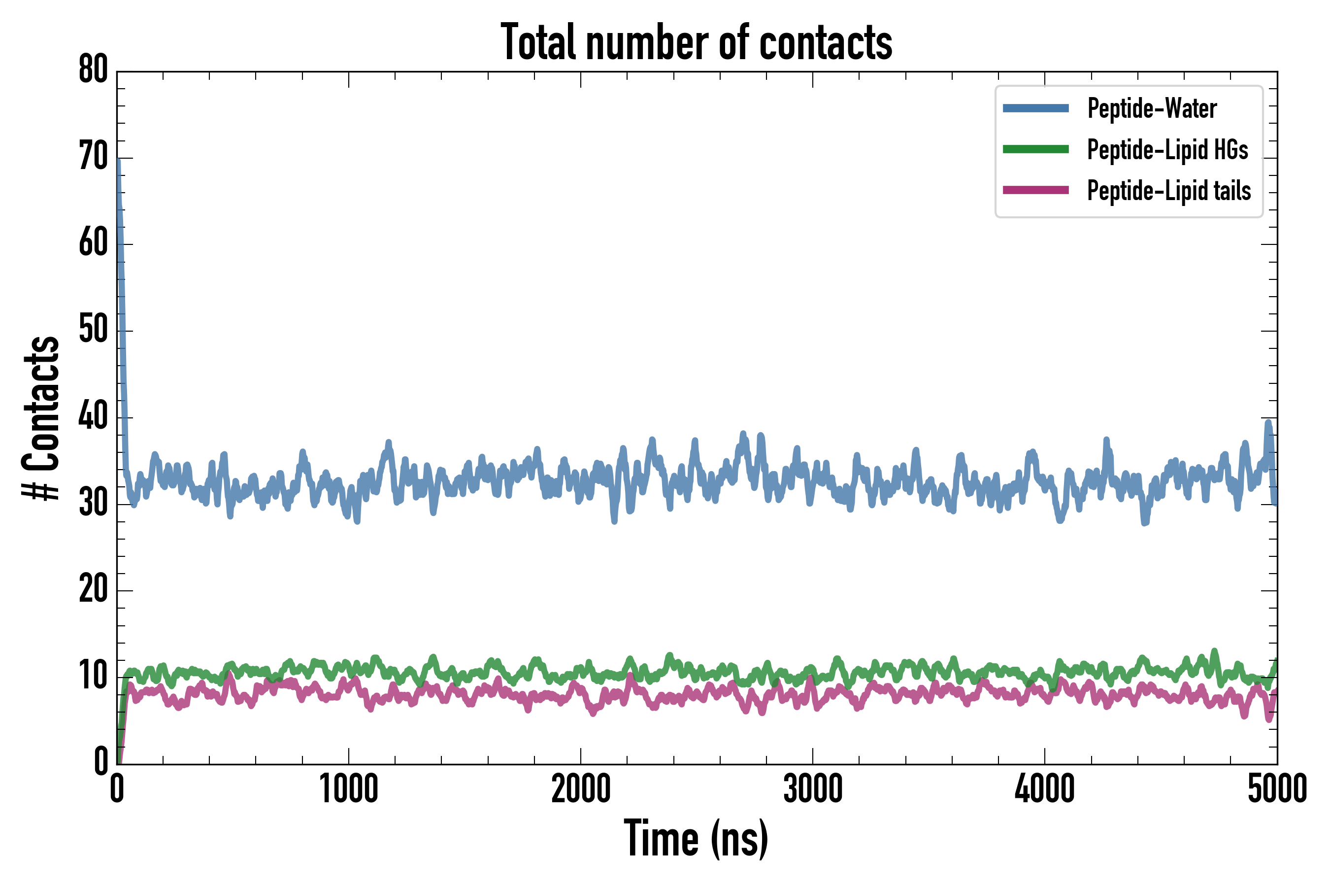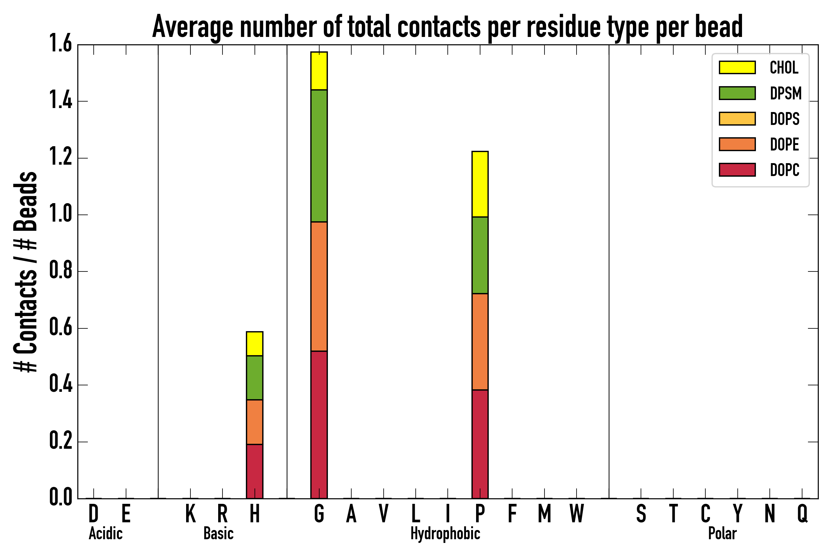 Number of contacts between each residue of the peptide backbone and the different lipid types, averaged over the last microsecond and using a cut-off of 0.6 nm.