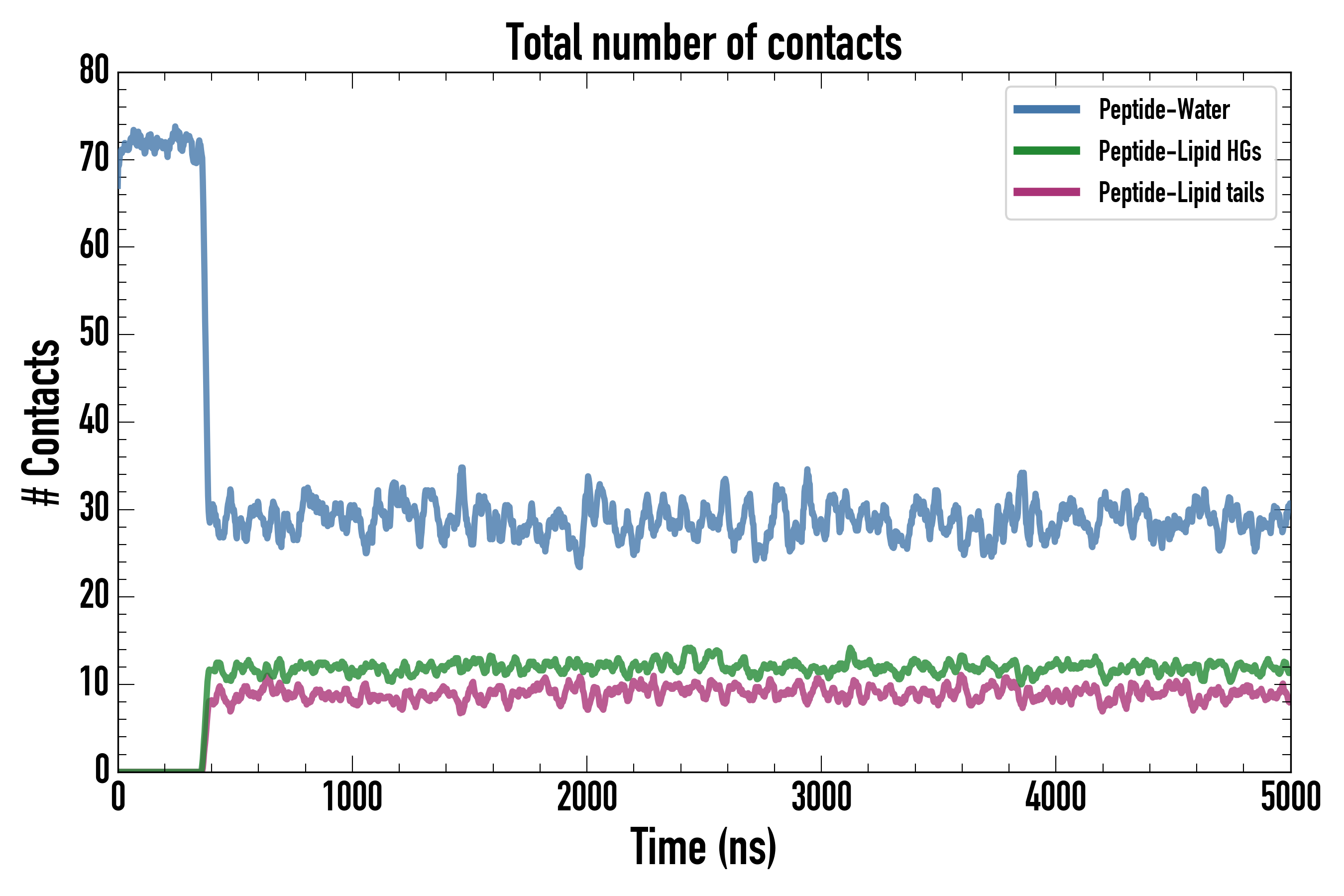 Number of contacts between each residue of the peptide backbone and the different lipid types, averaged over the last microsecond and using a cut-off of 0.6 nm.