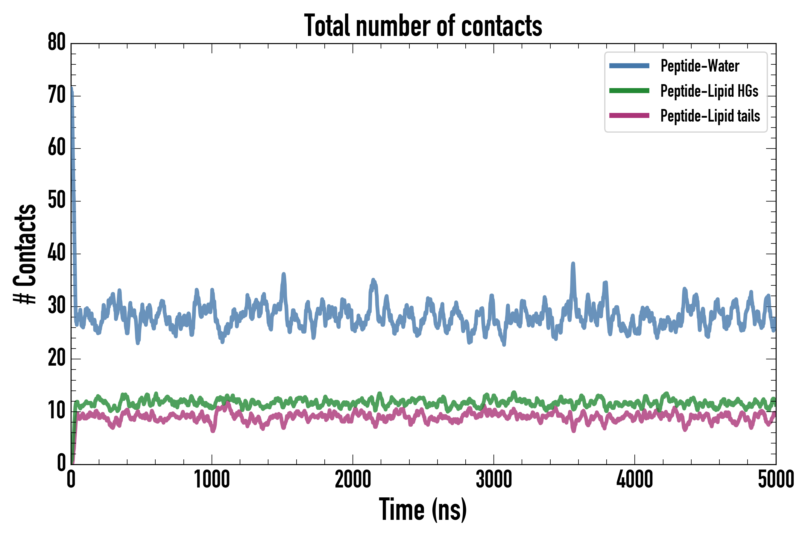 Number of contacts between each residue of the peptide backbone and the different lipid types, averaged over the last microsecond and using a cut-off of 0.6 nm.