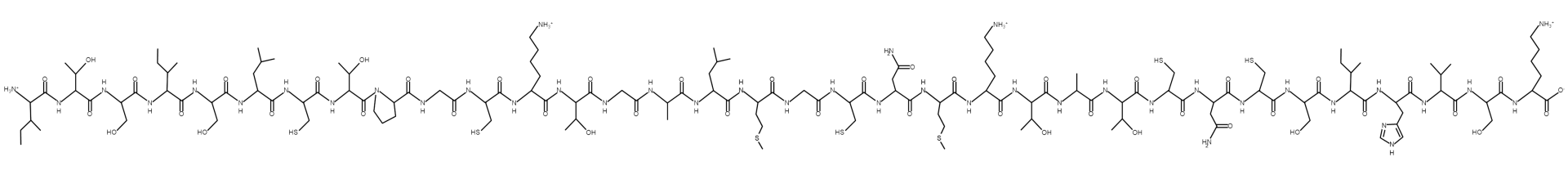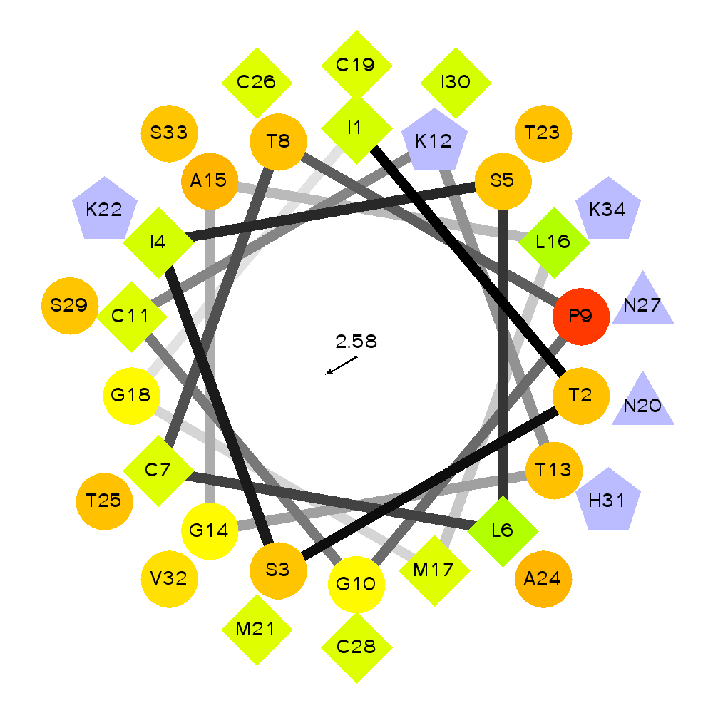 By amino acid: Basic: 4 Acidic: 0 Hydrophobic: 14 Polar: 16 Electrostatic Dipolar Moment (e nm): 4.28