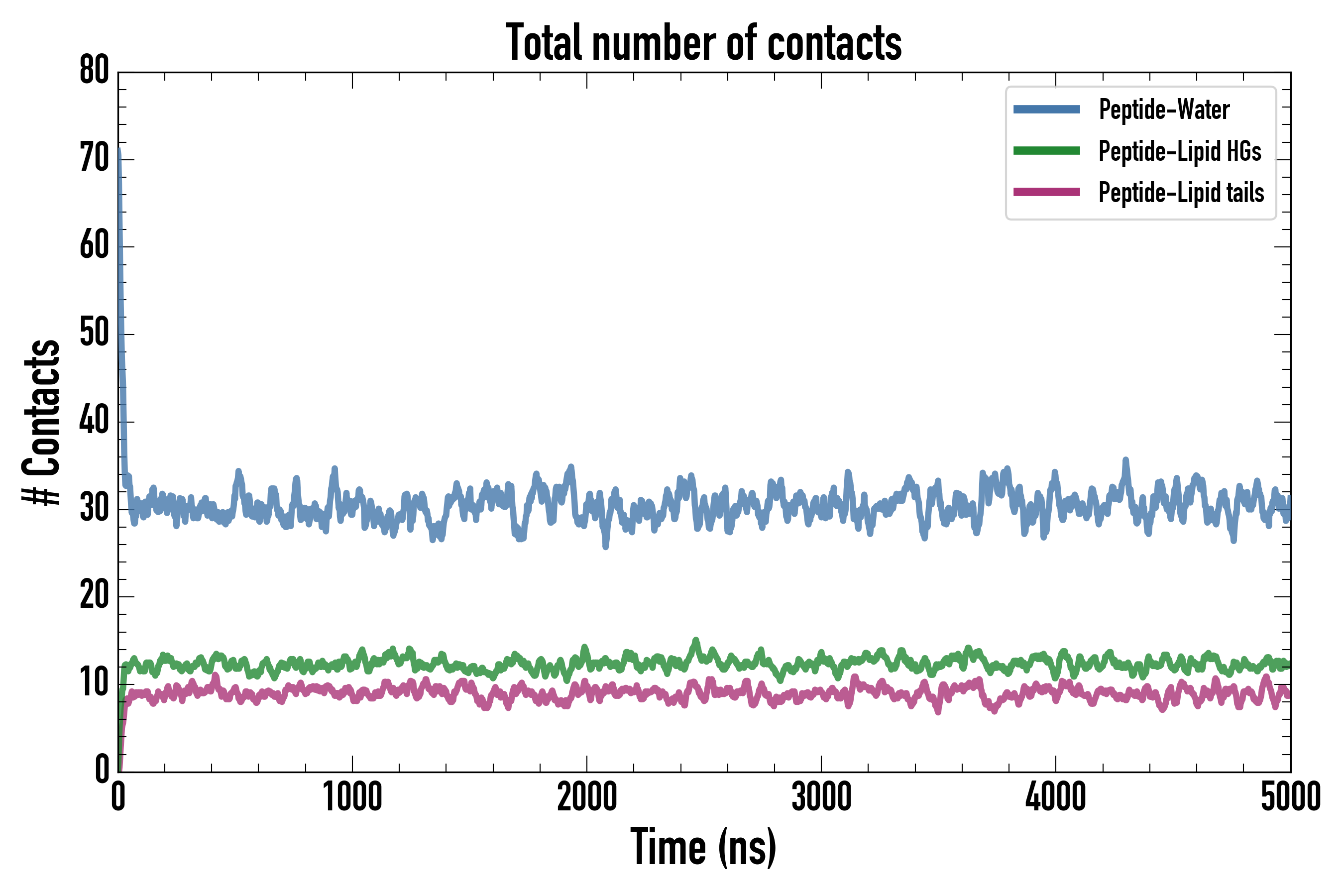 Number of contacts between each residue of the peptide backbone and the different lipid types, averaged over the last microsecond and using a cut-off of 0.6 nm.