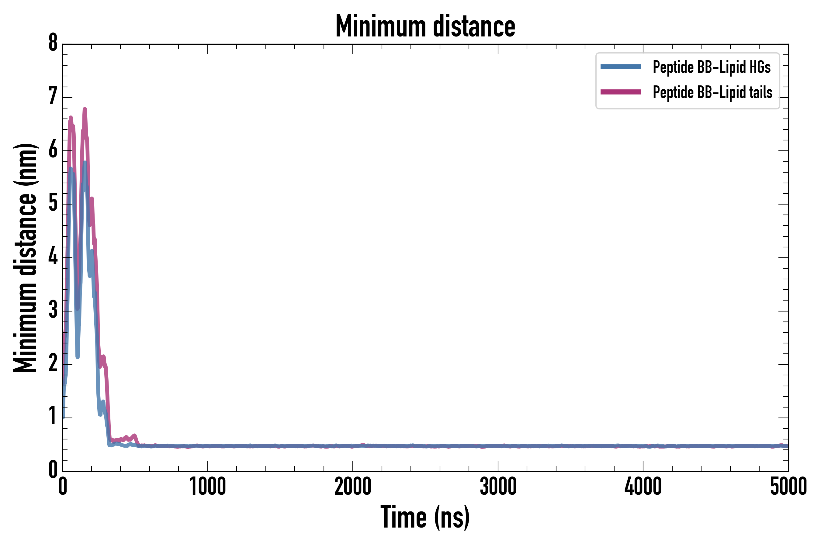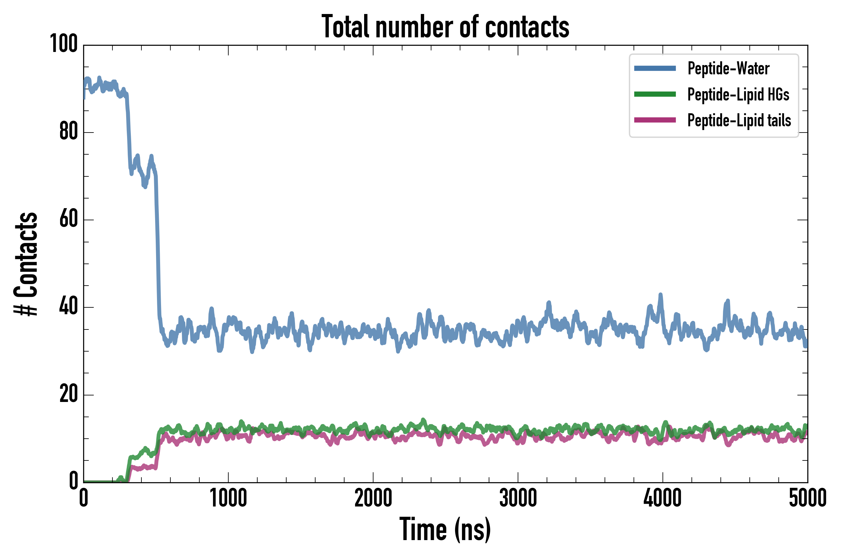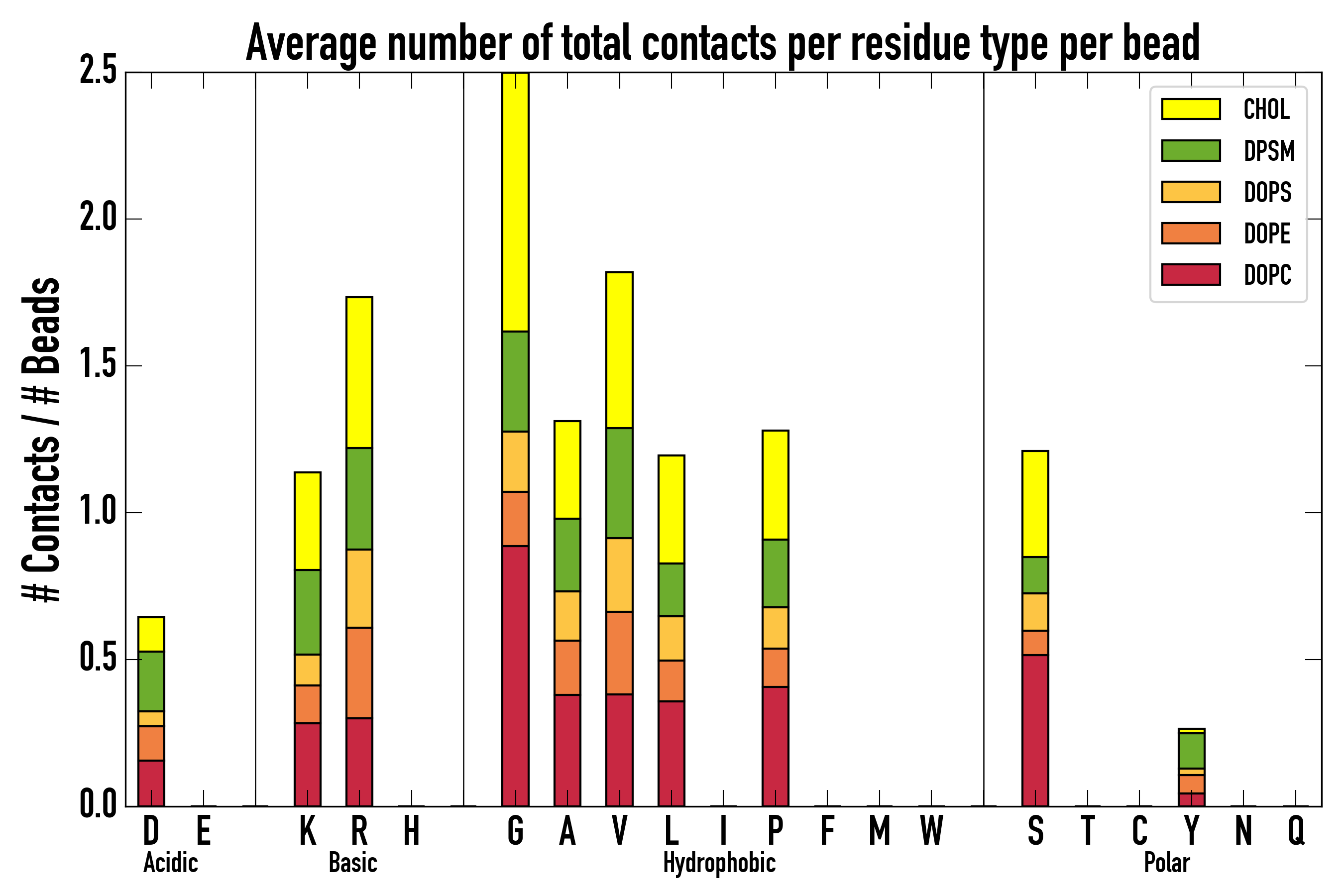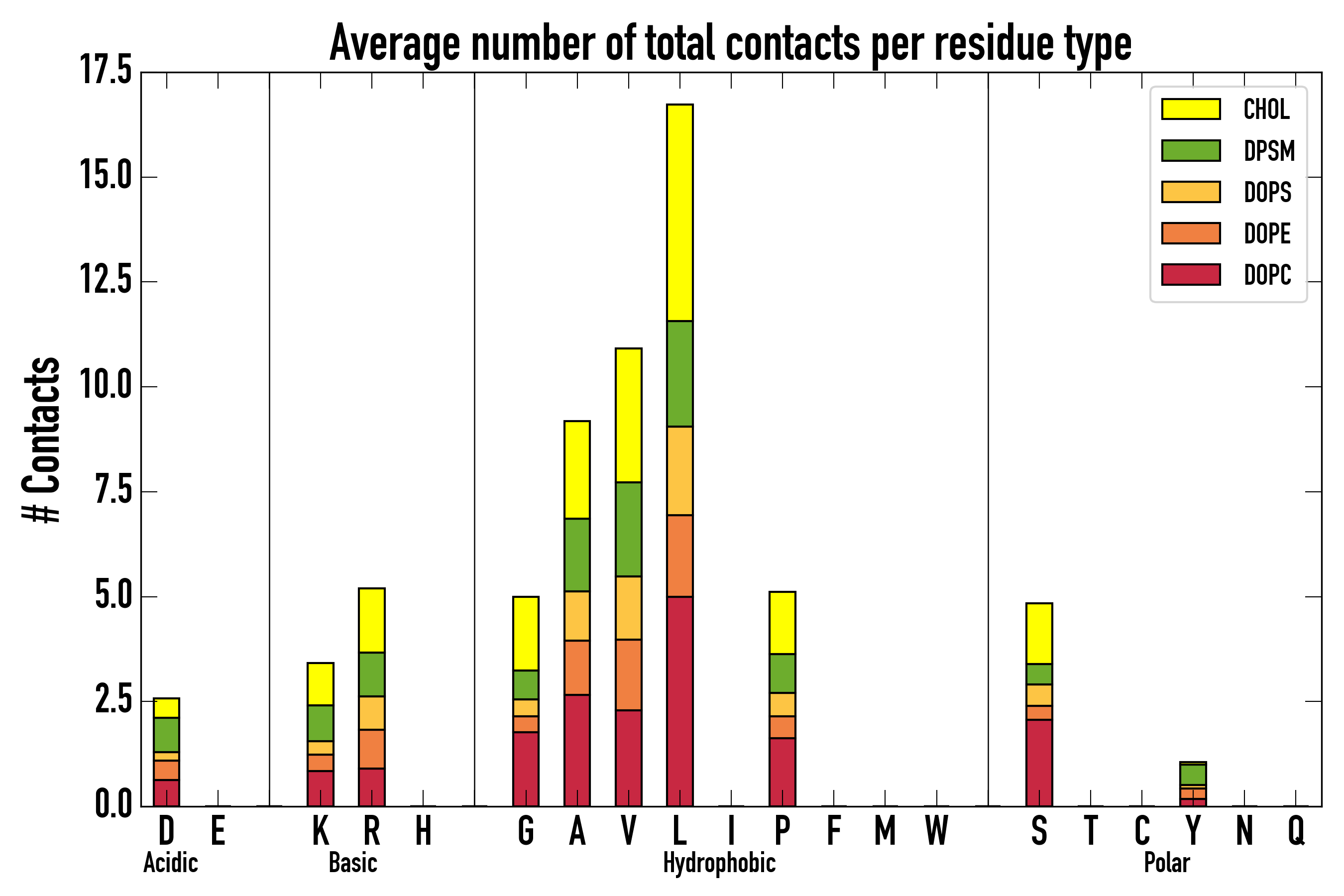 Number of contacts between each residue of the peptide backbone and the different lipid types, averaged over the last microsecond and using a cut-off of 0.6 nm.