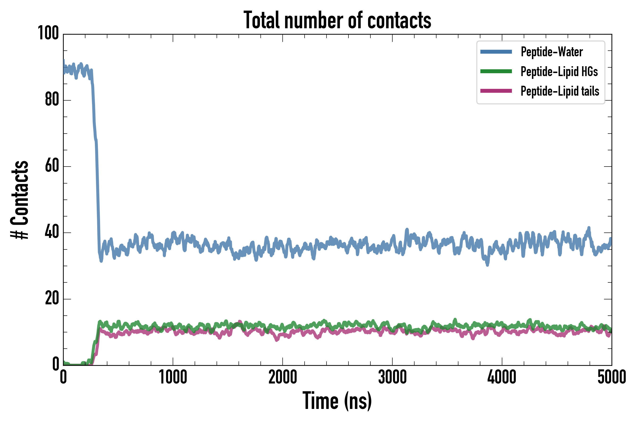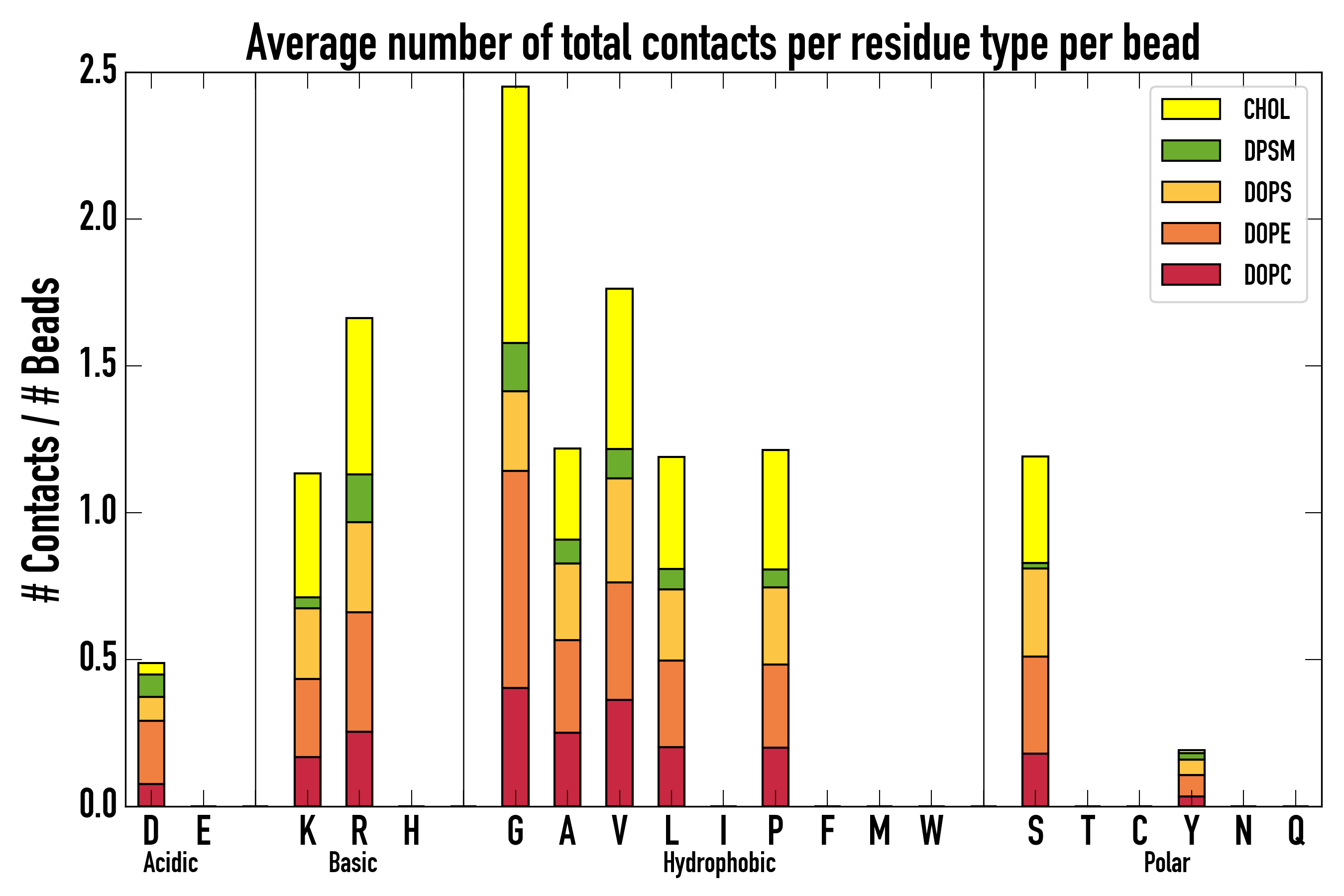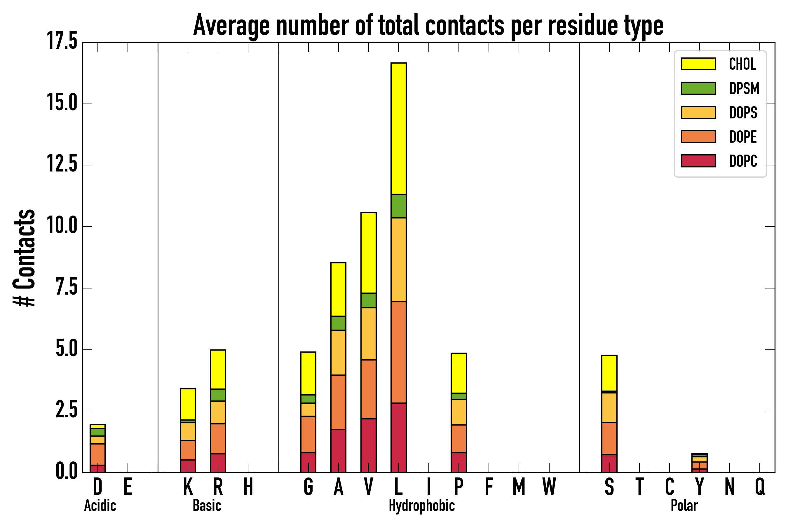 Number of contacts between each residue of the peptide backbone and the different lipid types, averaged over the last microsecond and using a cut-off of 0.6 nm.