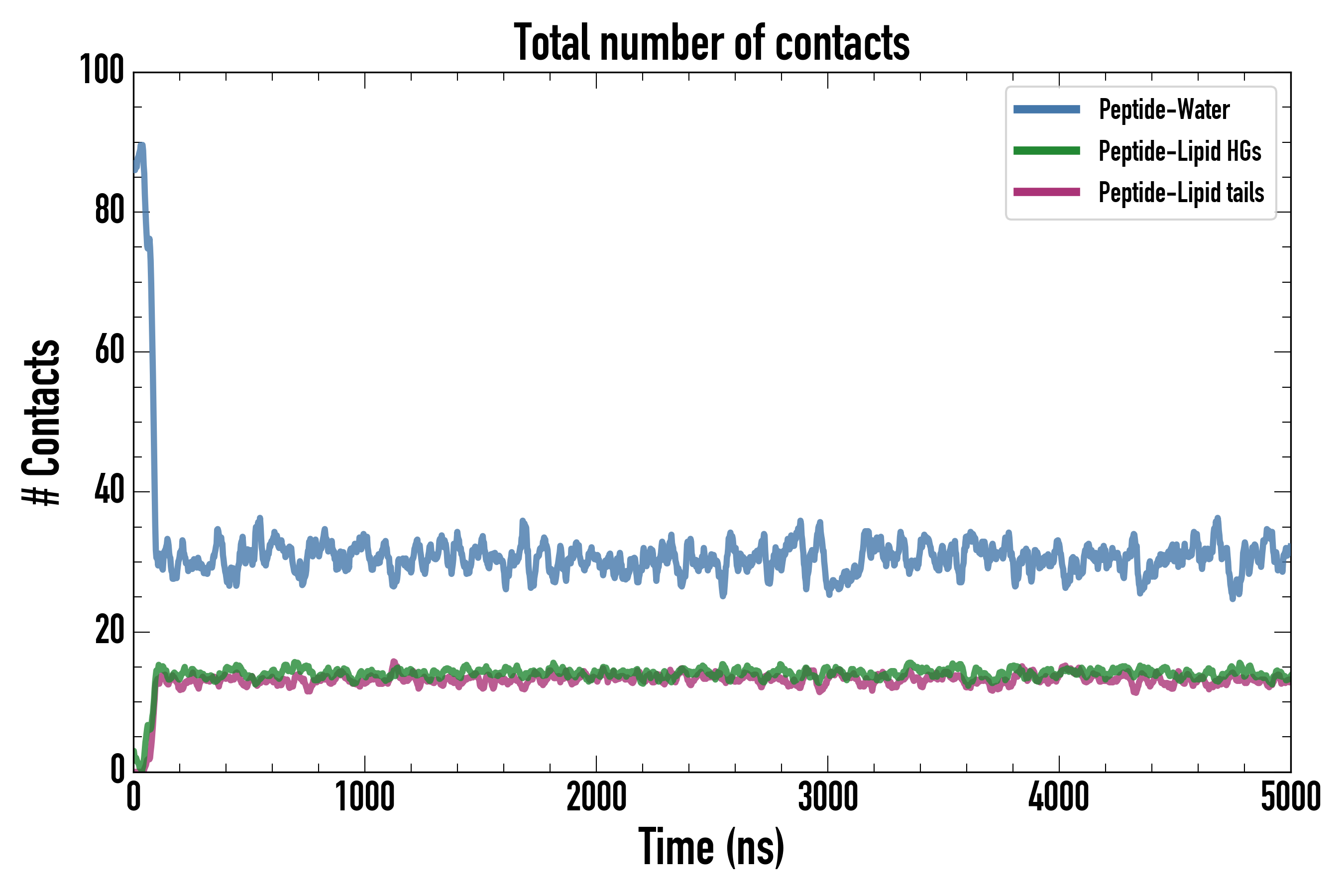 Number of contacts between each residue of the peptide backbone and the different lipid types, averaged over the last microsecond and using a cut-off of 0.6 nm.