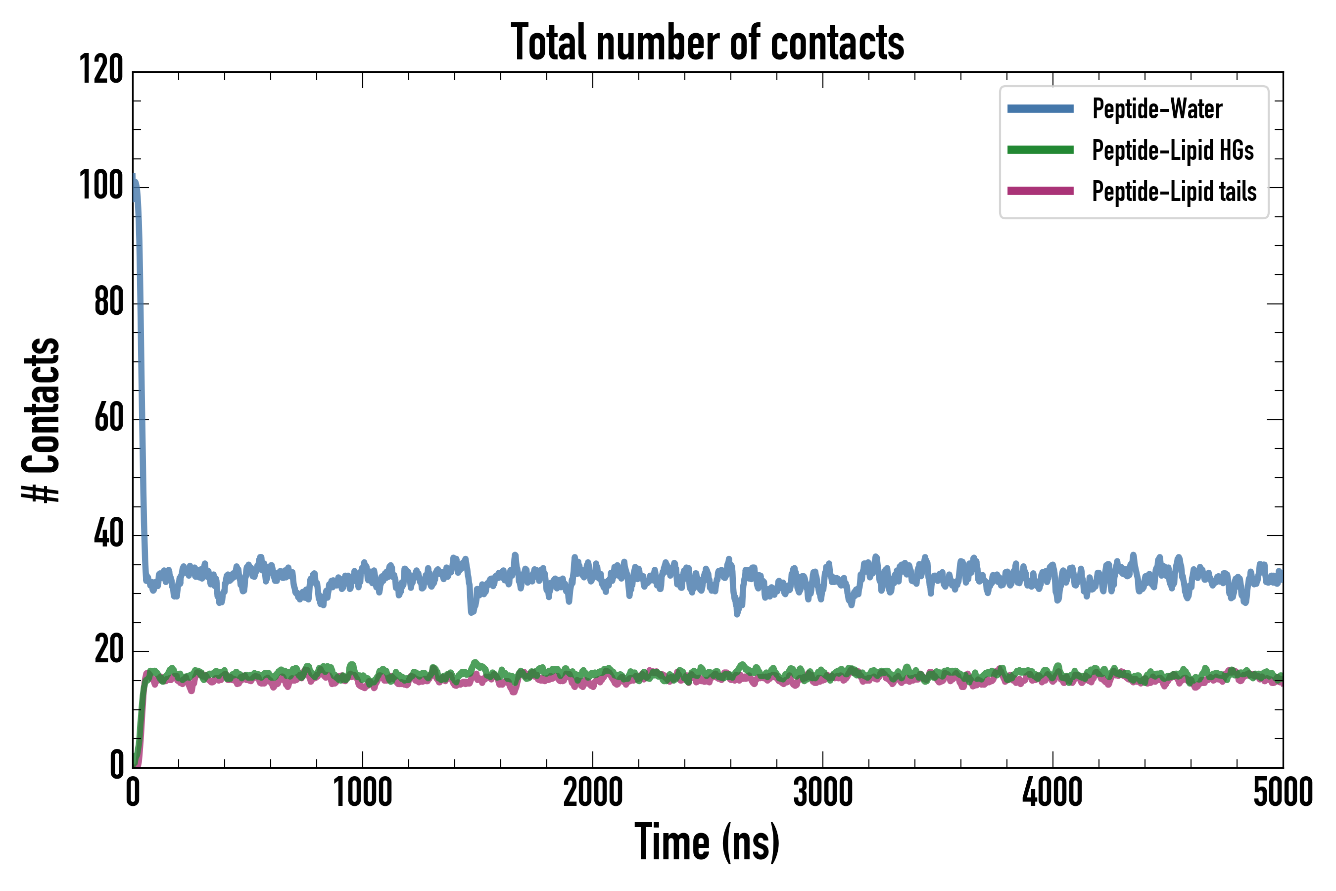 Number of contacts between each residue of the peptide backbone and the different lipid types, averaged over the last microsecond and using a cut-off of 0.6 nm.