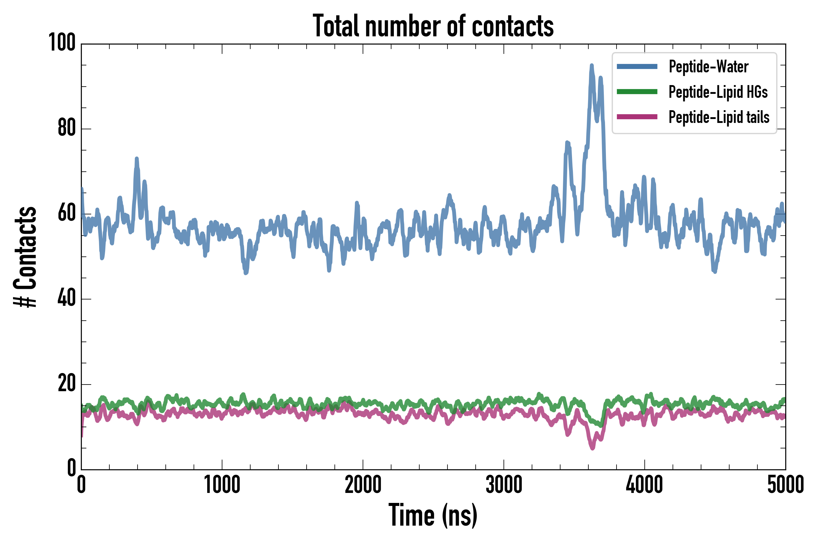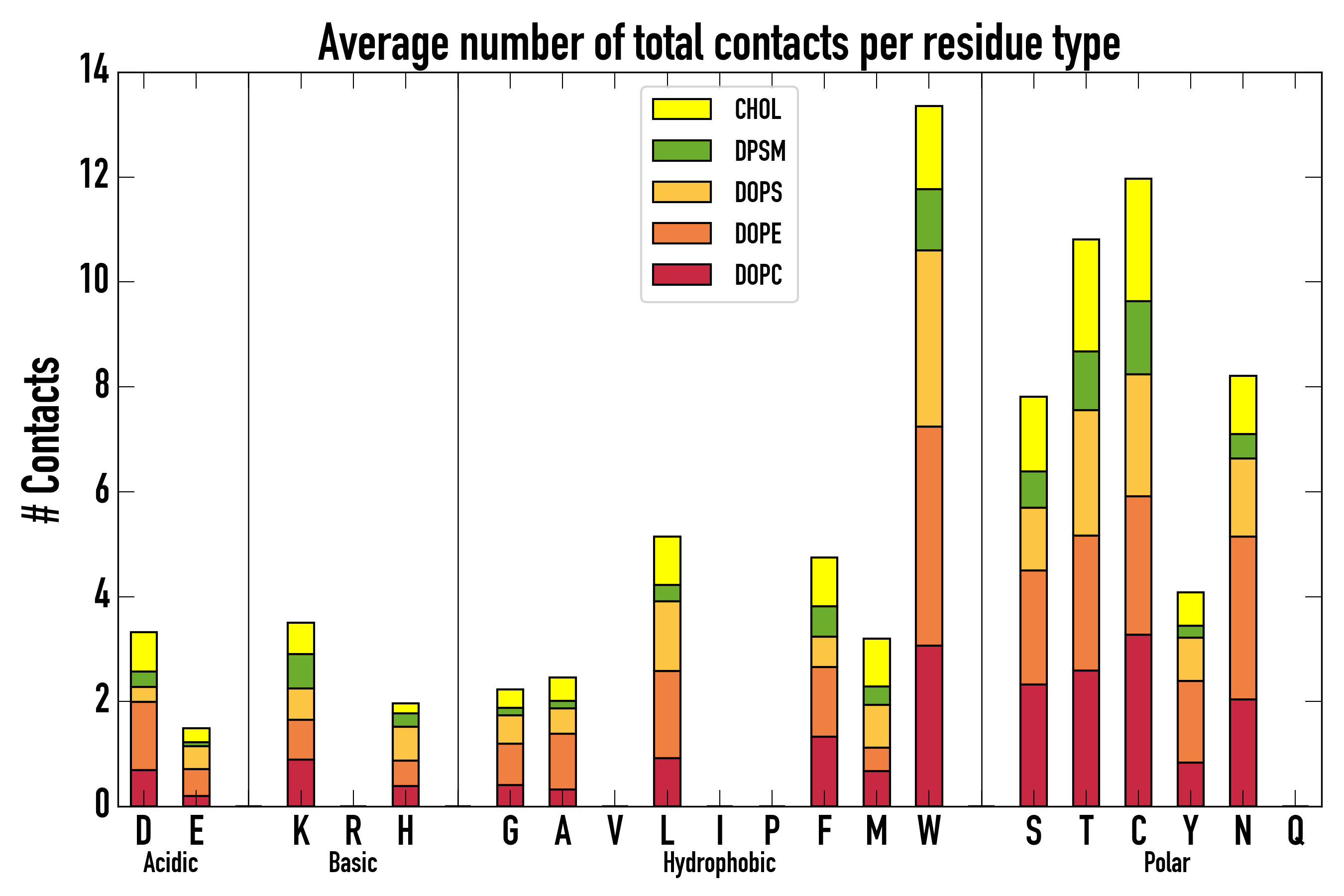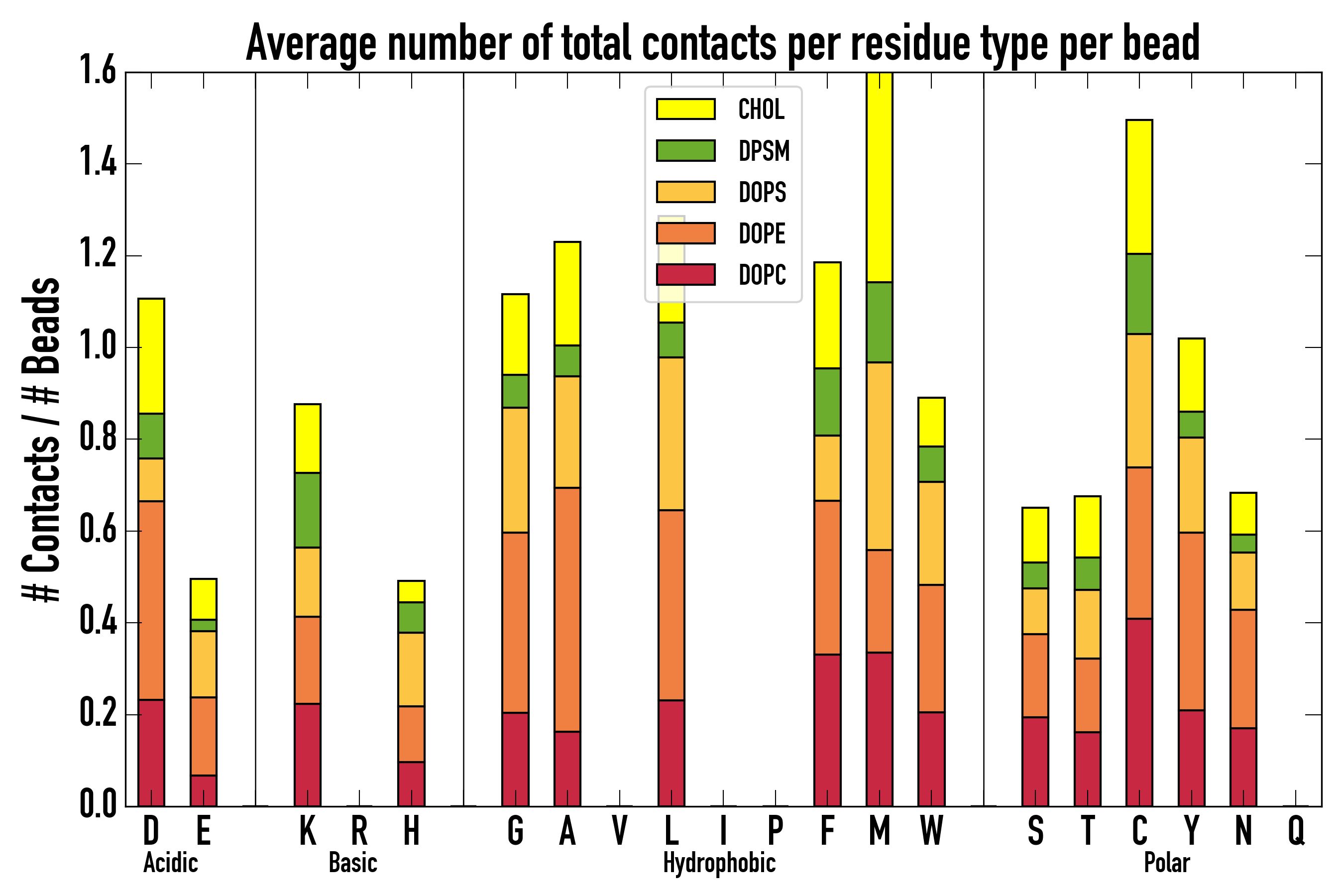 Number of contacts between each residue of the peptide backbone and the different lipid types, averaged over the last microsecond and using a cut-off of 0.6 nm.