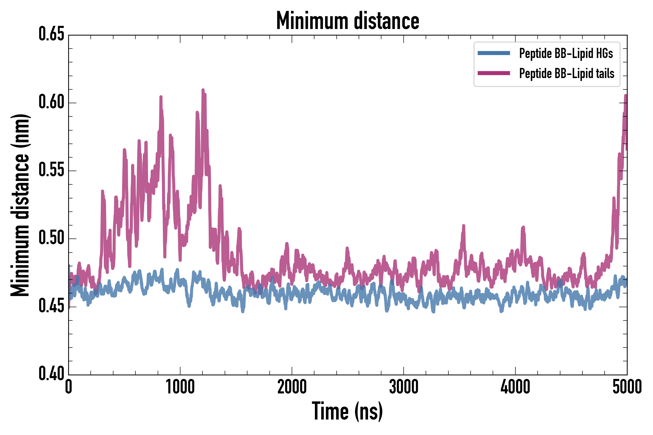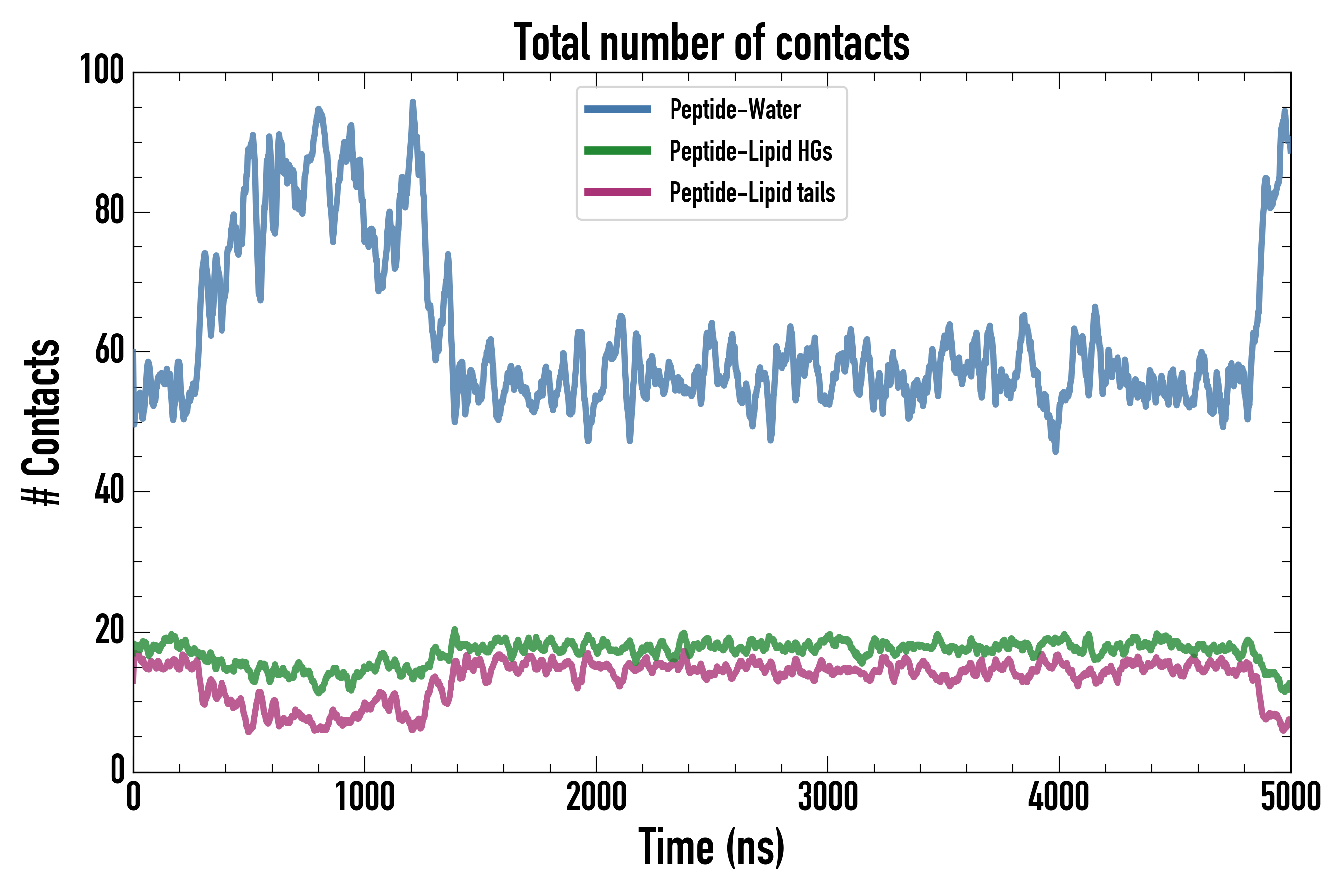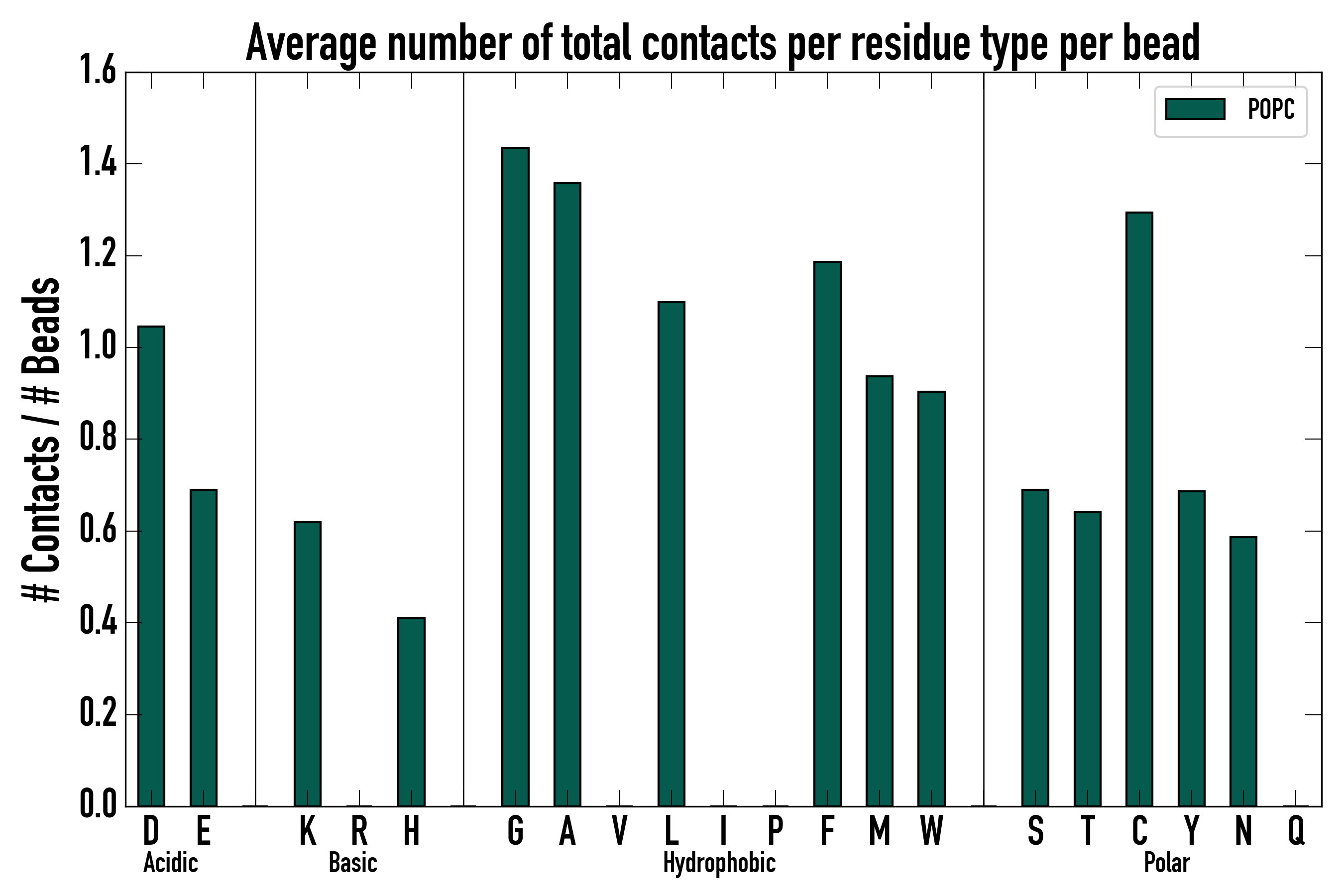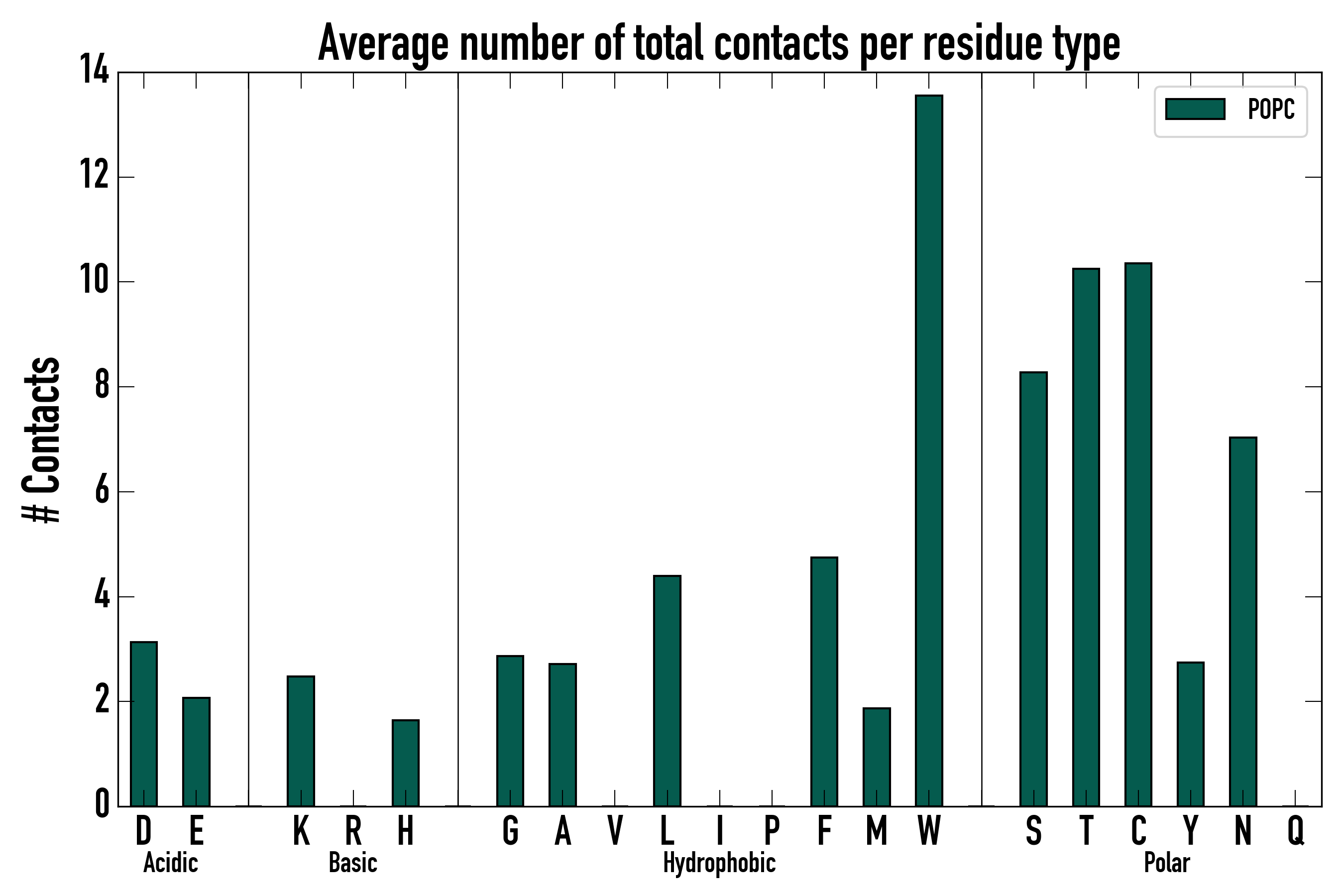 Number of contacts between each residue of the peptide backbone and the different lipid types, averaged over the last microsecond and using a cut-off of 0.6 nm.