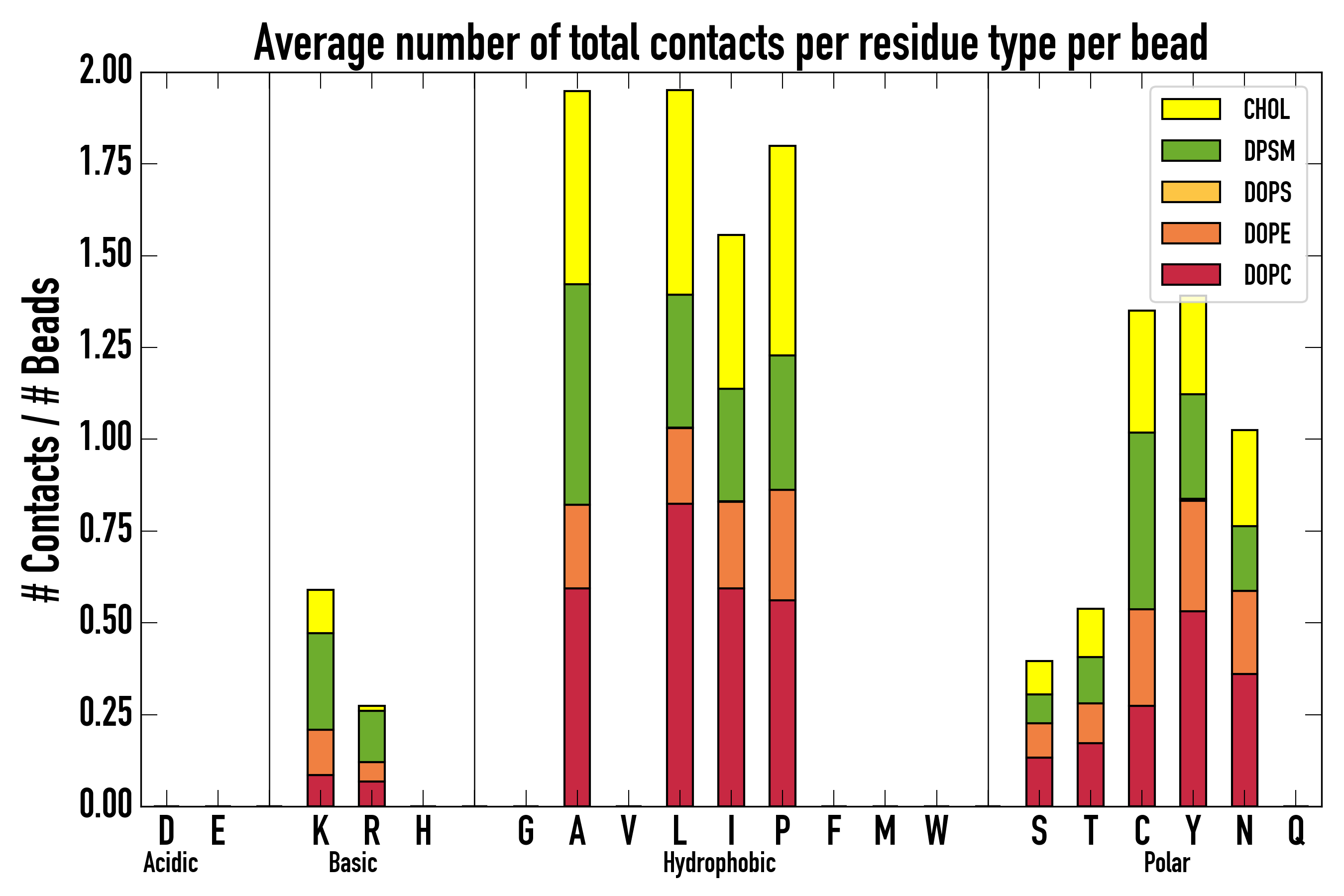 Number of contacts between each residue of the peptide backbone and the different lipid types, averaged over the last microsecond and using a cut-off of 0.6 nm.