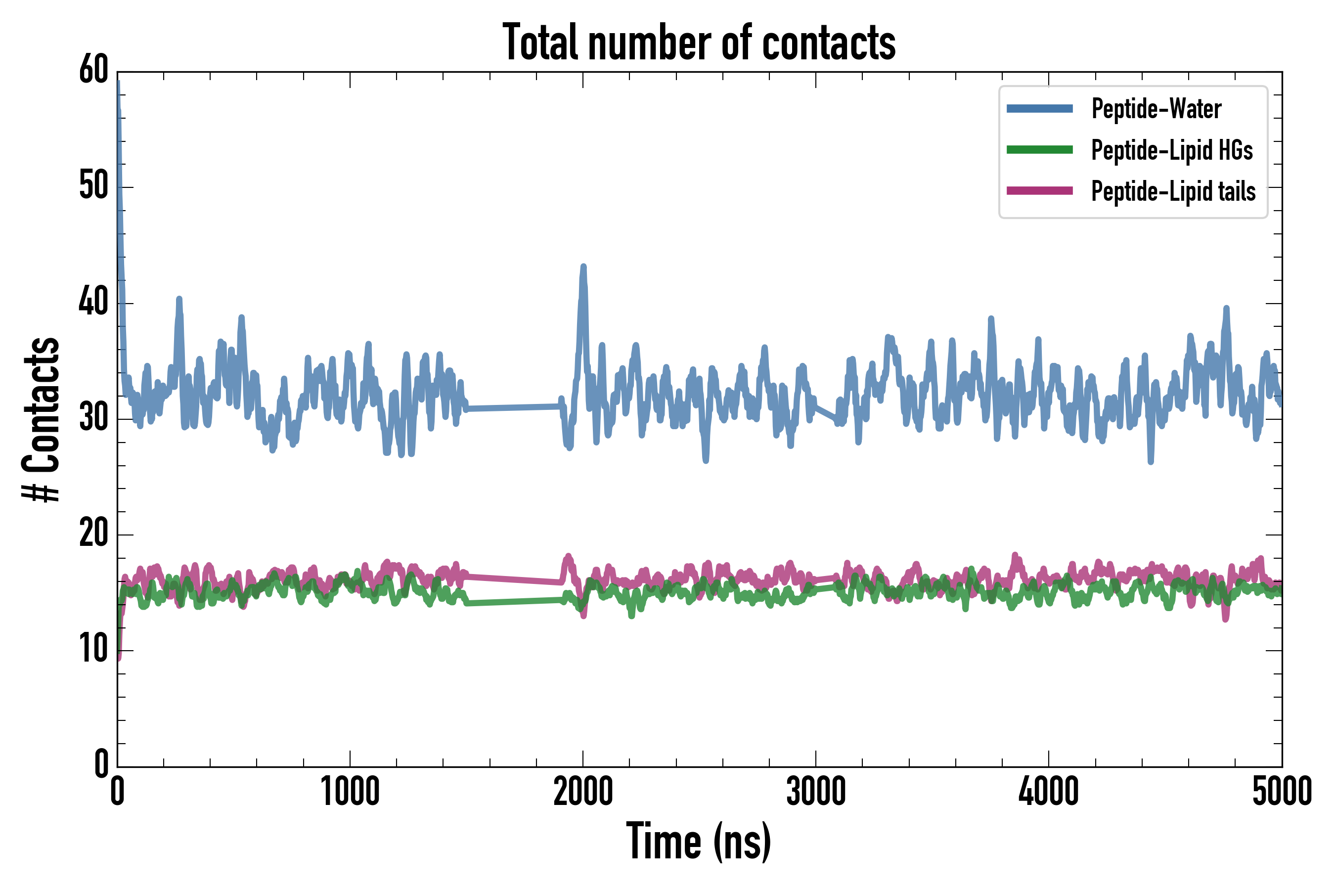 Number of contacts between each residue of the peptide backbone and the different lipid types, averaged over the last microsecond and using a cut-off of 0.6 nm.