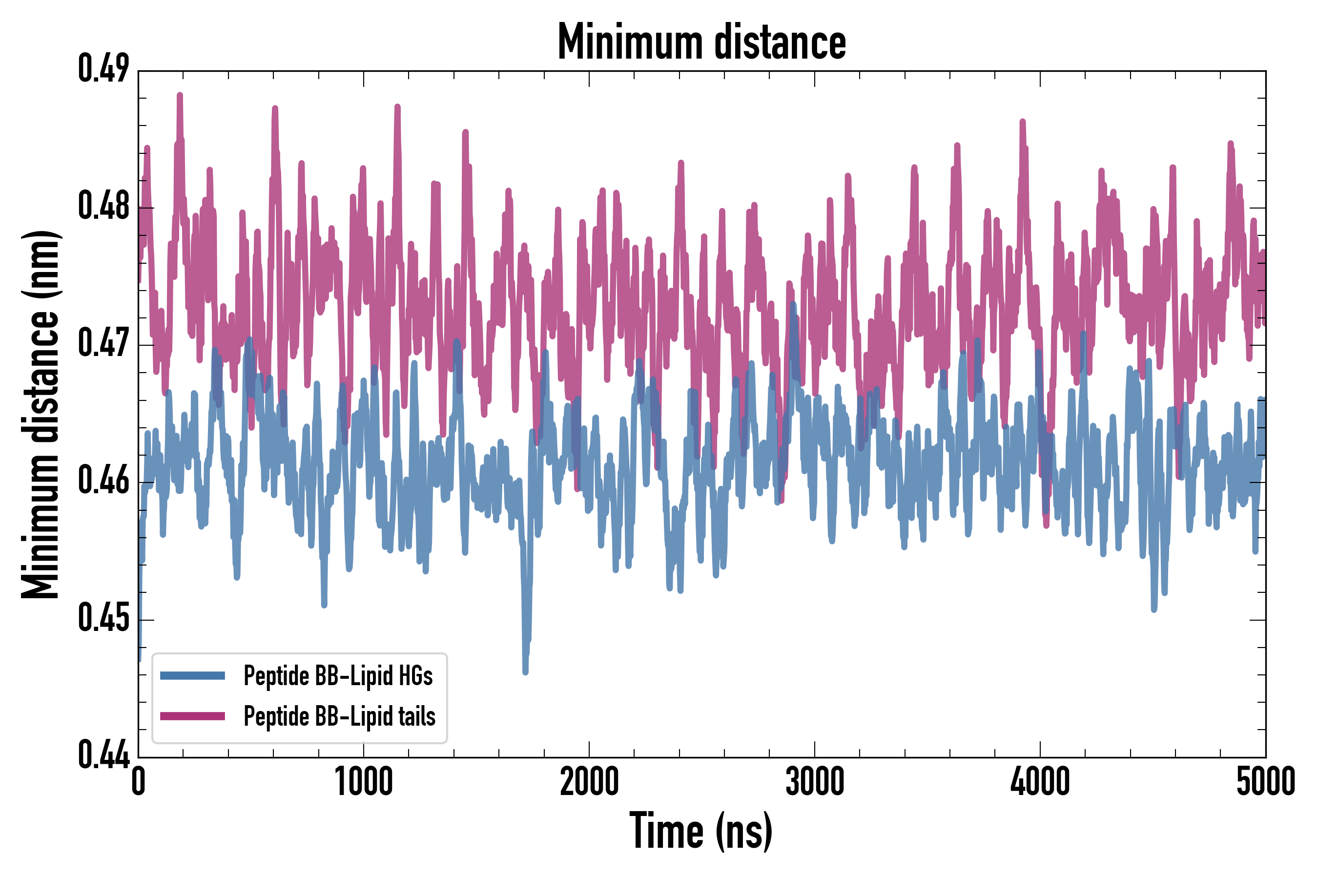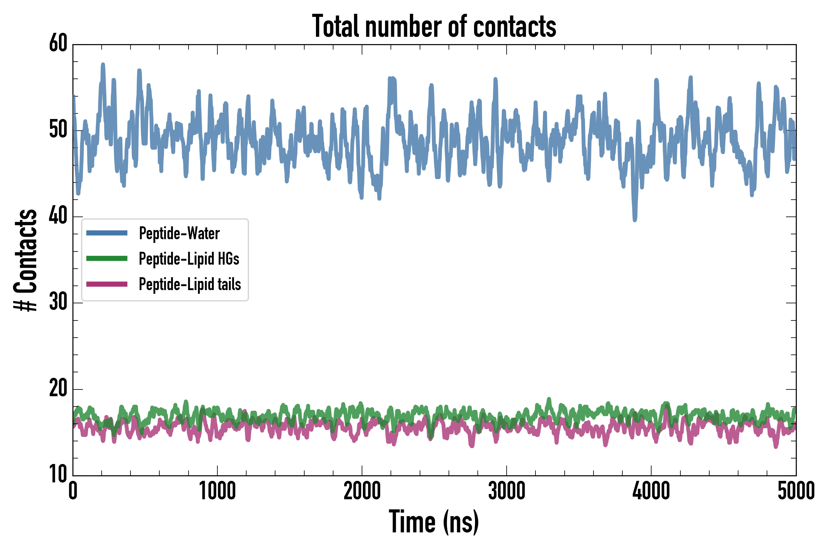 Number of contacts between each residue of the peptide backbone and the different lipid types, averaged over the last microsecond and using a cut-off of 0.6 nm.