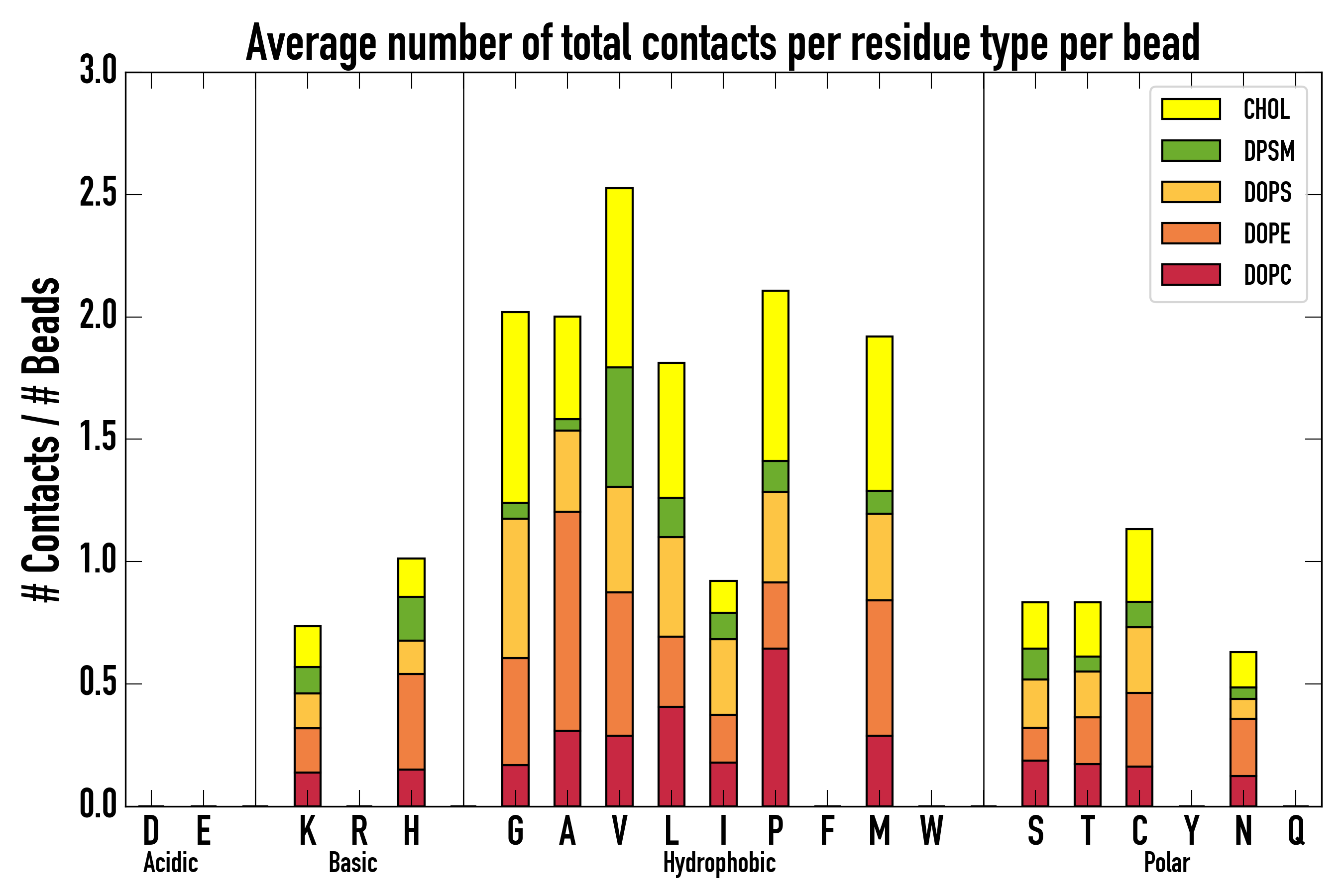 Number of contacts between each residue of the peptide backbone and the different lipid types, averaged over the last microsecond and using a cut-off of 0.6 nm.