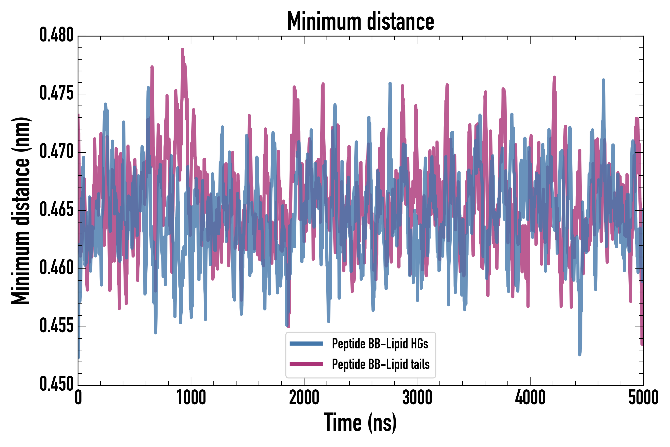 Number of contacts between each residue of the peptide backbone and the different lipid types, averaged over the last microsecond and using a cut-off of 0.6 nm.