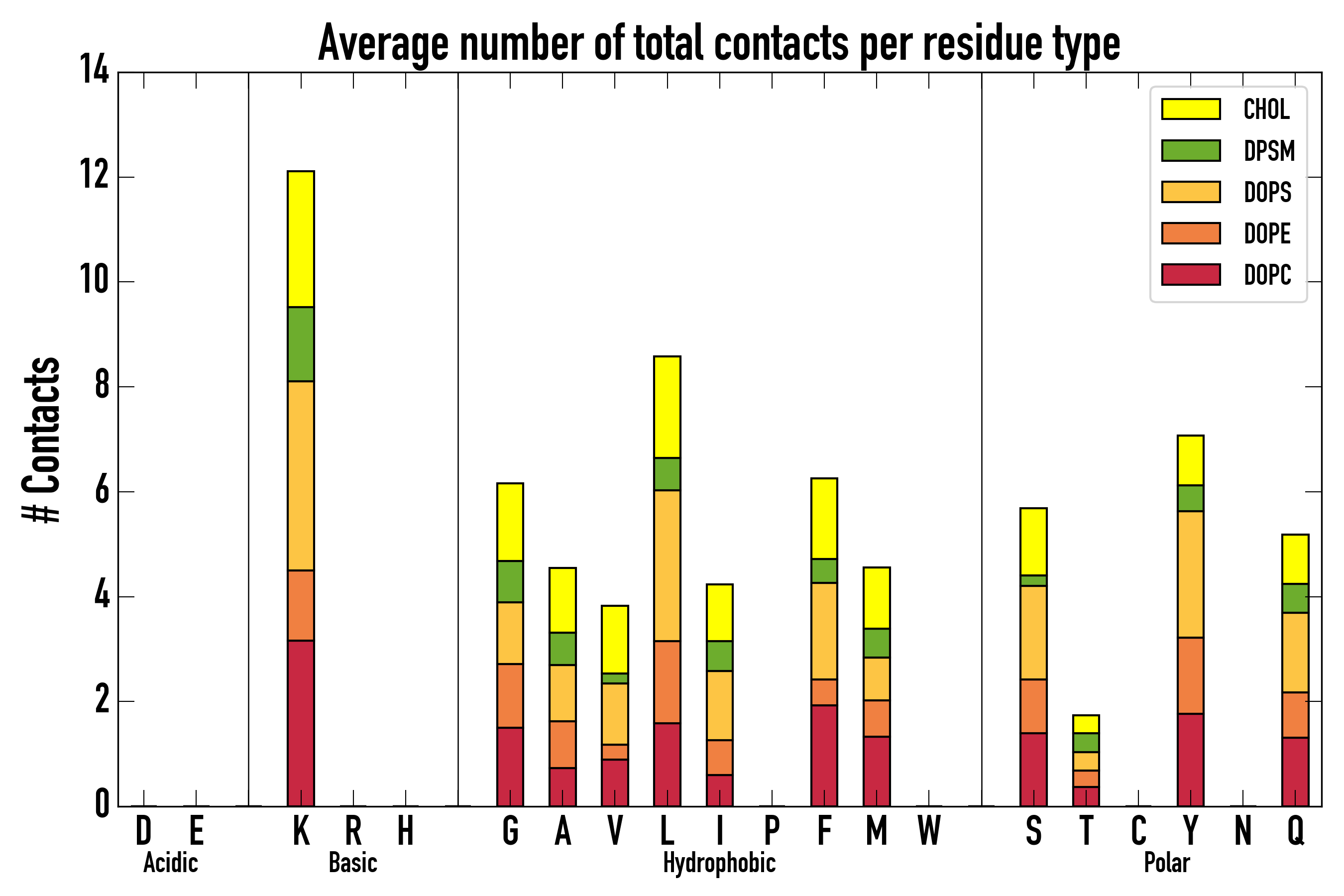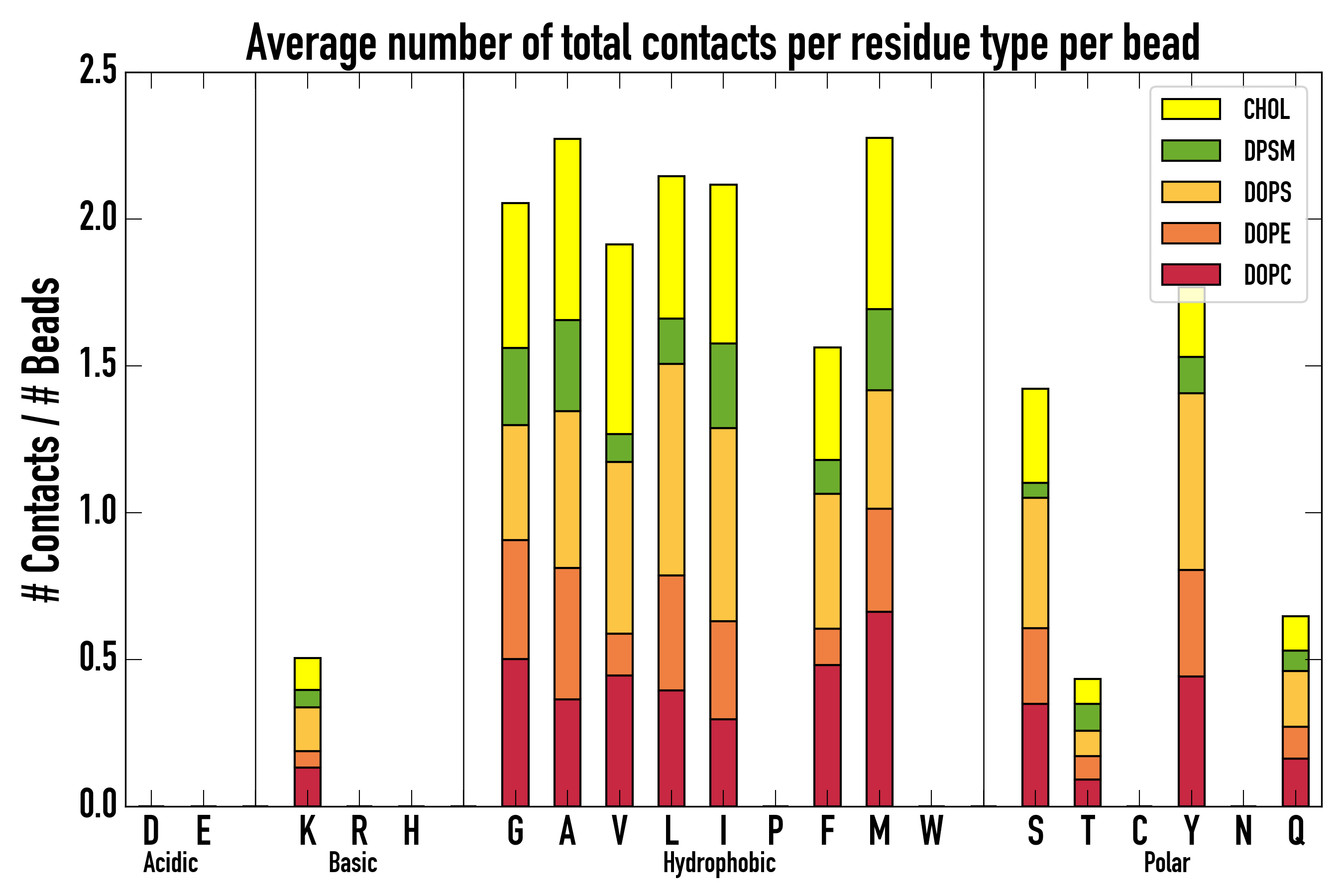 Number of contacts between each residue of the peptide backbone and the different lipid types, averaged over the last microsecond and using a cut-off of 0.6 nm.