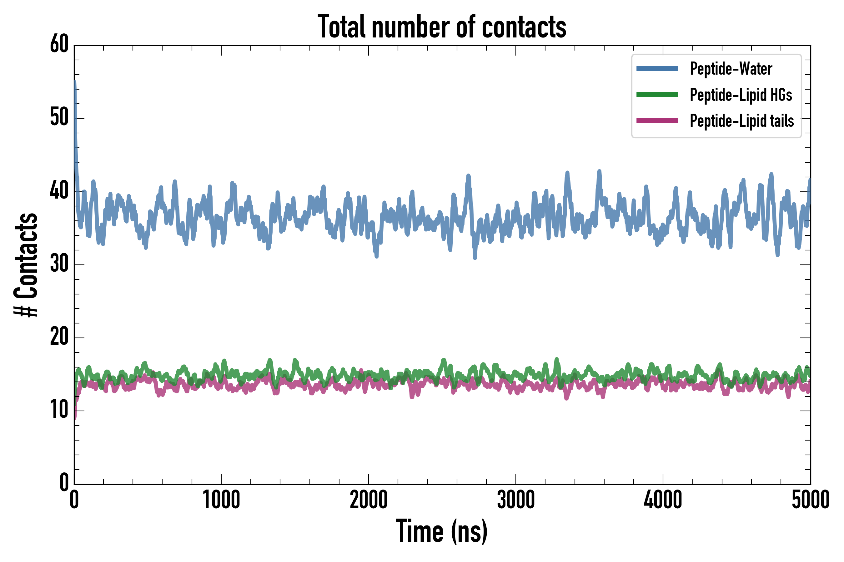 Number of contacts between each residue of the peptide backbone and the different lipid types, averaged over the last microsecond and using a cut-off of 0.6 nm.