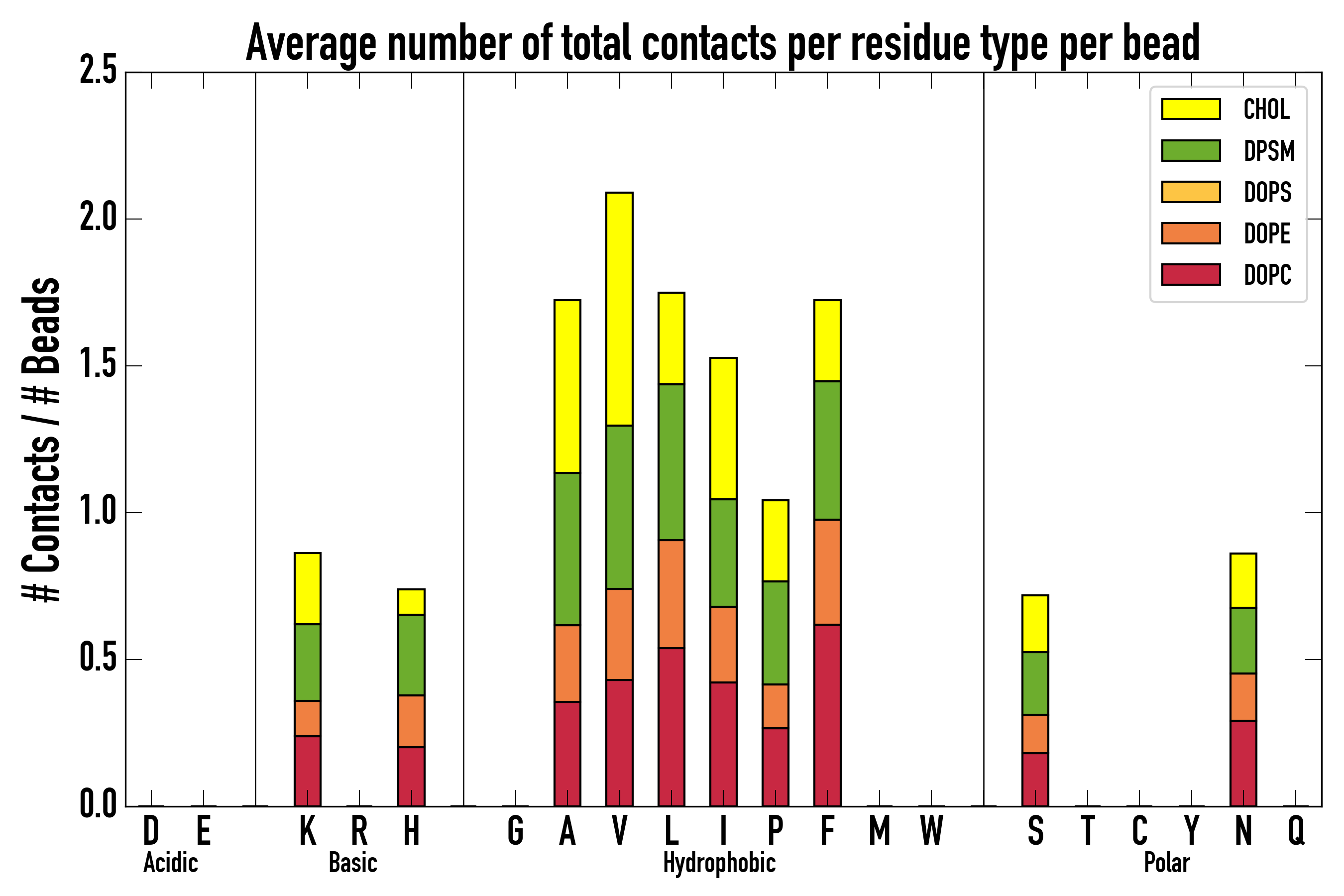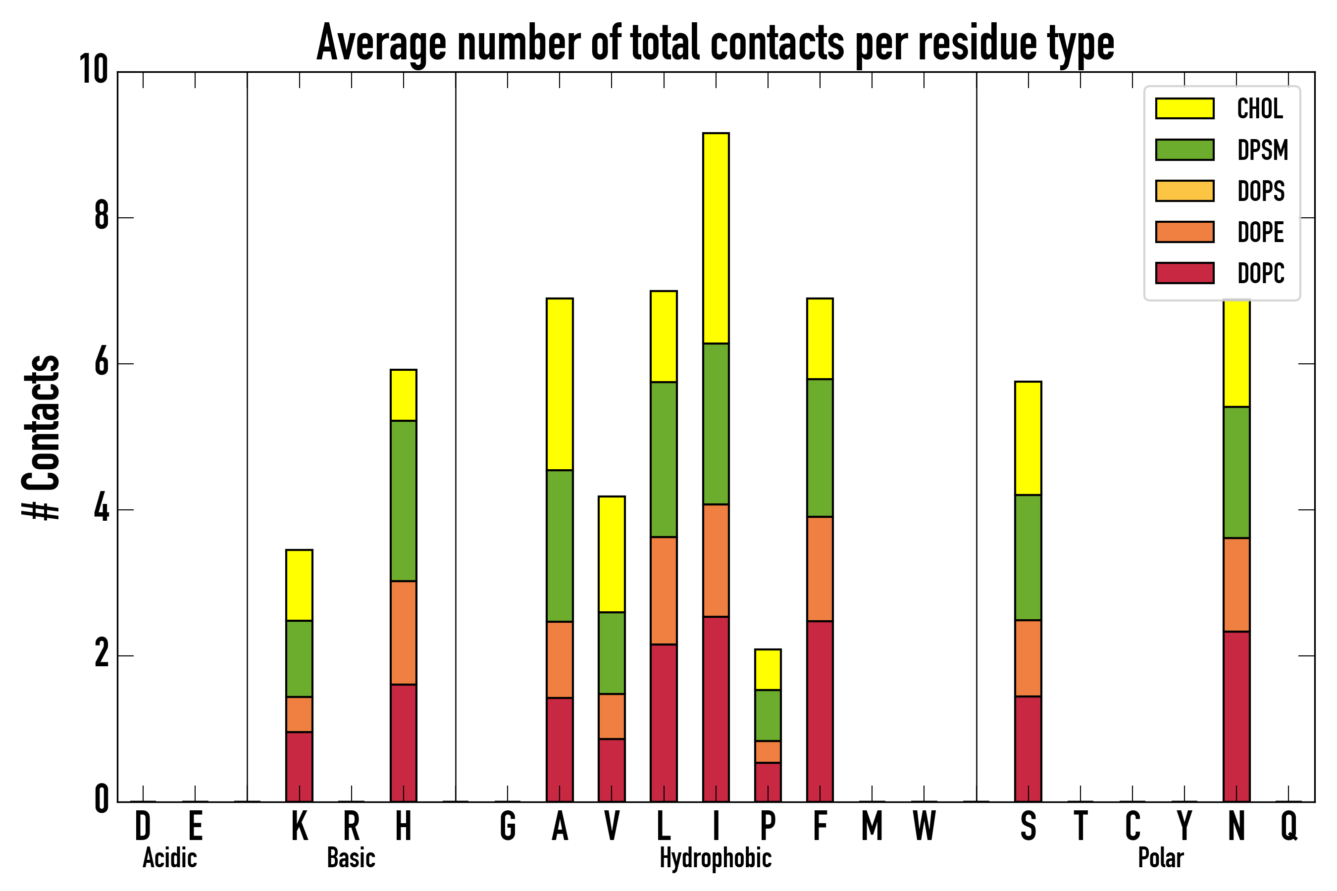 Number of contacts between each residue of the peptide backbone and the different lipid types, averaged over the last microsecond and using a cut-off of 0.6 nm.
