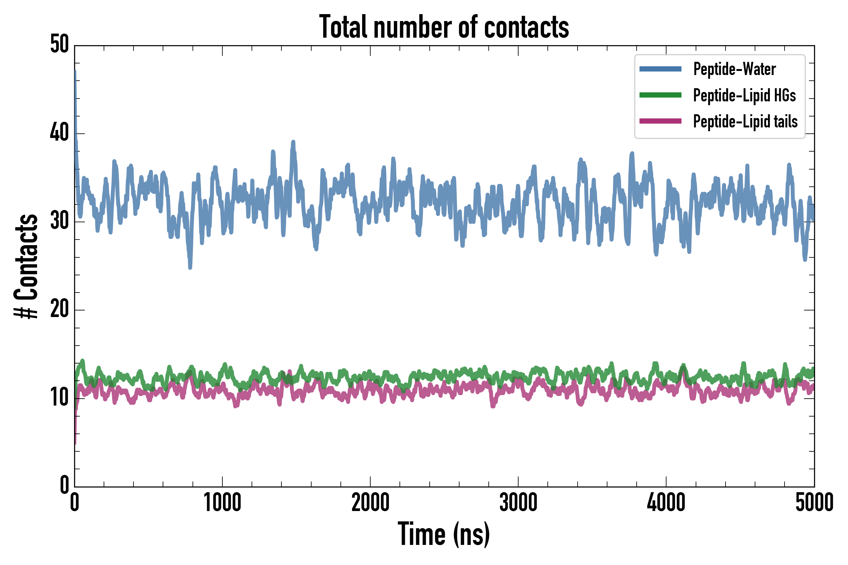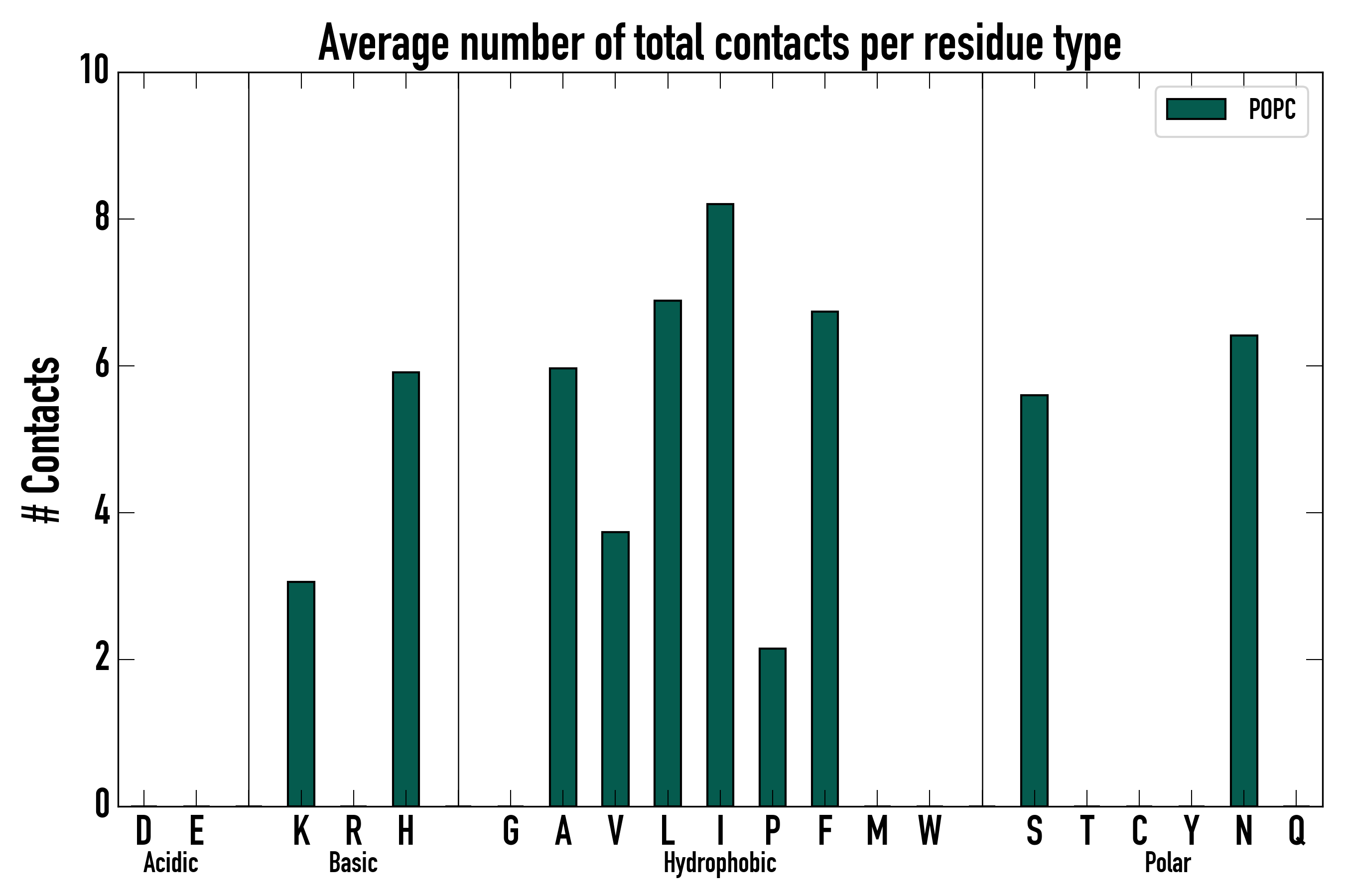 Number of contacts between each residue of the peptide backbone and the different lipid types, averaged over the last microsecond and using a cut-off of 0.6 nm.
