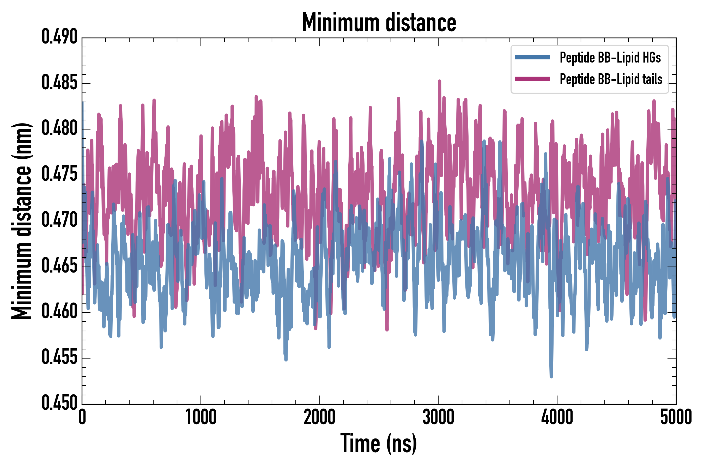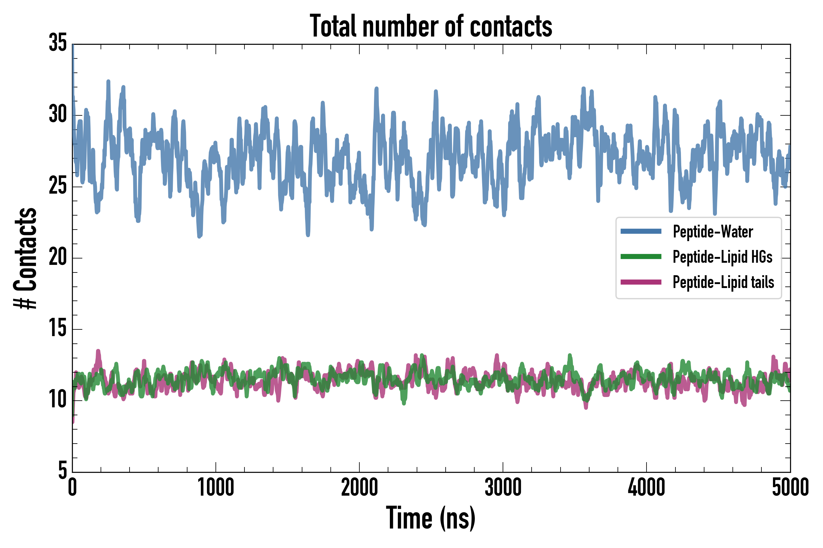 Number of contacts between each residue of the peptide backbone and the different lipid types, averaged over the last microsecond and using a cut-off of 0.6 nm.