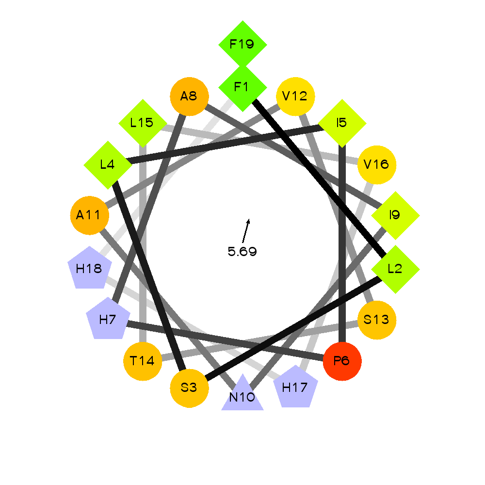 By amino acid: Basic: 3 Acidic: 0 Hydrophobic: 12 Polar: 4 Electrostatic Dipolar Moment (e nm): 2.95