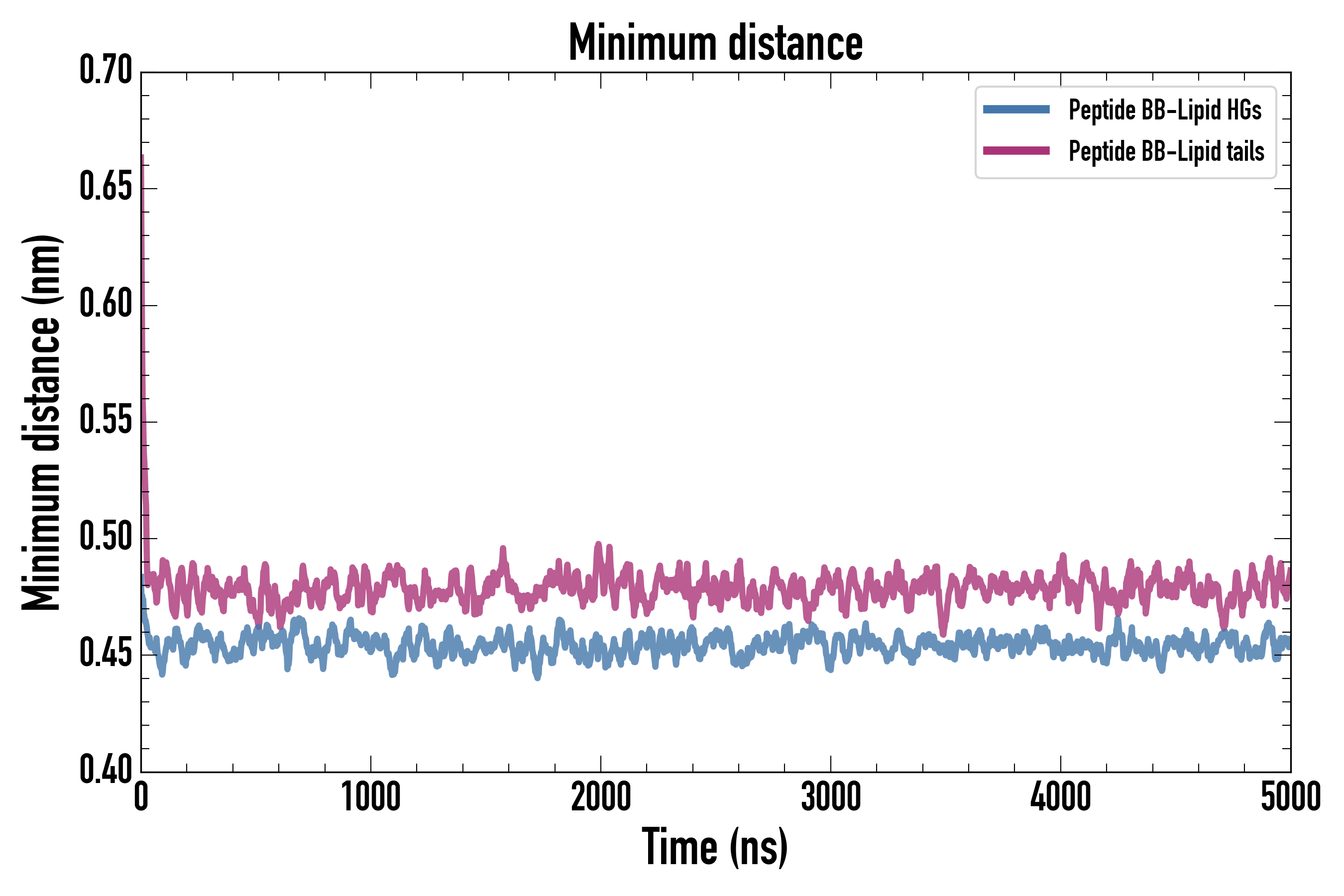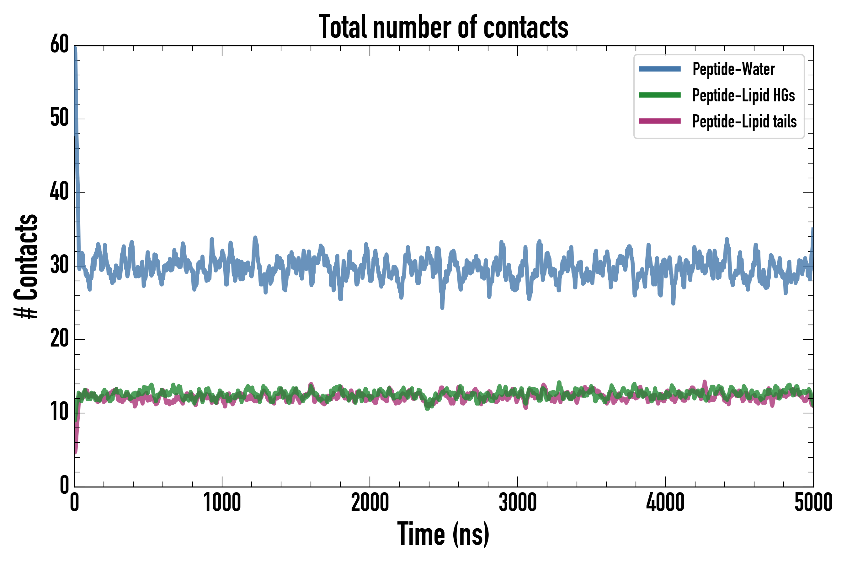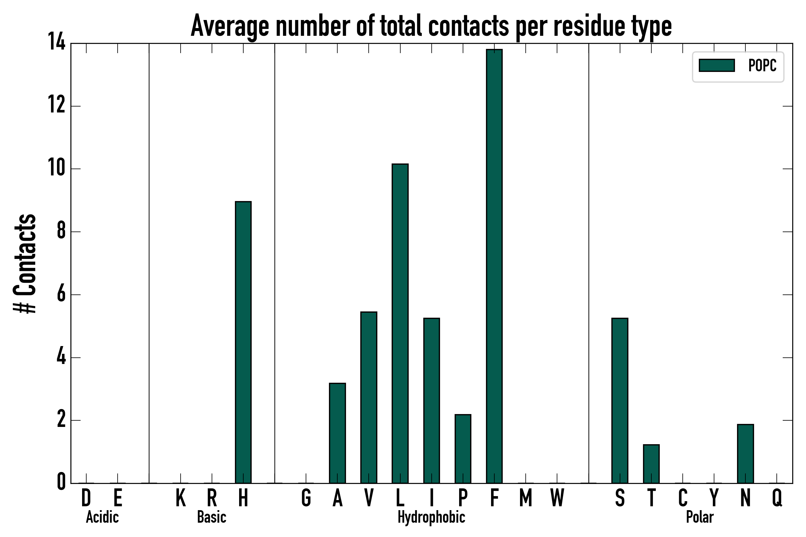 Number of contacts between each residue of the peptide backbone and the different lipid types, averaged over the last microsecond and using a cut-off of 0.6 nm.