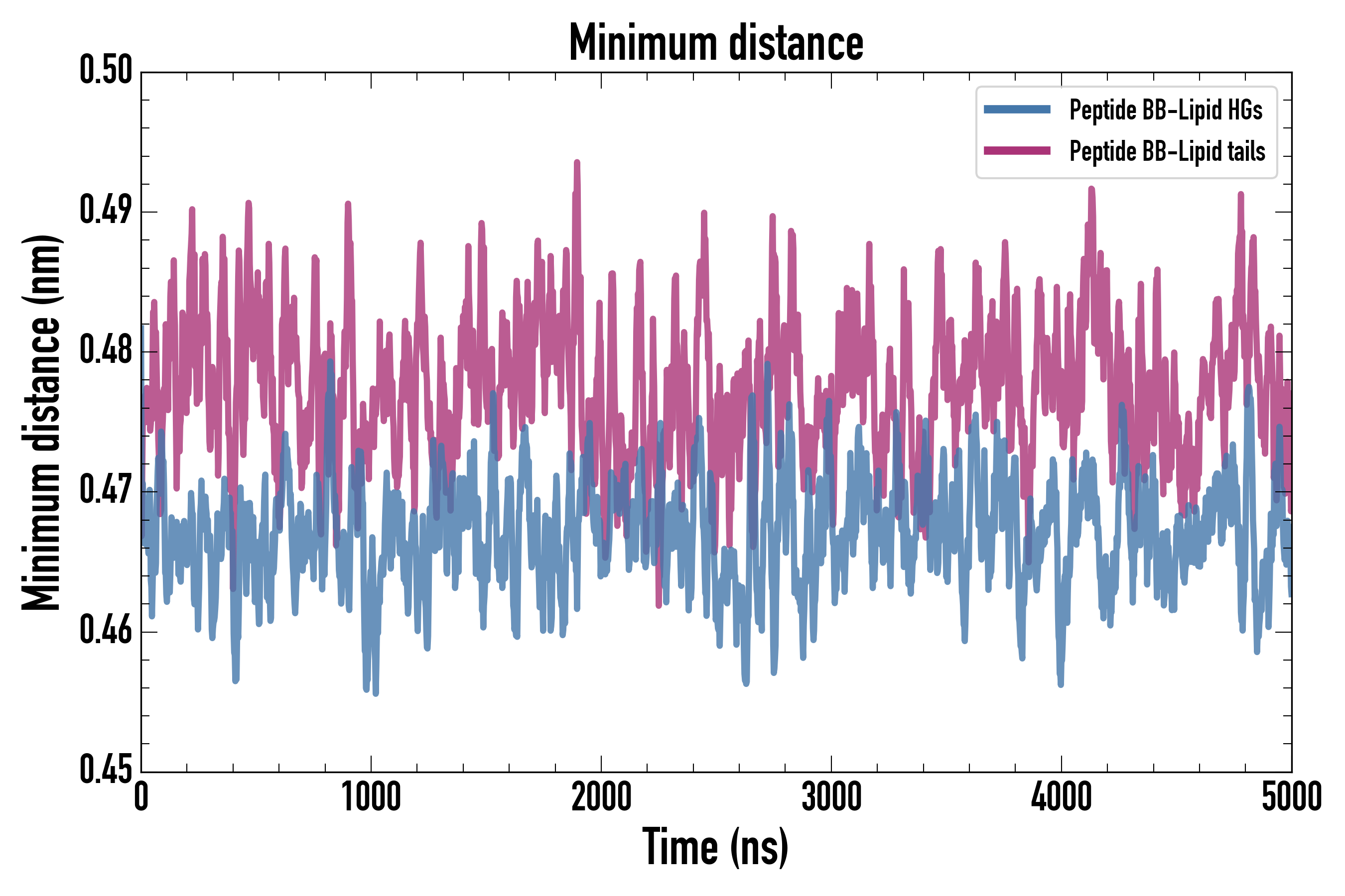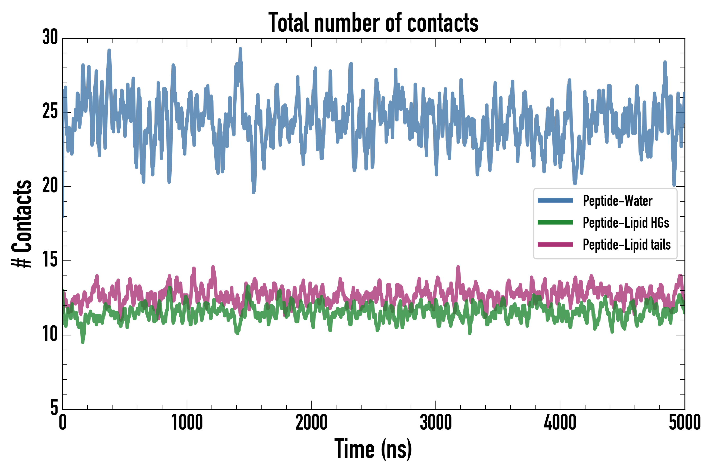 Number of contacts between each residue of the peptide backbone and the different lipid types, averaged over the last microsecond and using a cut-off of 0.6 nm.