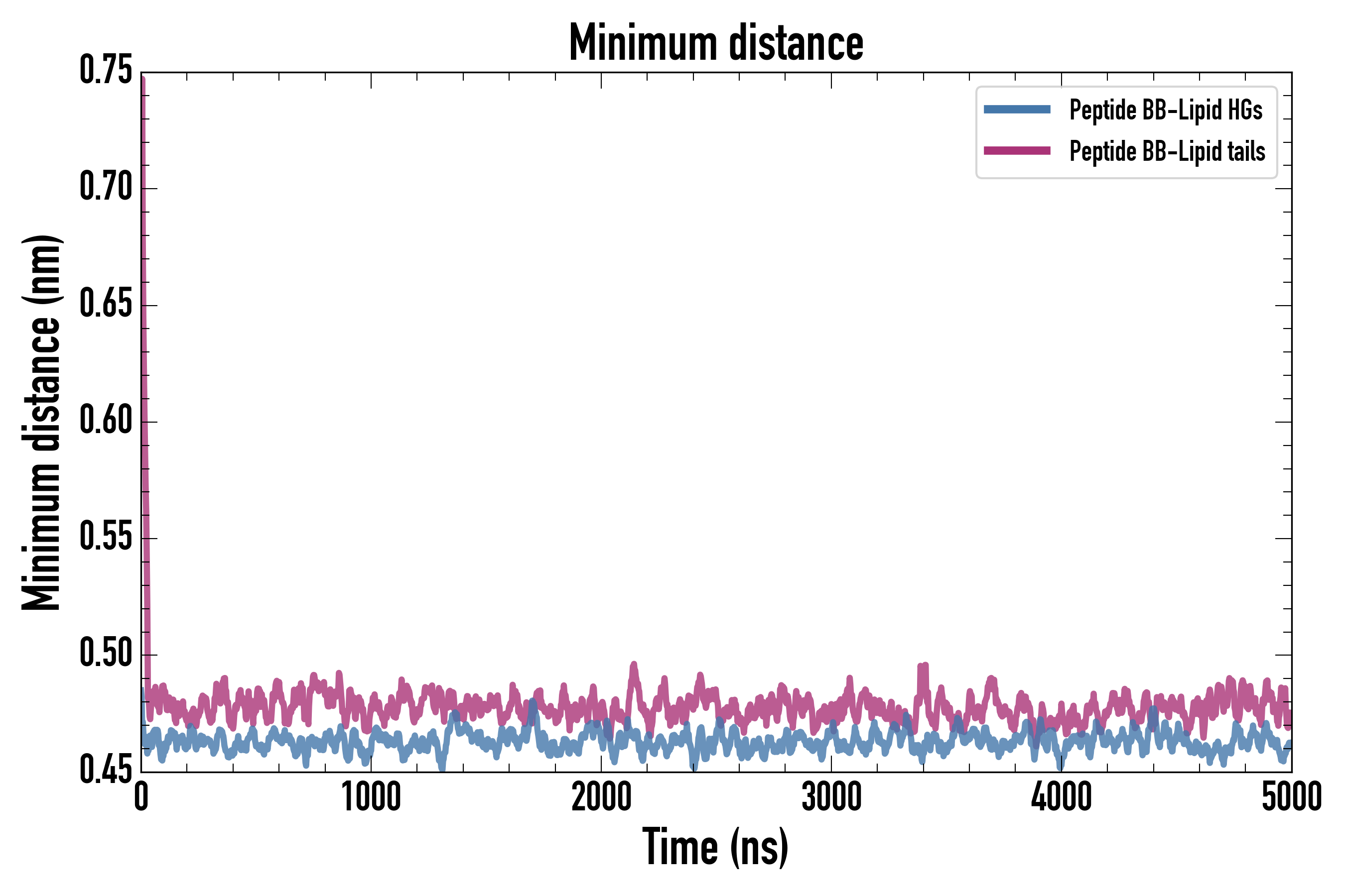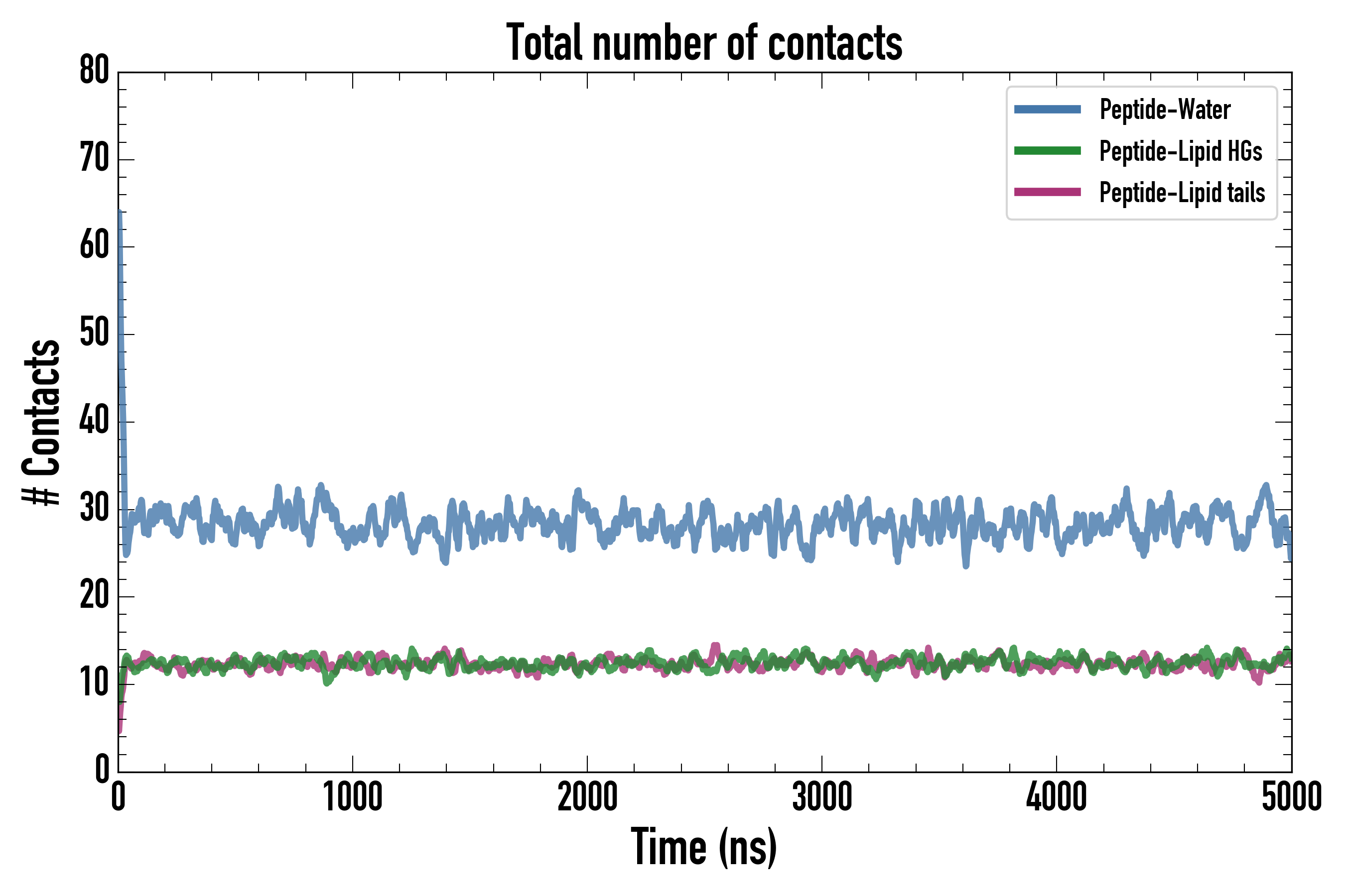 Number of contacts between each residue of the peptide backbone and the different lipid types, averaged over the last microsecond and using a cut-off of 0.6 nm.