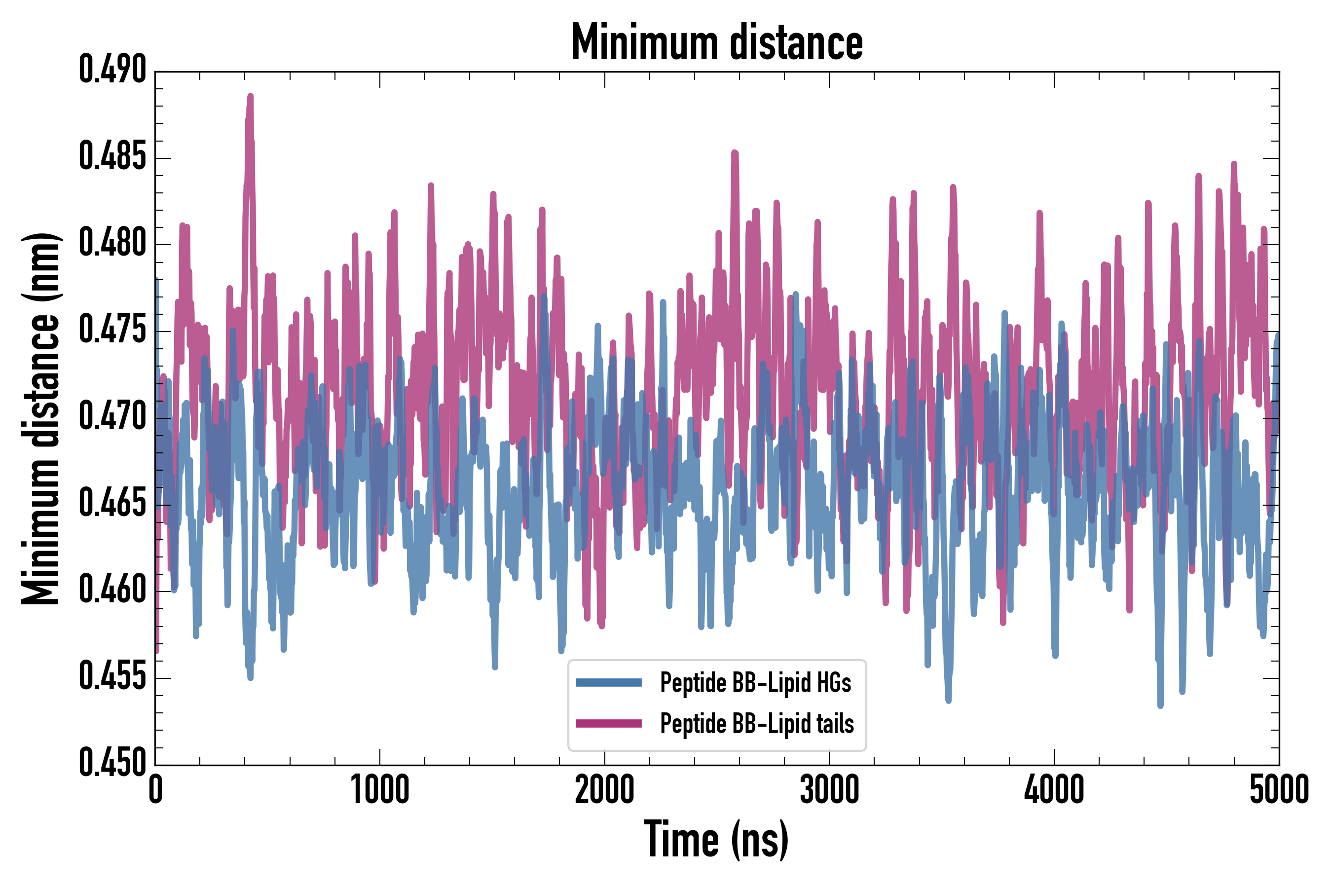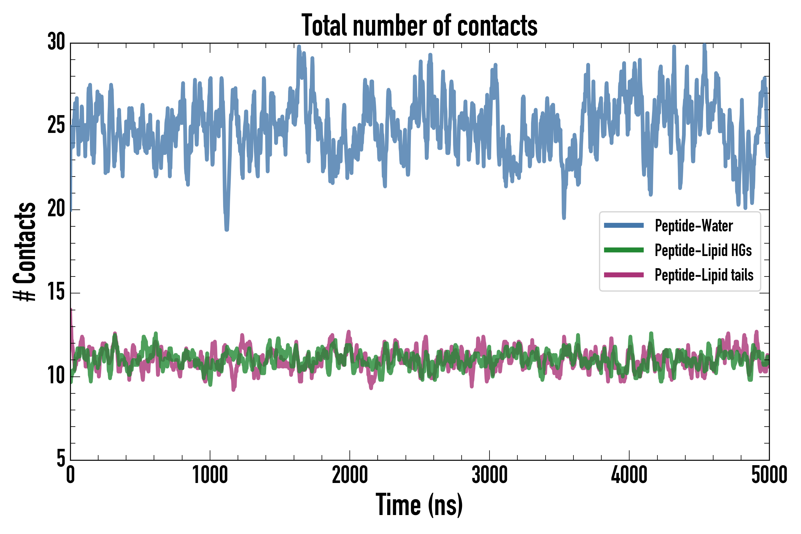 Number of contacts between each residue of the peptide backbone and the different lipid types, averaged over the last microsecond and using a cut-off of 0.6 nm.