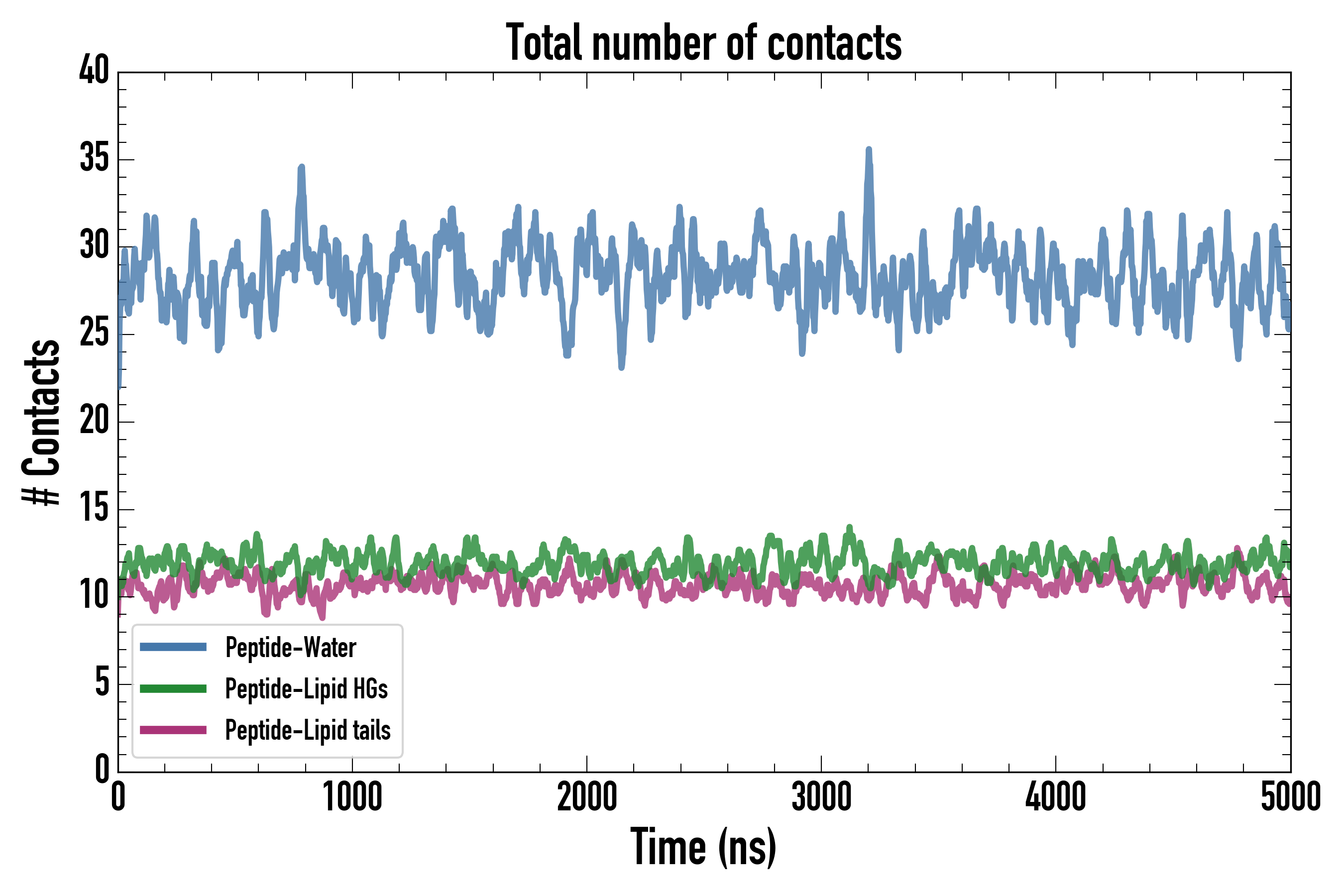 Number of contacts between each residue of the peptide backbone and the different lipid types, averaged over the last microsecond and using a cut-off of 0.6 nm.