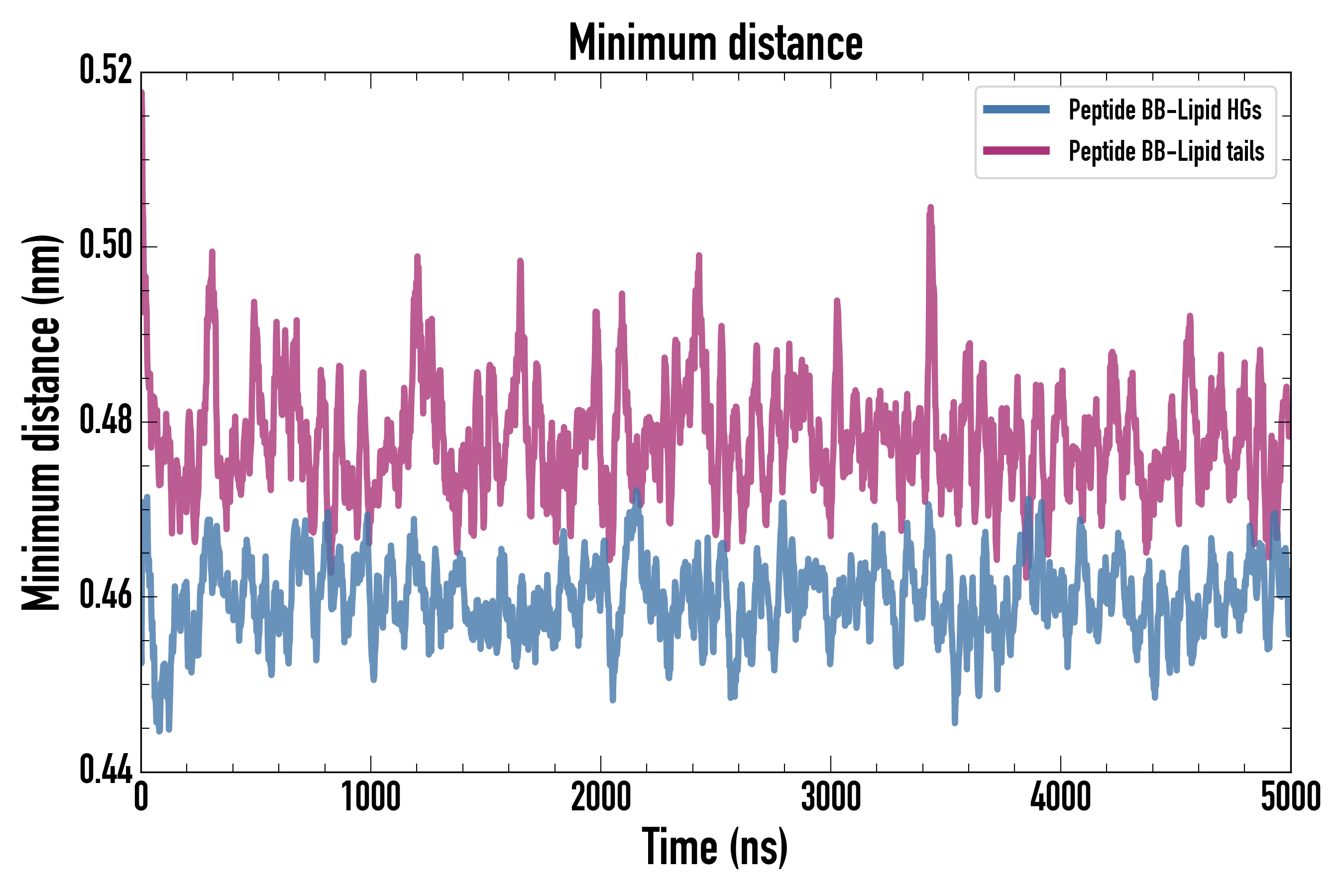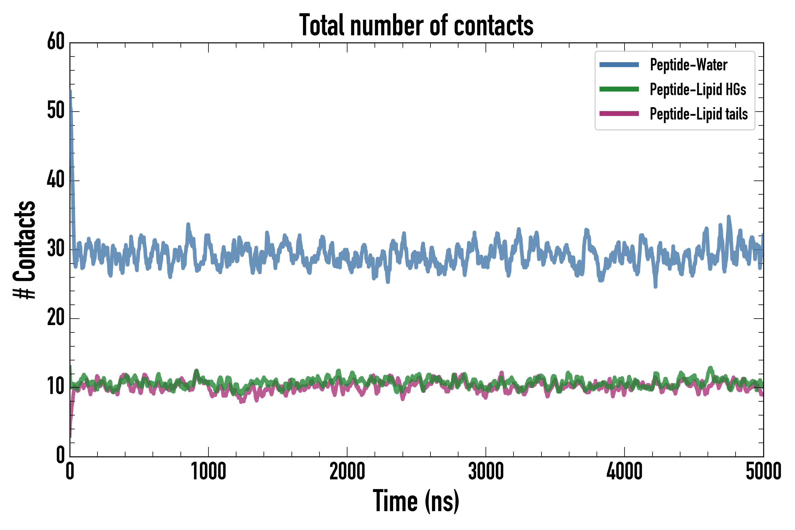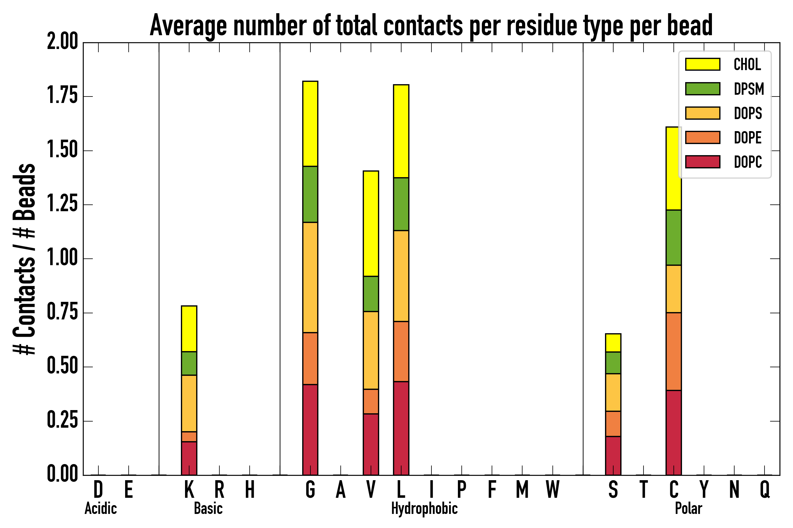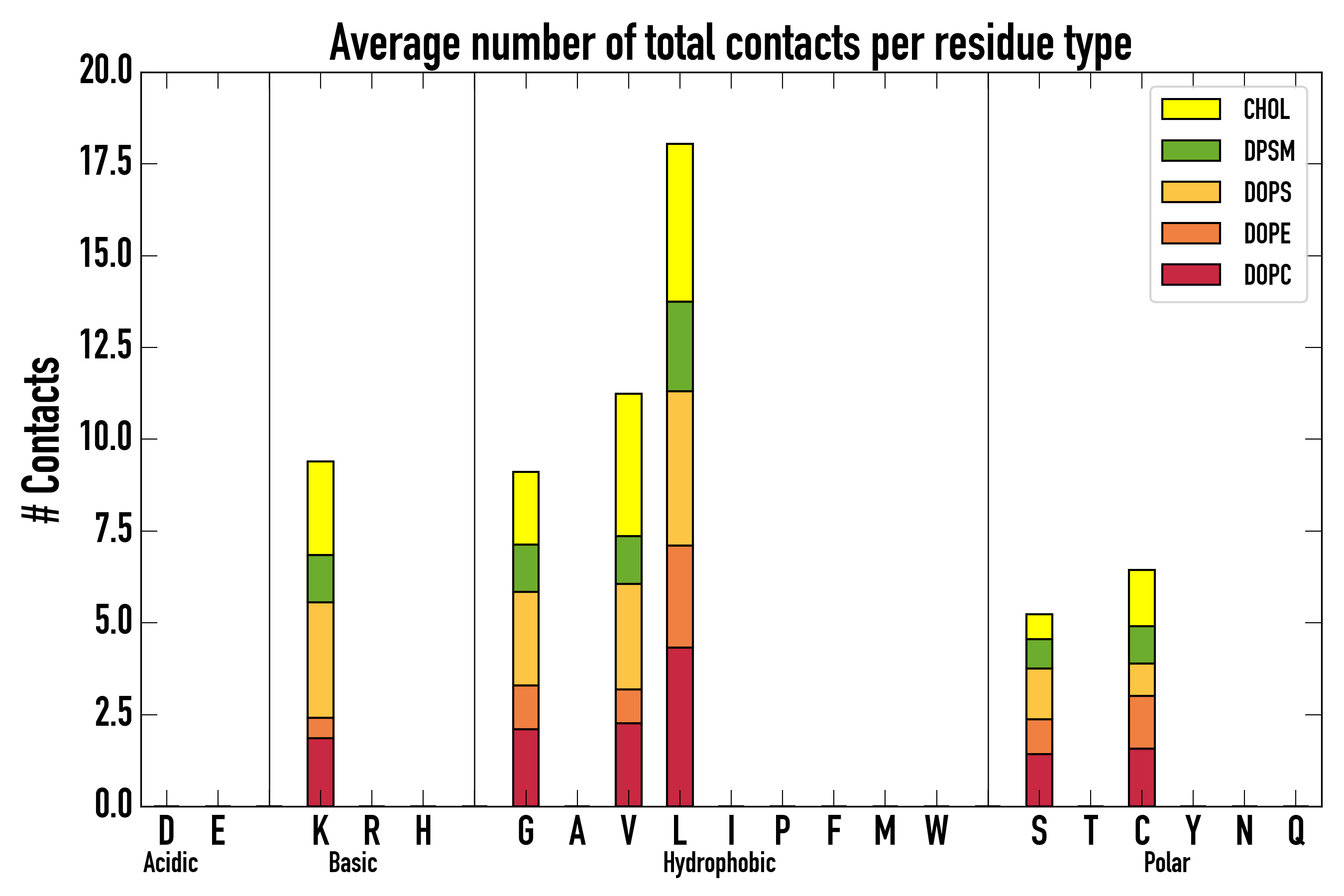 Number of contacts between each residue of the peptide backbone and the different lipid types, averaged over the last microsecond and using a cut-off of 0.6 nm.
