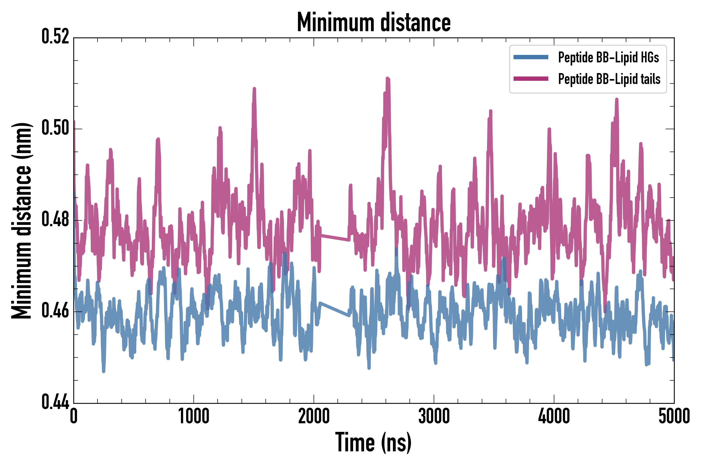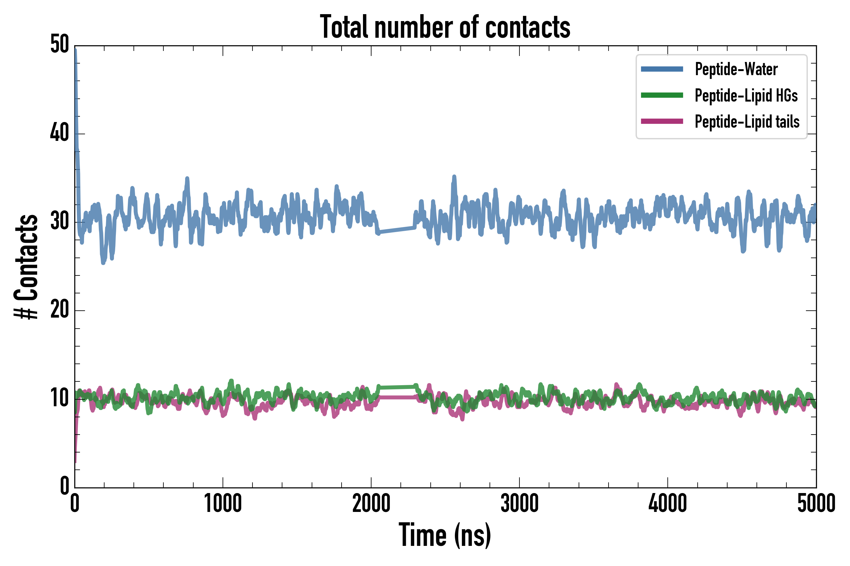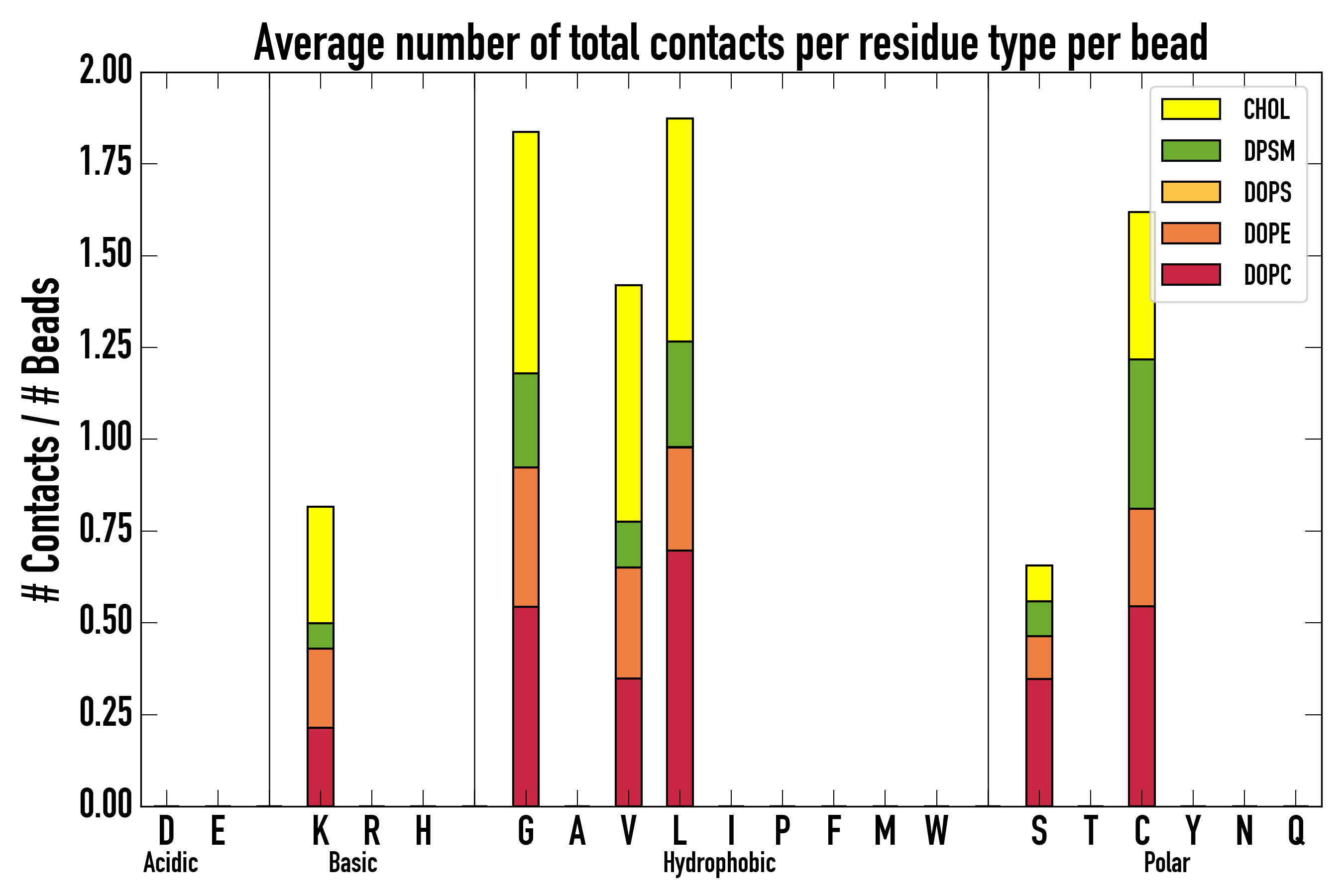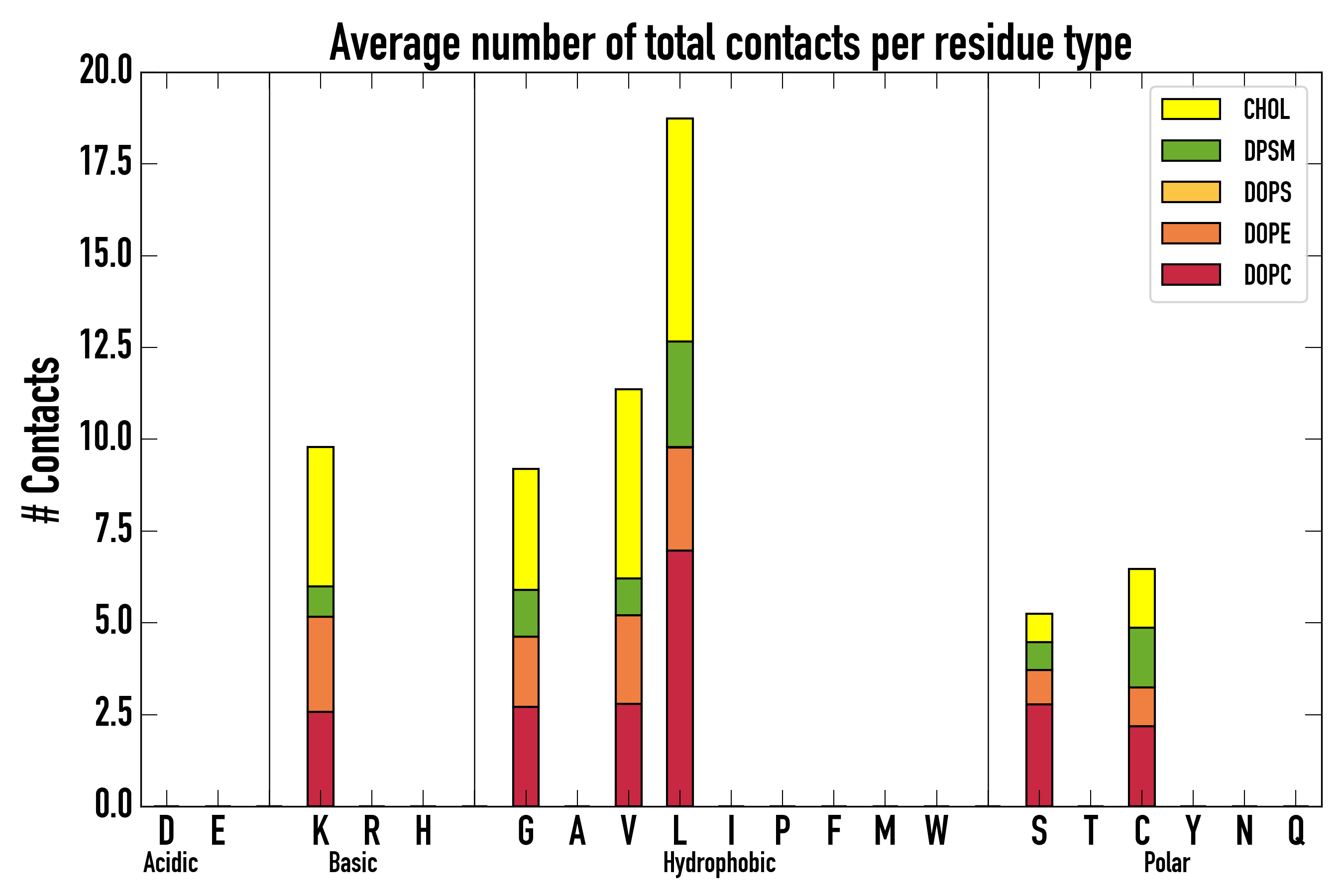 Number of contacts between each residue of the peptide backbone and the different lipid types, averaged over the last microsecond and using a cut-off of 0.6 nm.