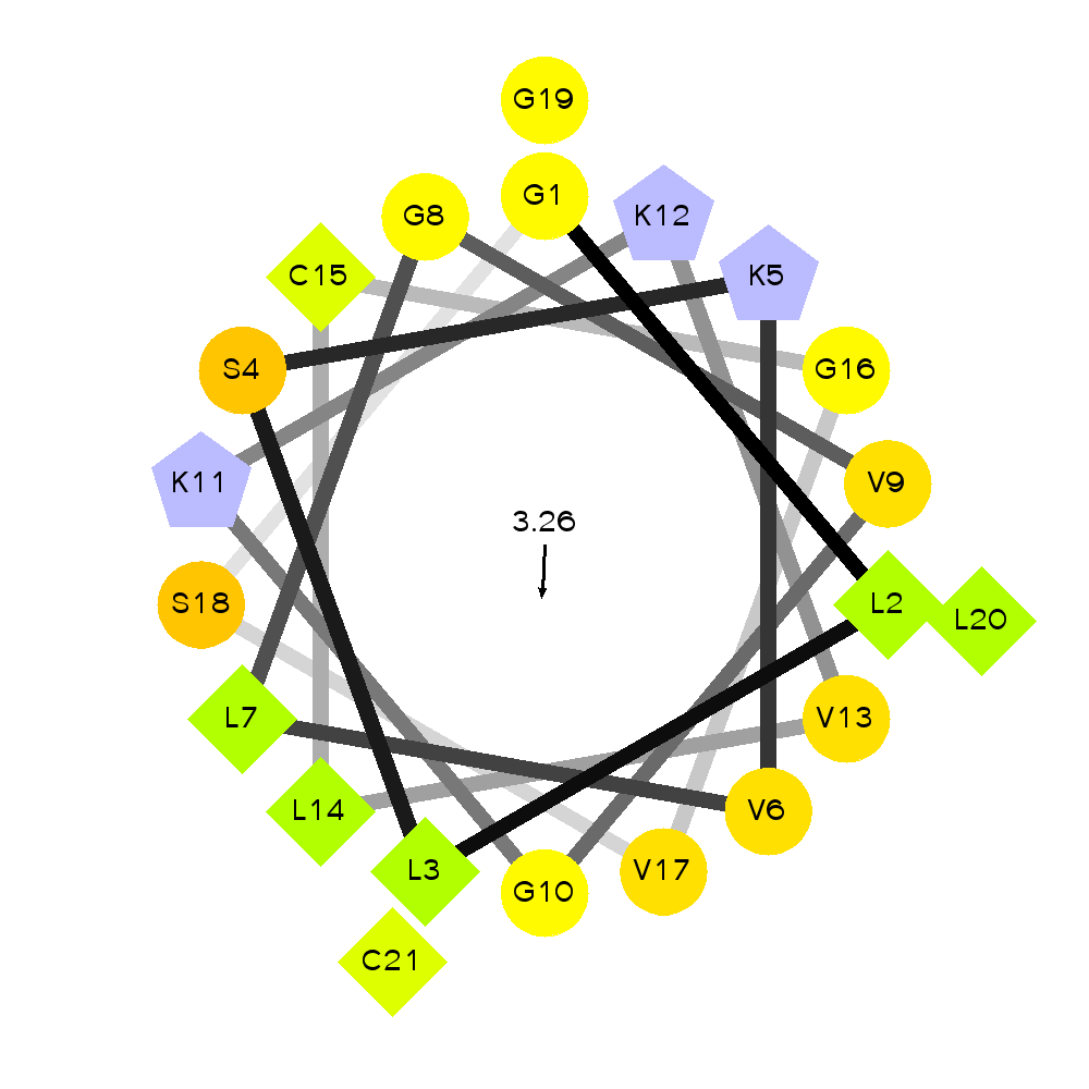By amino acid: Basic: 3 Acidic: 0 Hydrophobic: 14 Polar: 4 Electrostatic Dipolar Moment (e nm): 5.01
