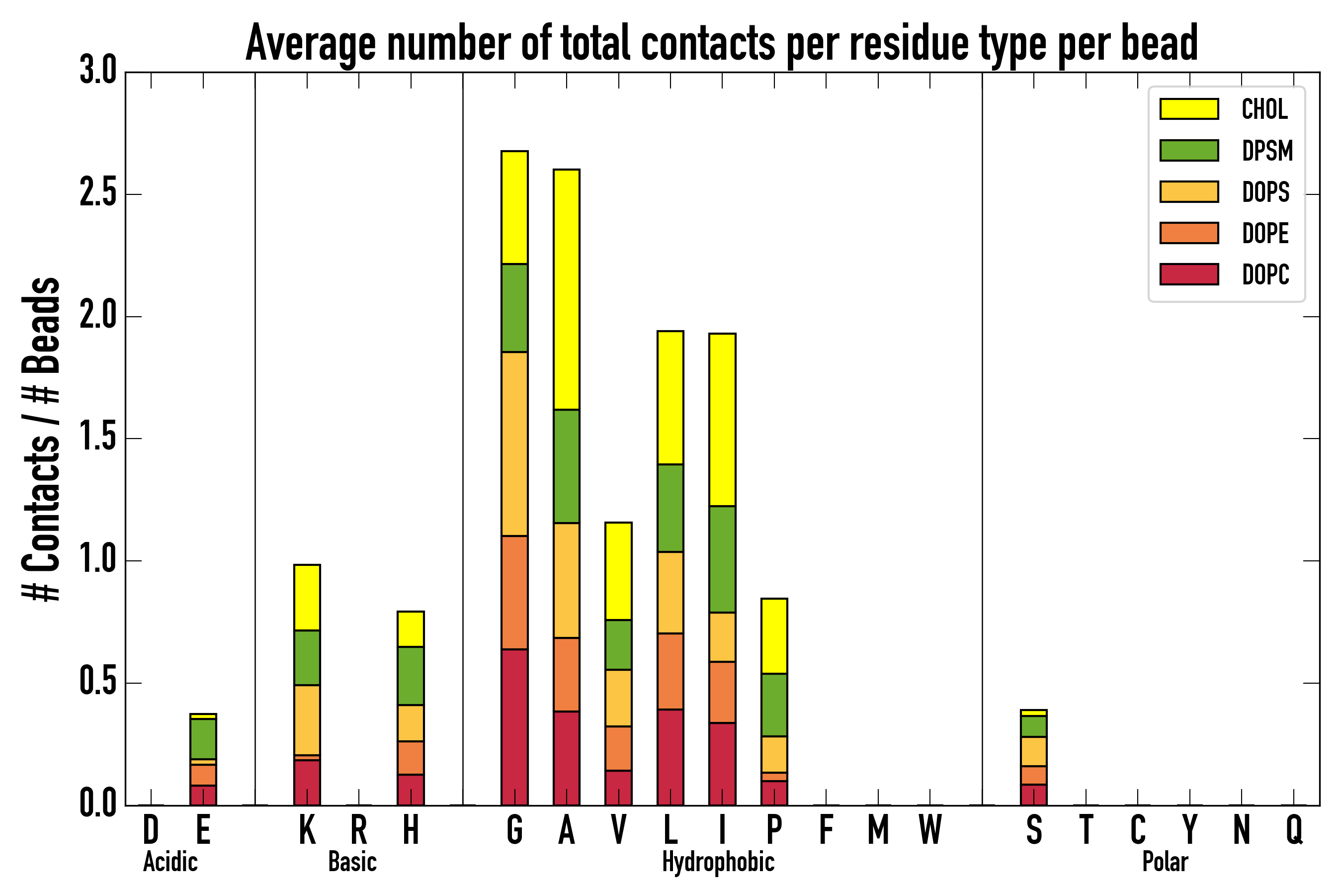 Number of contacts between each residue of the peptide backbone and the different lipid types, averaged over the last microsecond and using a cut-off of 0.6 nm.