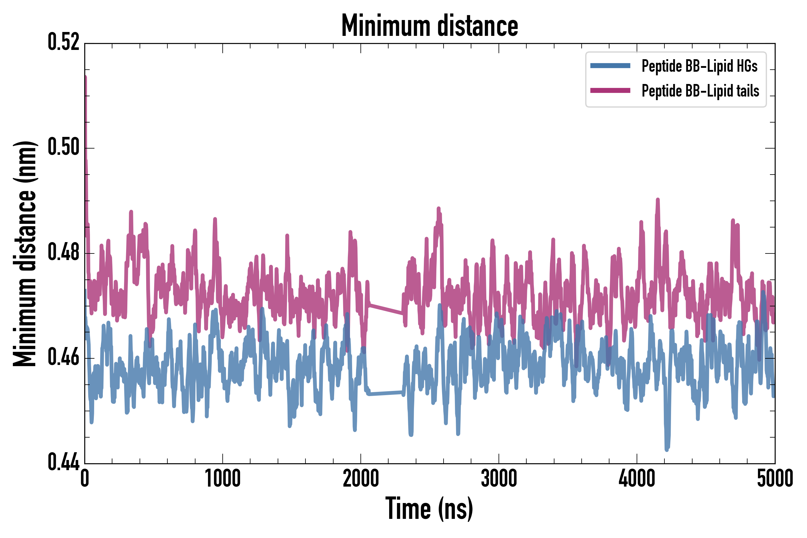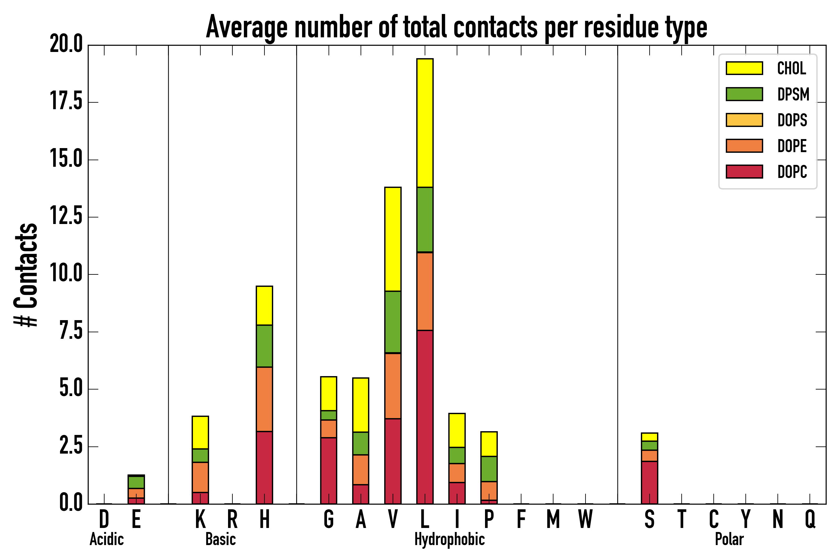 Number of contacts between each residue of the peptide backbone and the different lipid types, averaged over the last microsecond and using a cut-off of 0.6 nm.