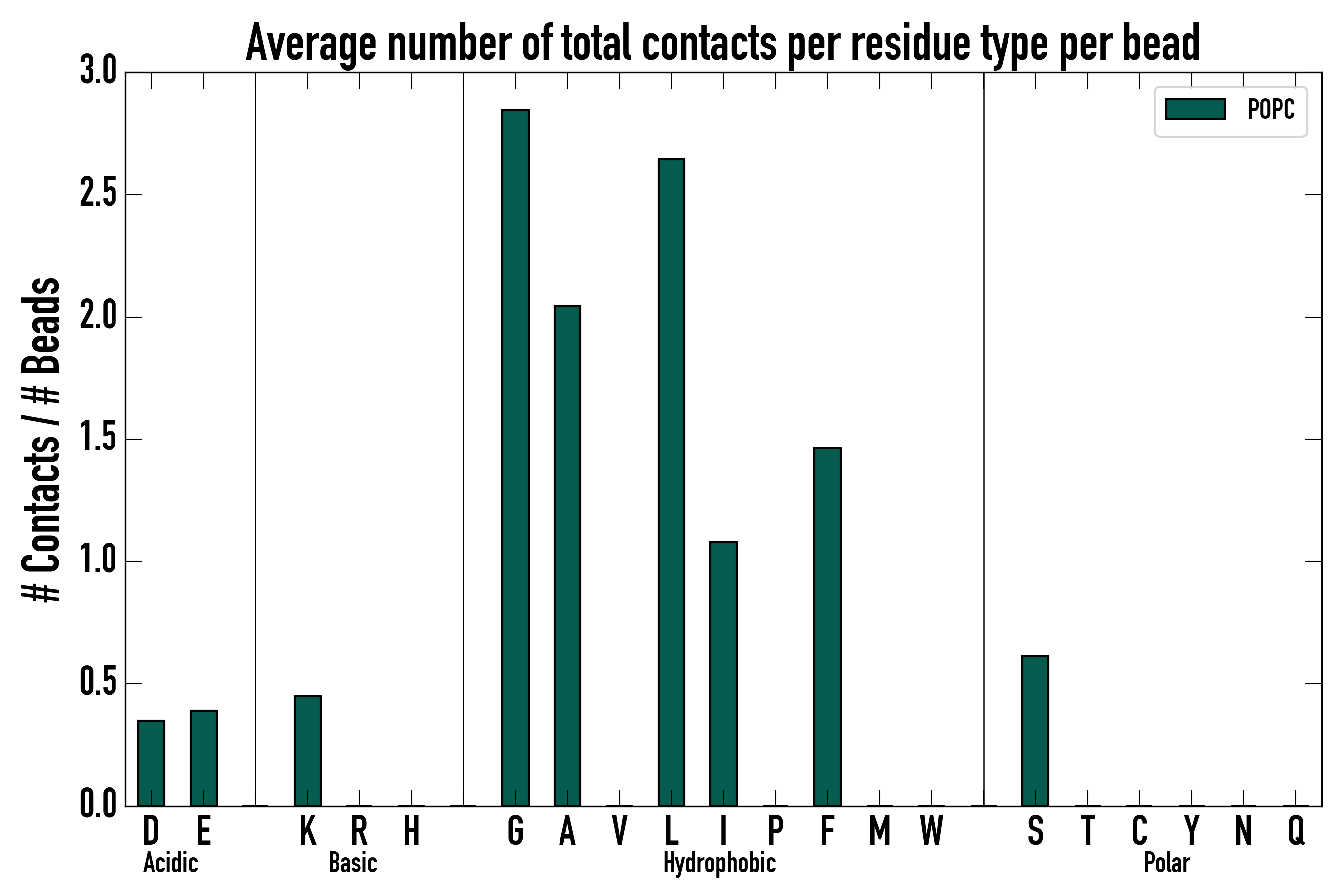 Number of contacts between each residue of the peptide backbone and the different lipid types, averaged over the last microsecond and using a cut-off of 0.6 nm.