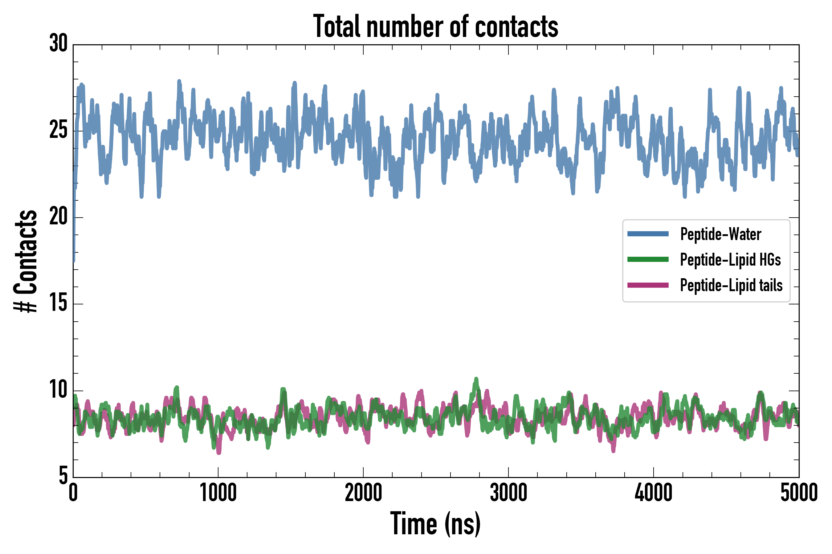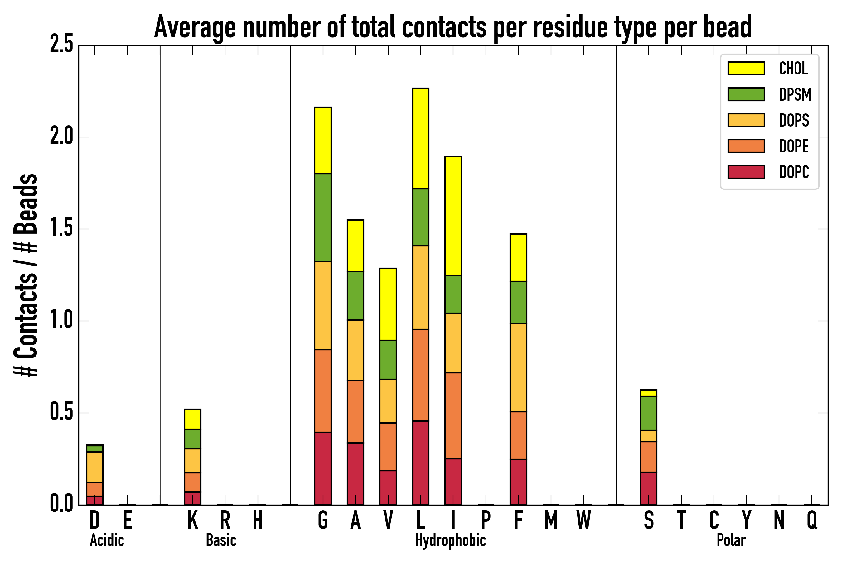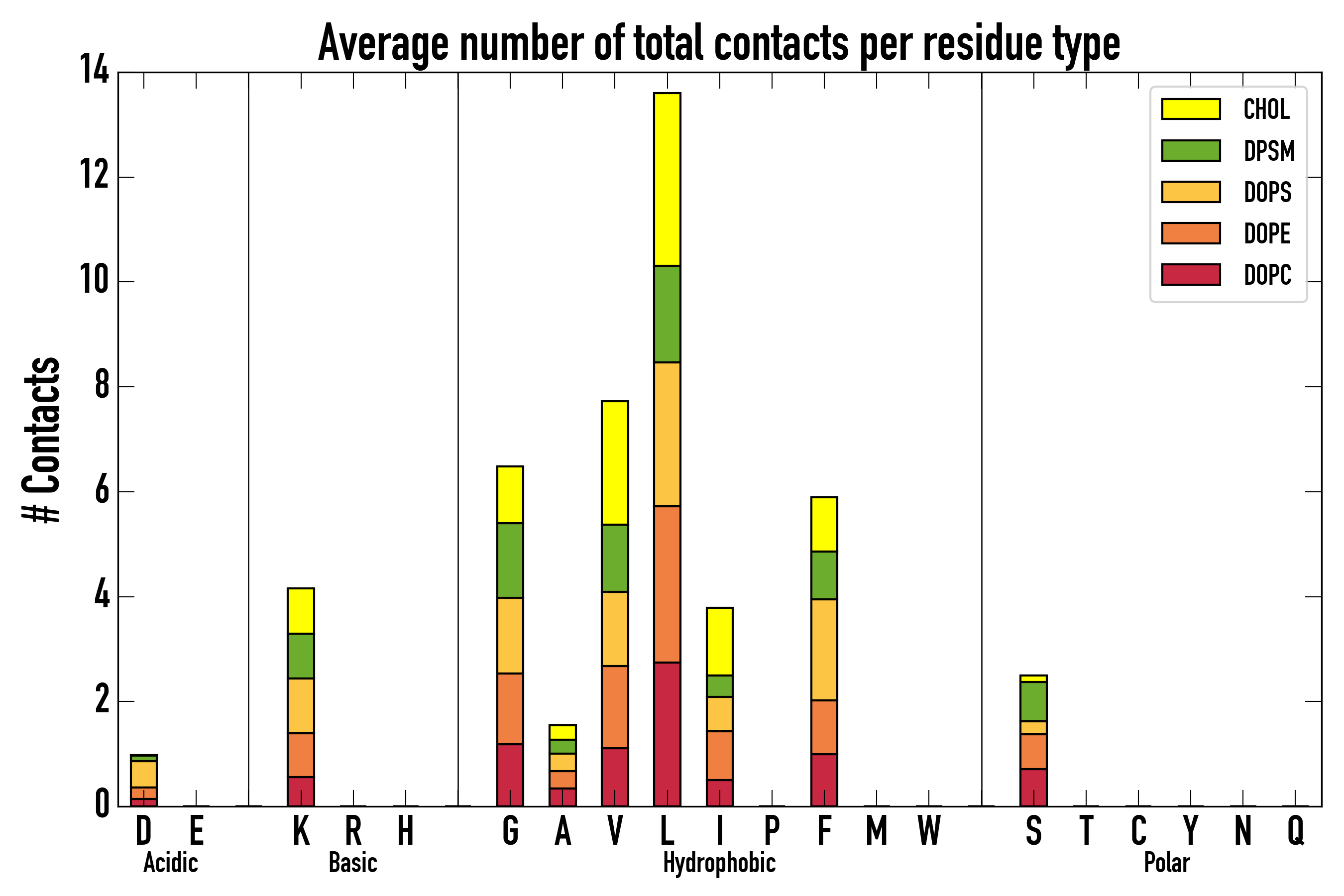 Number of contacts between each residue of the peptide backbone and the different lipid types, averaged over the last microsecond and using a cut-off of 0.6 nm.