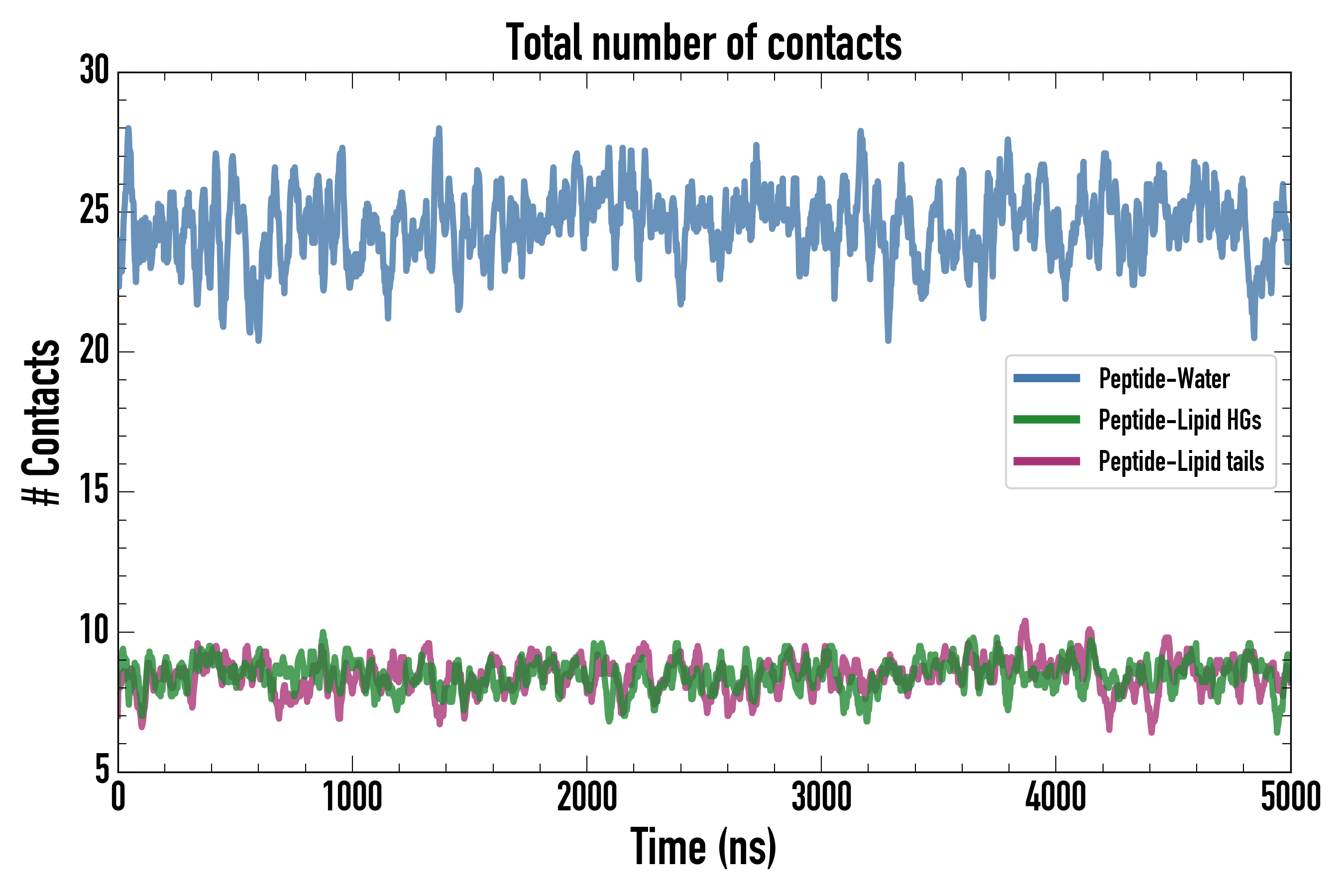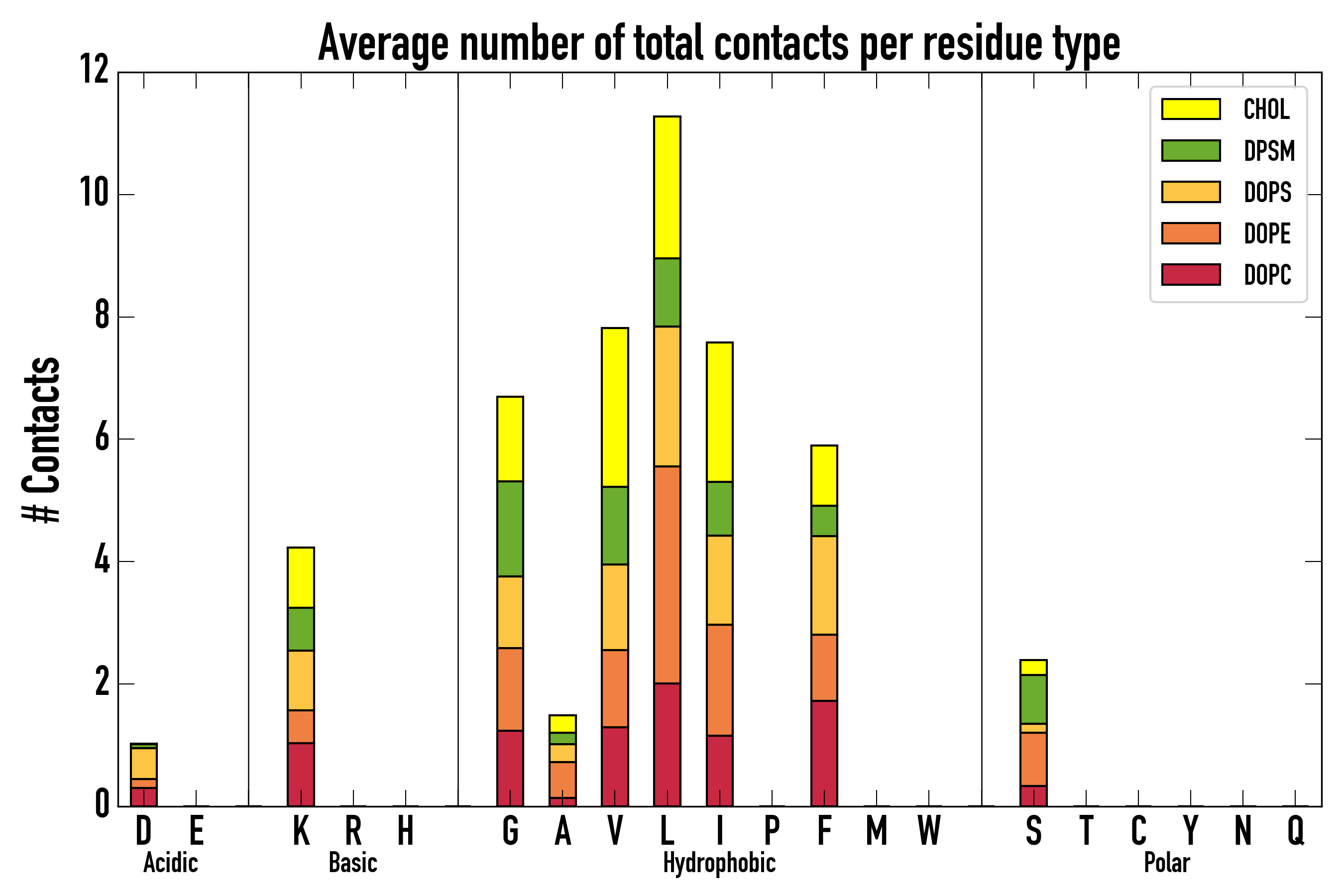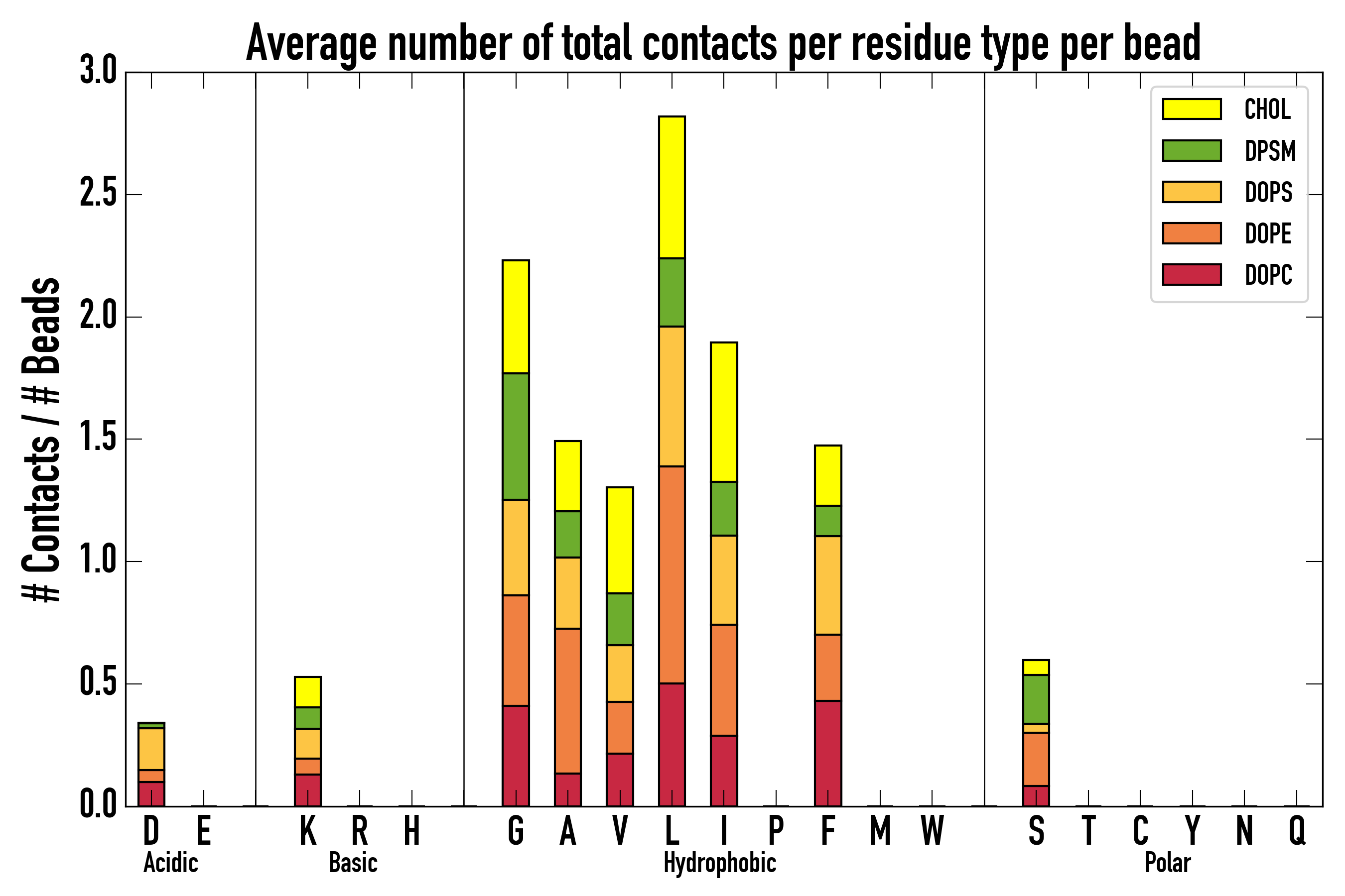 Number of contacts between each residue of the peptide backbone and the different lipid types, averaged over the last microsecond and using a cut-off of 0.6 nm.