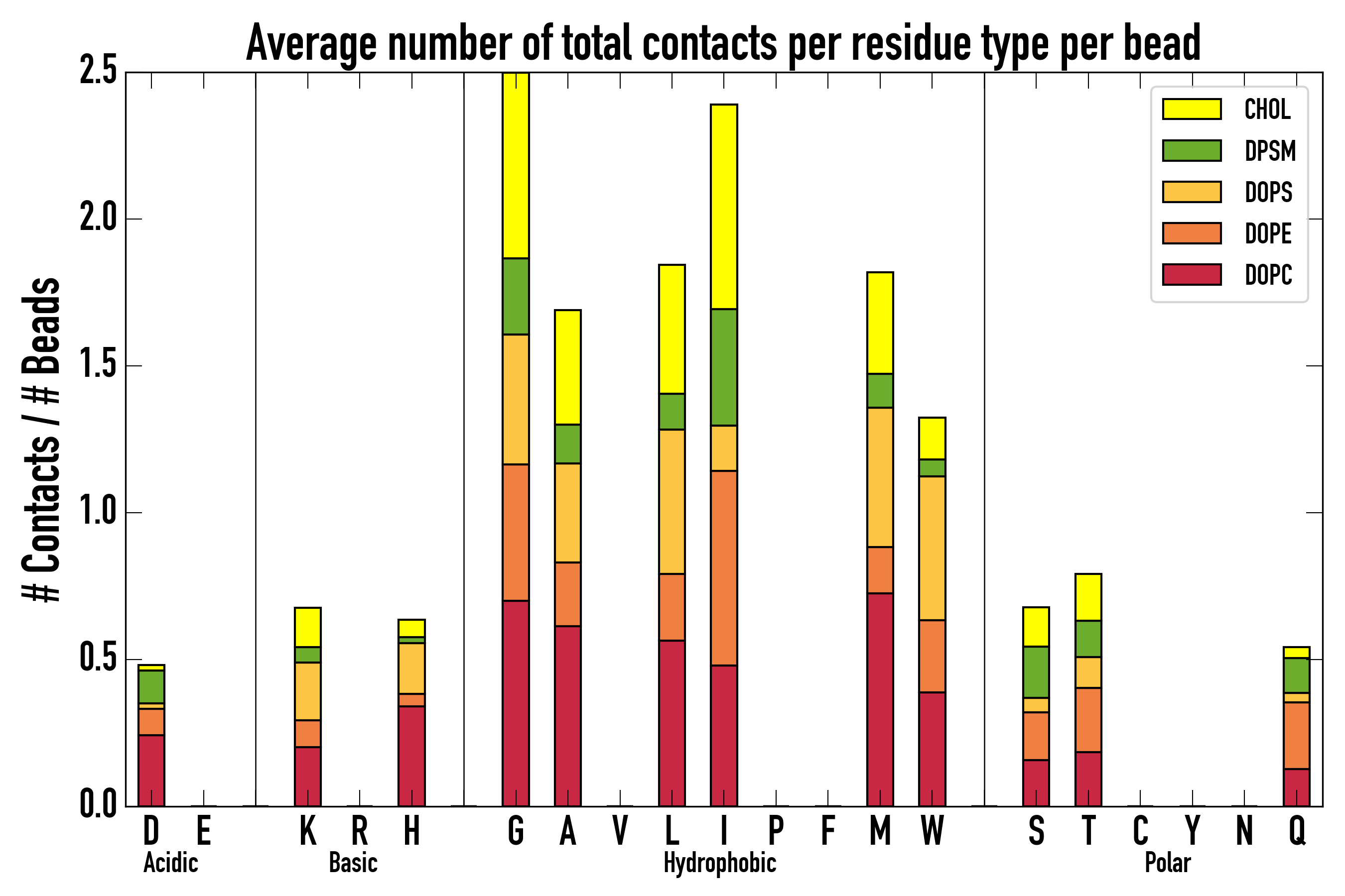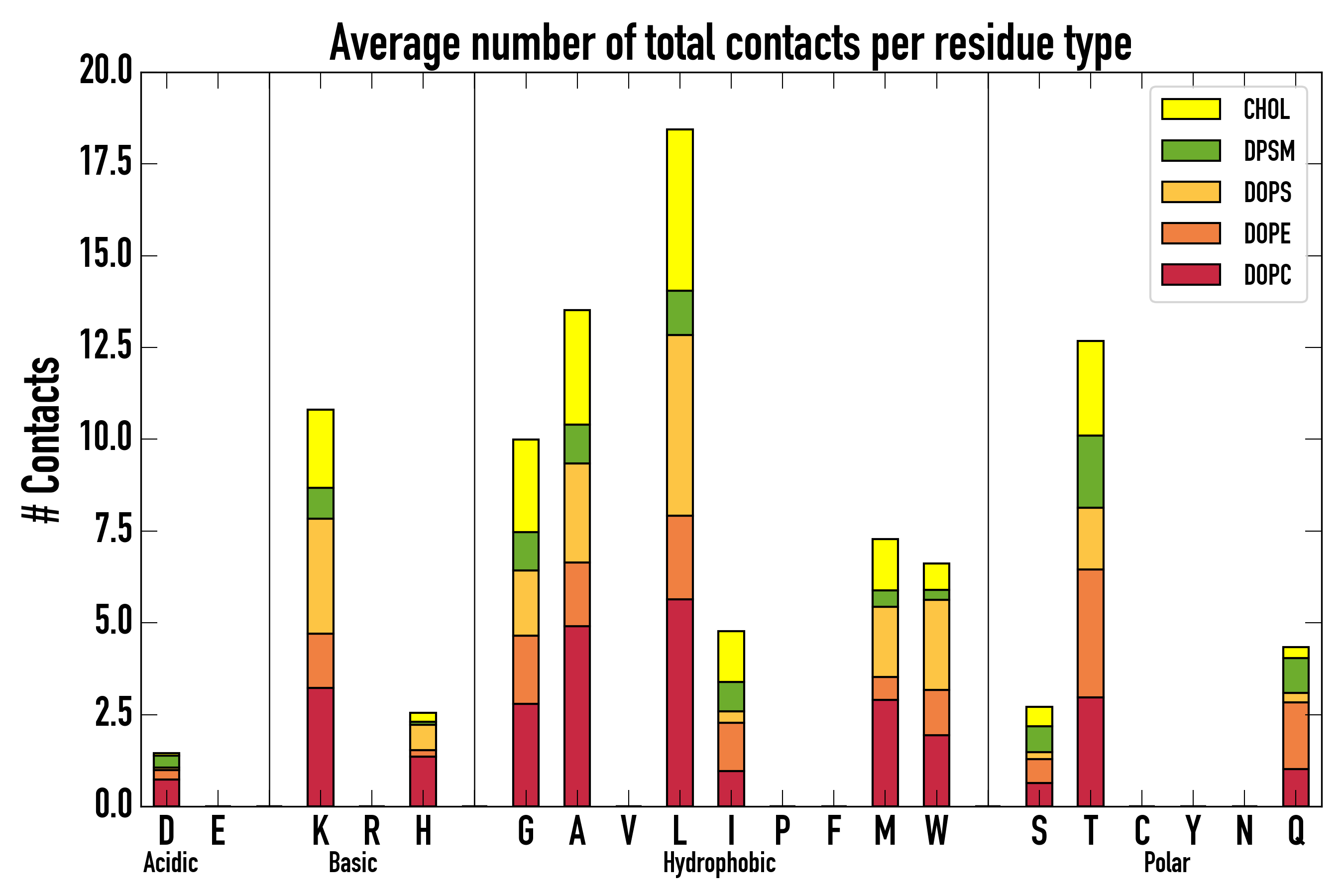 Number of contacts between each residue of the peptide backbone and the different lipid types, averaged over the last microsecond and using a cut-off of 0.6 nm.