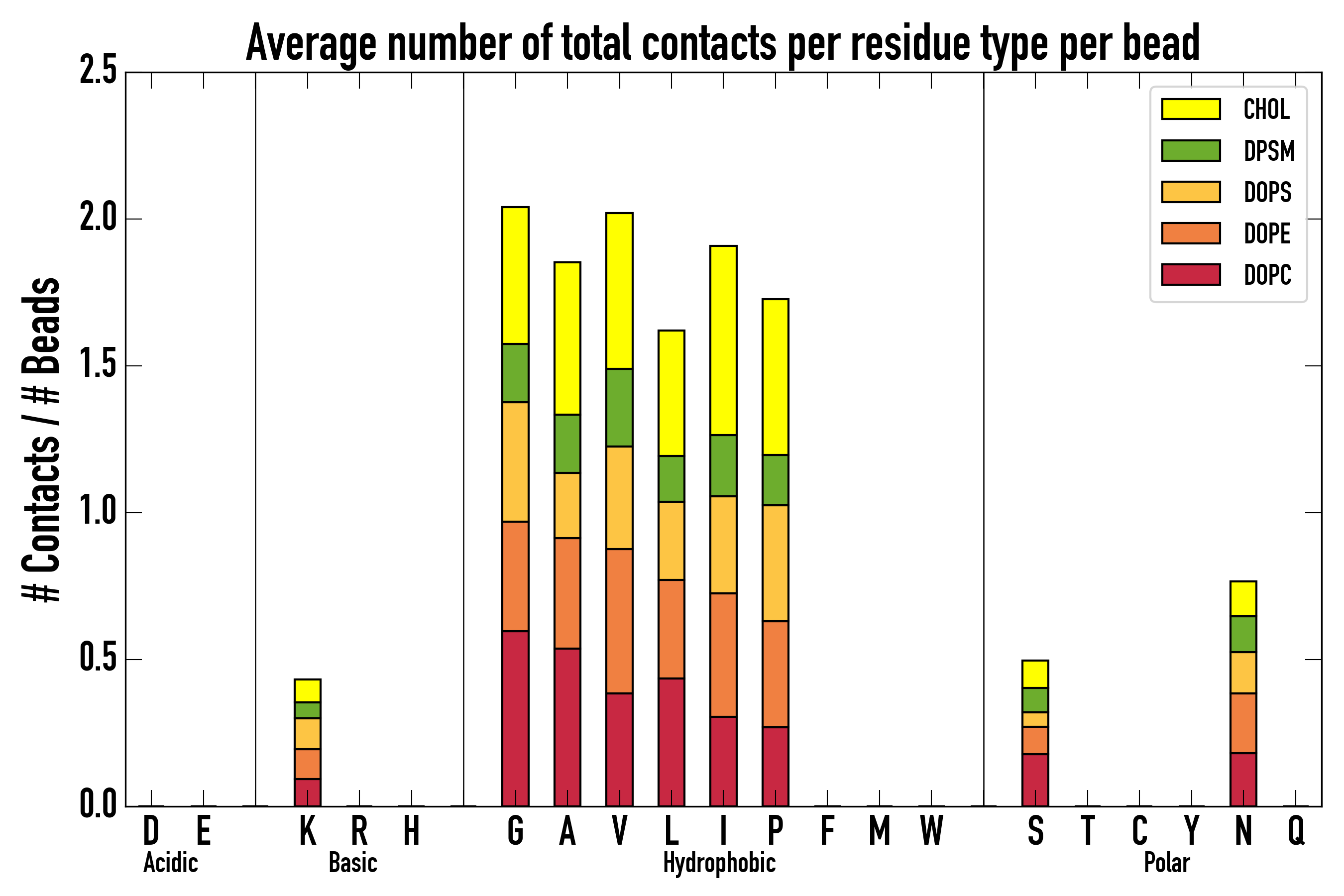 Number of contacts between each residue of the peptide backbone and the different lipid types, averaged over the last microsecond and using a cut-off of 0.6 nm.