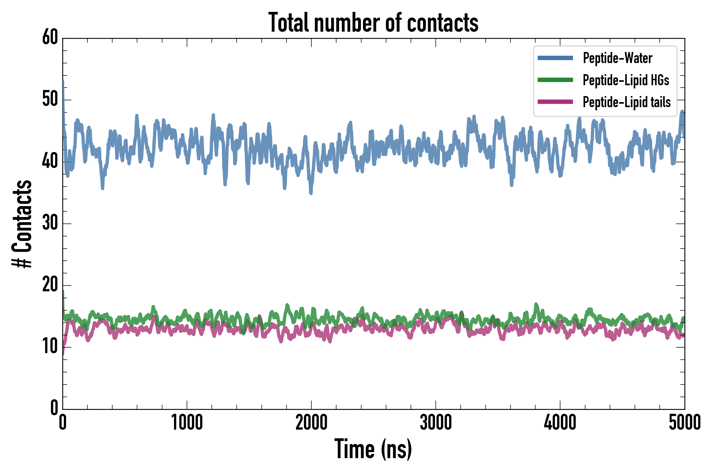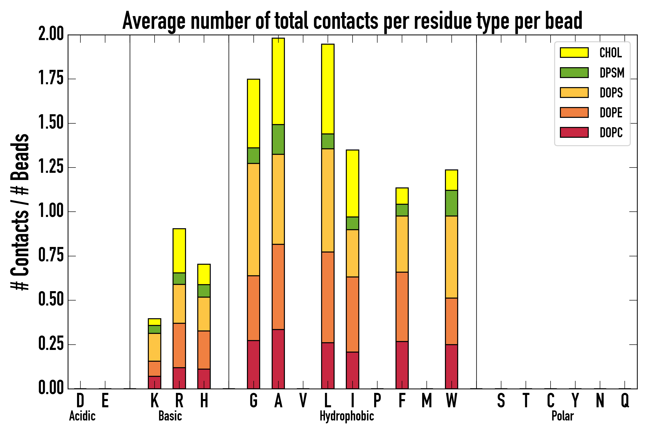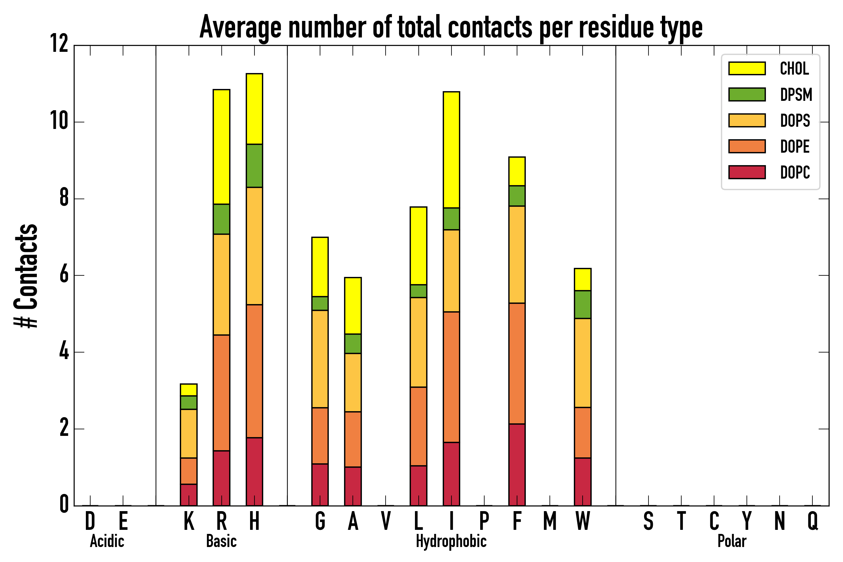 Number of contacts between each residue of the peptide backbone and the different lipid types, averaged over the last microsecond and using a cut-off of 0.6 nm.
