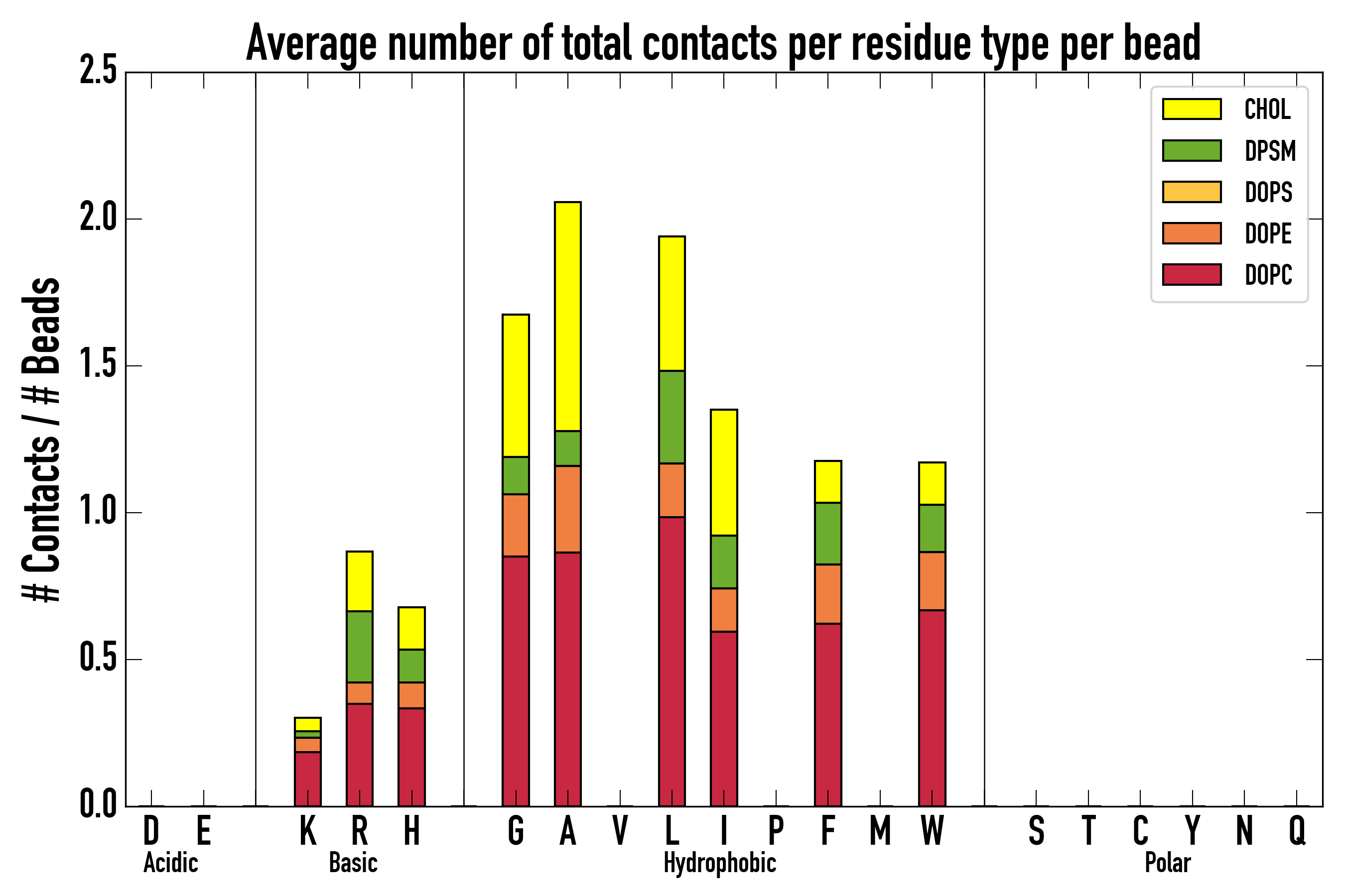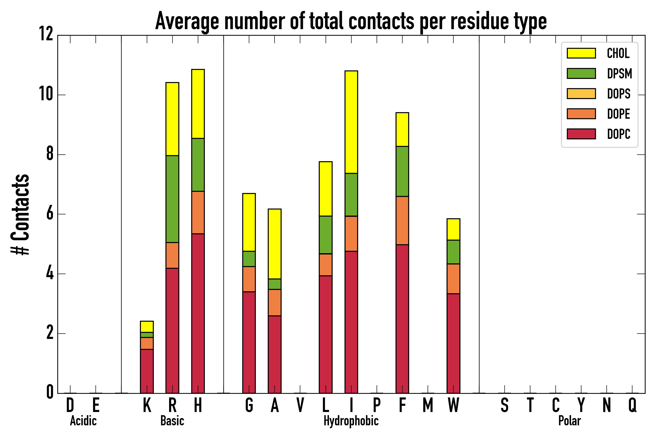 Number of contacts between each residue of the peptide backbone and the different lipid types, averaged over the last microsecond and using a cut-off of 0.6 nm.