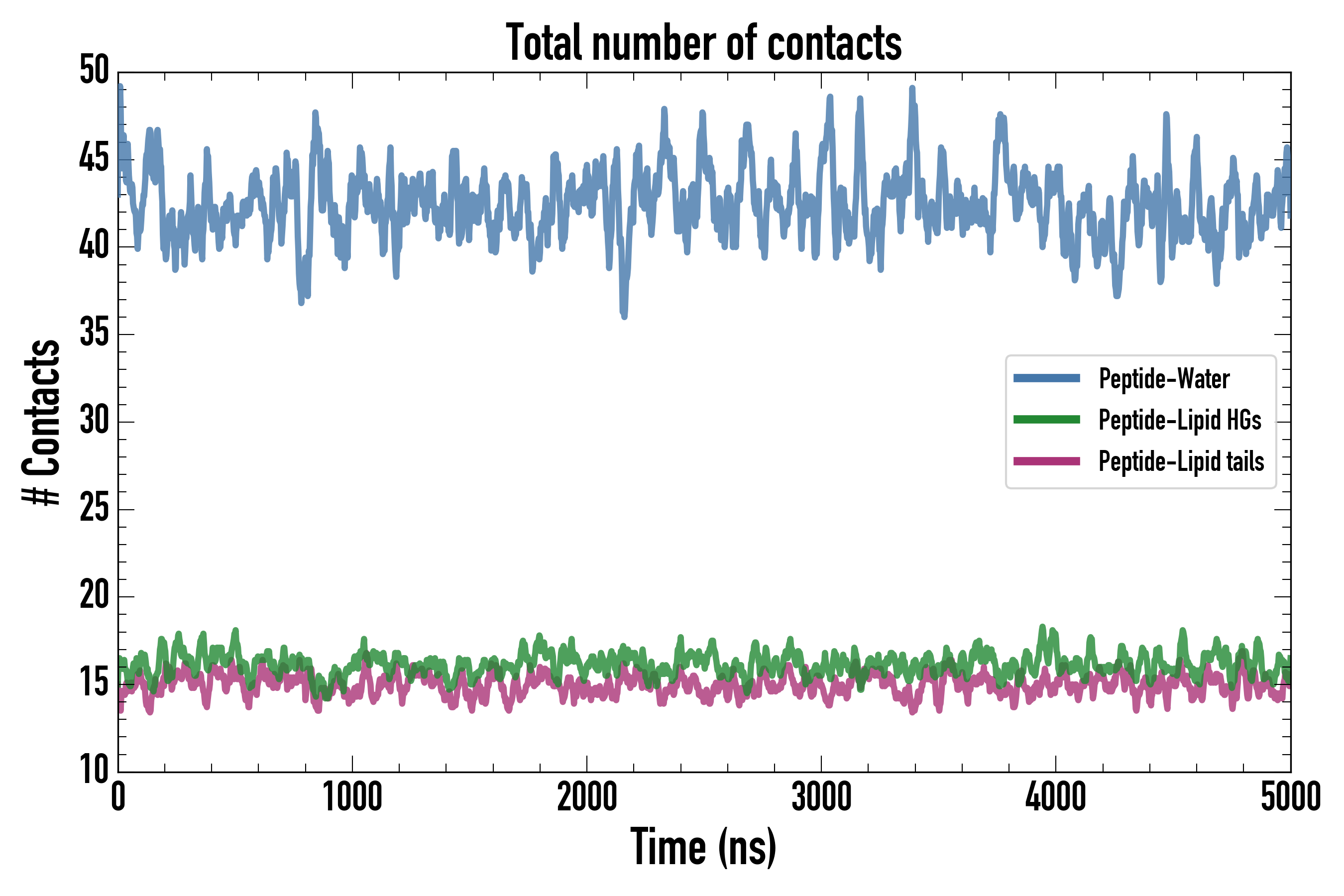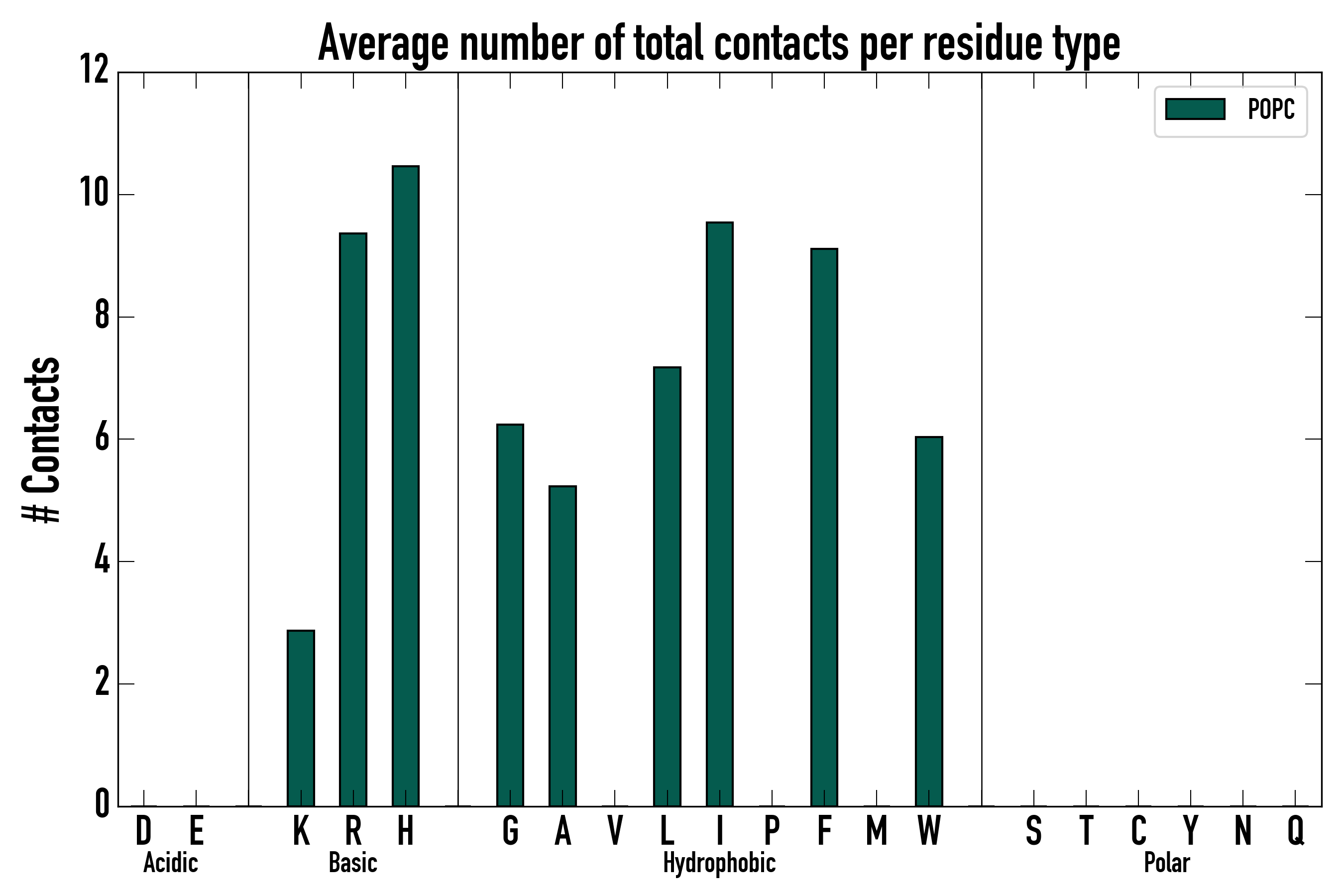 Number of contacts between each residue of the peptide backbone and the different lipid types, averaged over the last microsecond and using a cut-off of 0.6 nm.