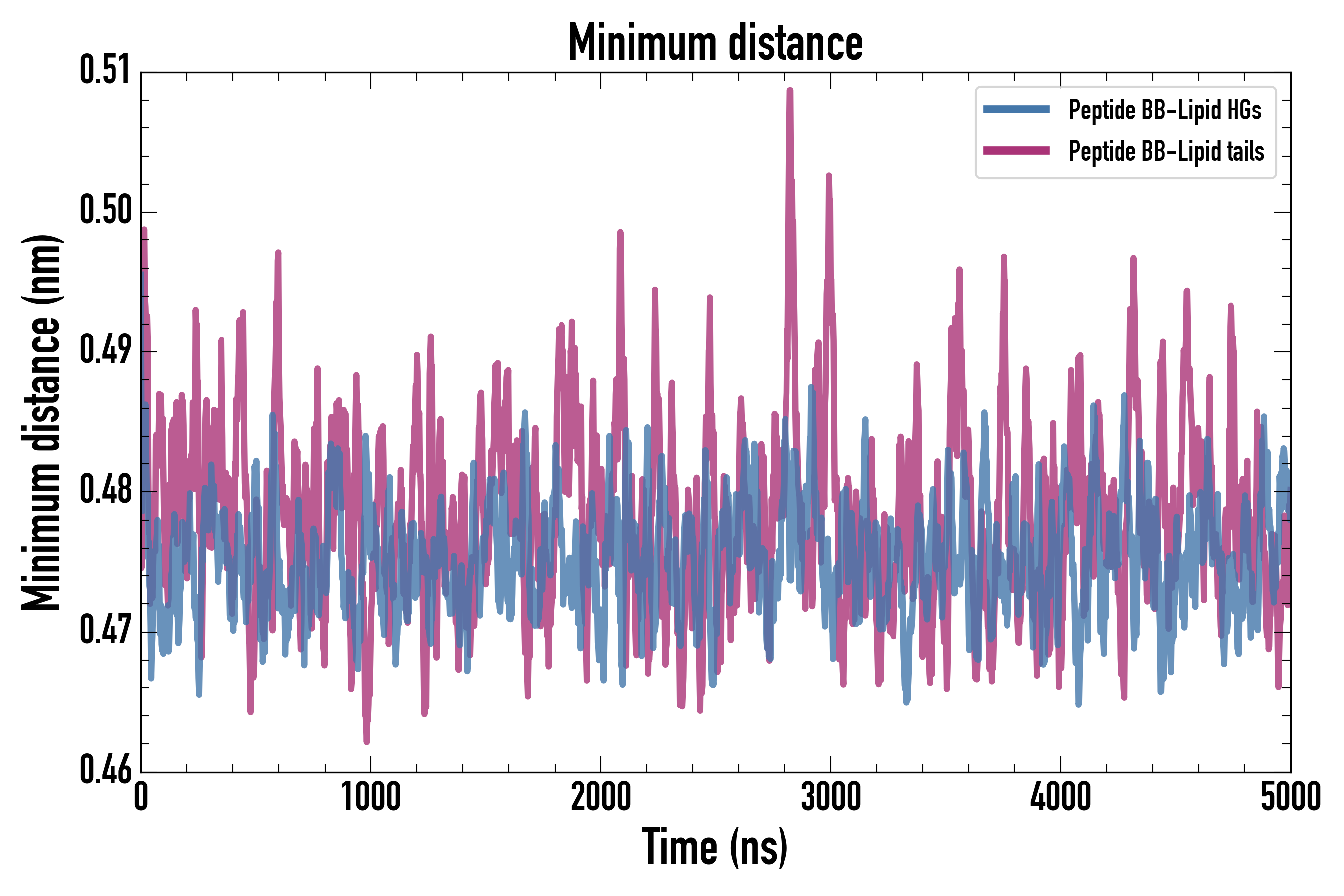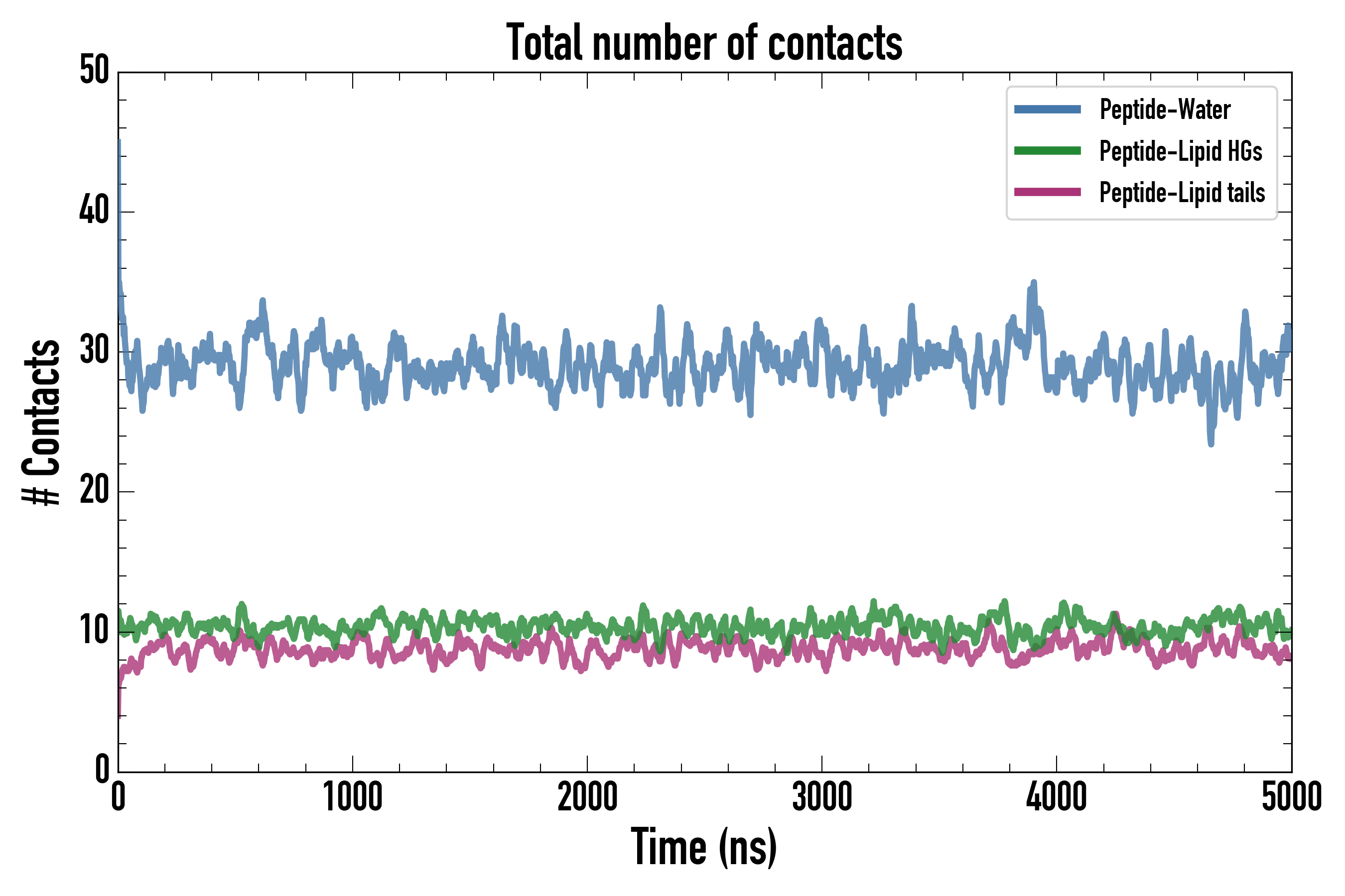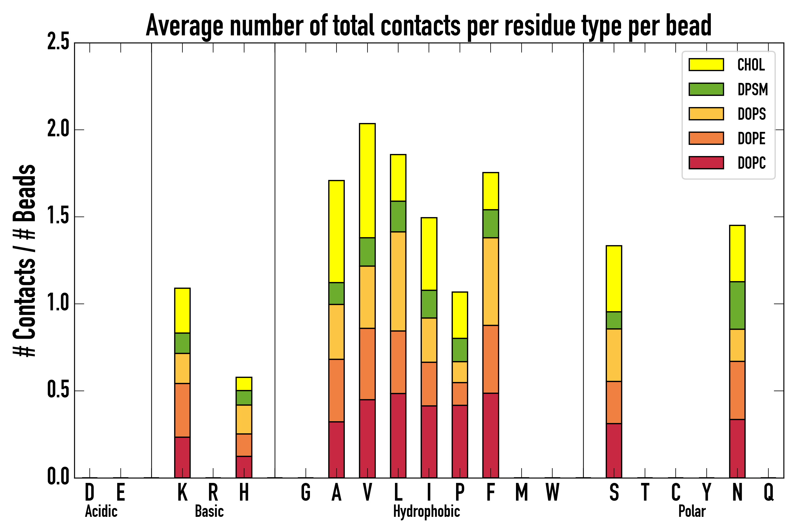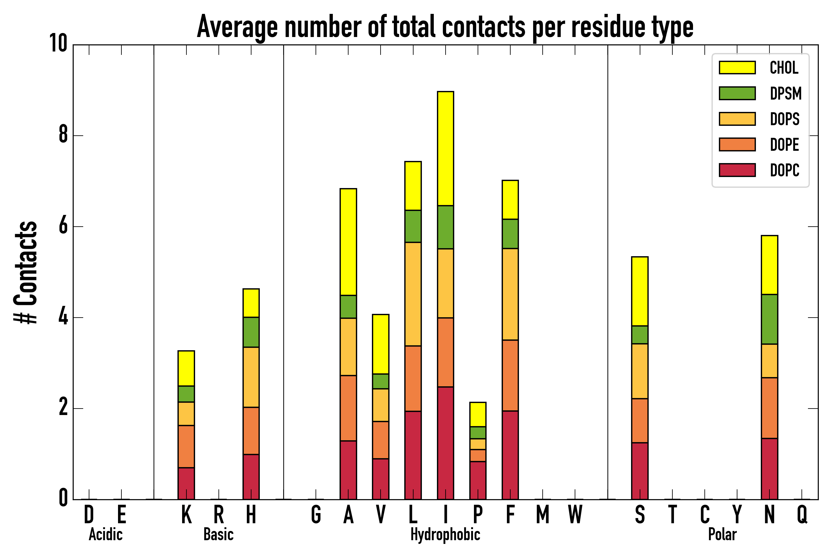 Number of contacts between each residue of the peptide backbone and the different lipid types, averaged over the last microsecond and using a cut-off of 0.6 nm.
