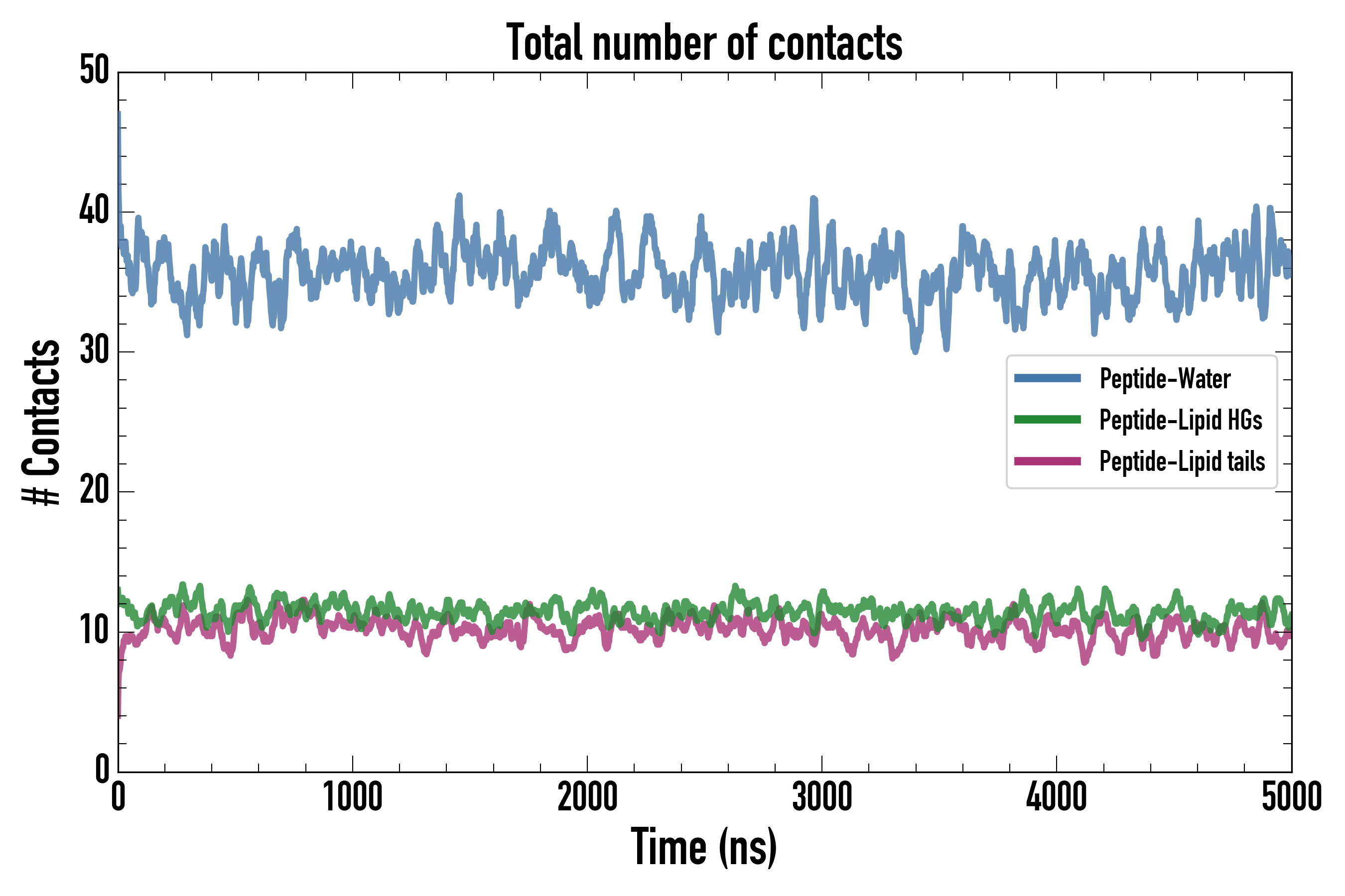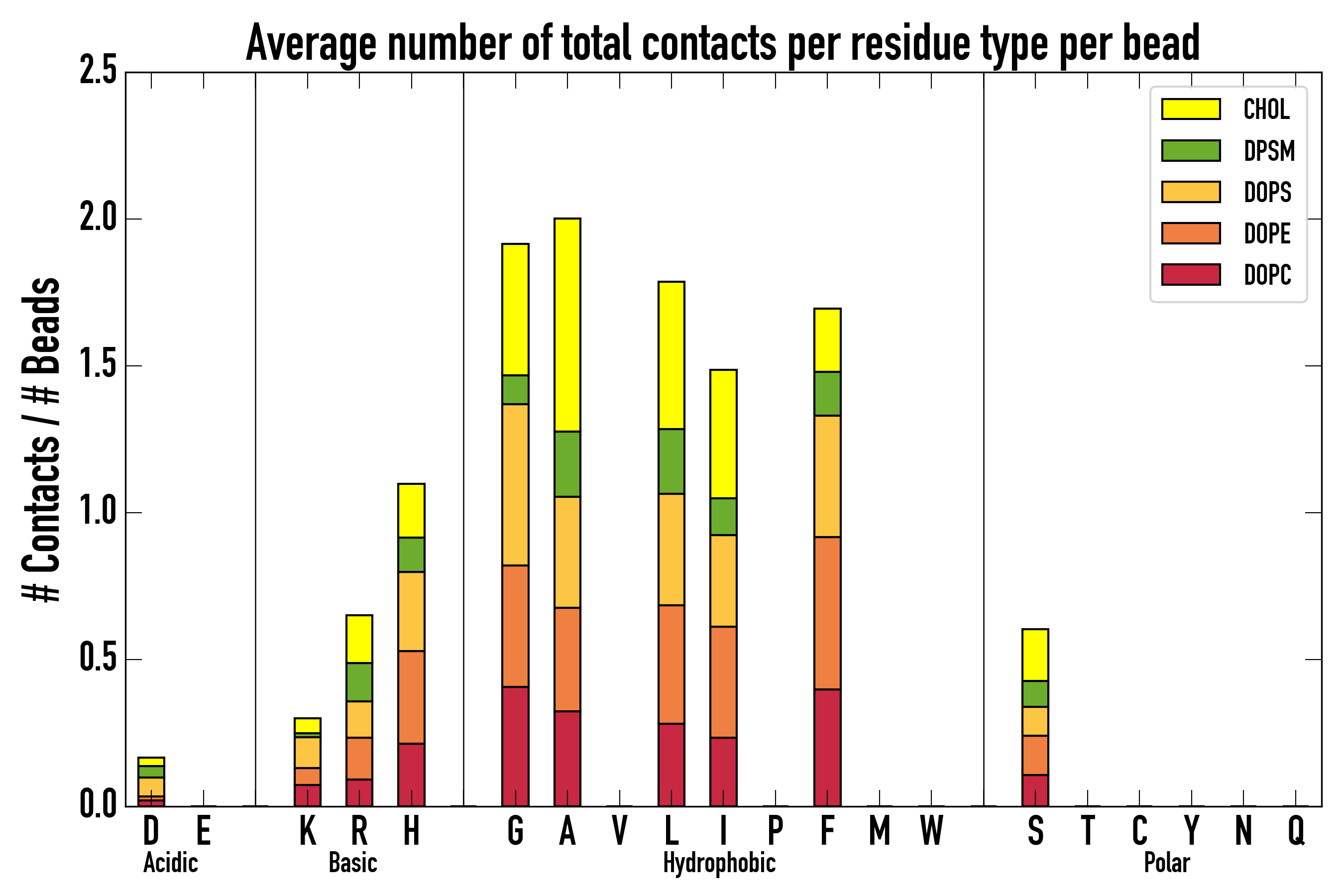 Number of contacts between each residue of the peptide backbone and the different lipid types, averaged over the last microsecond and using a cut-off of 0.6 nm.