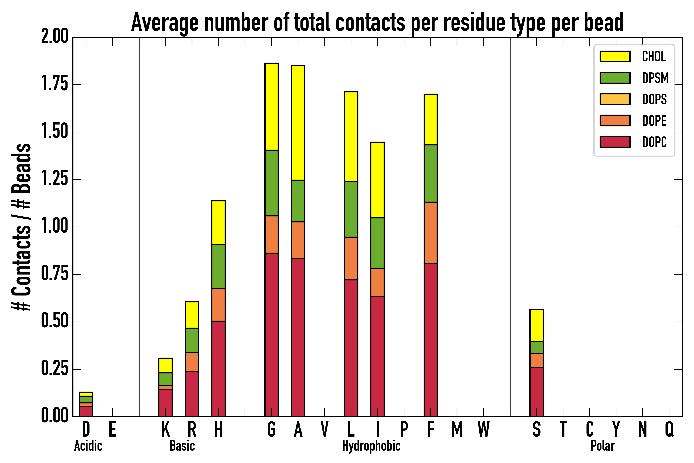 Number of contacts between each residue of the peptide backbone and the different lipid types, averaged over the last microsecond and using a cut-off of 0.6 nm.