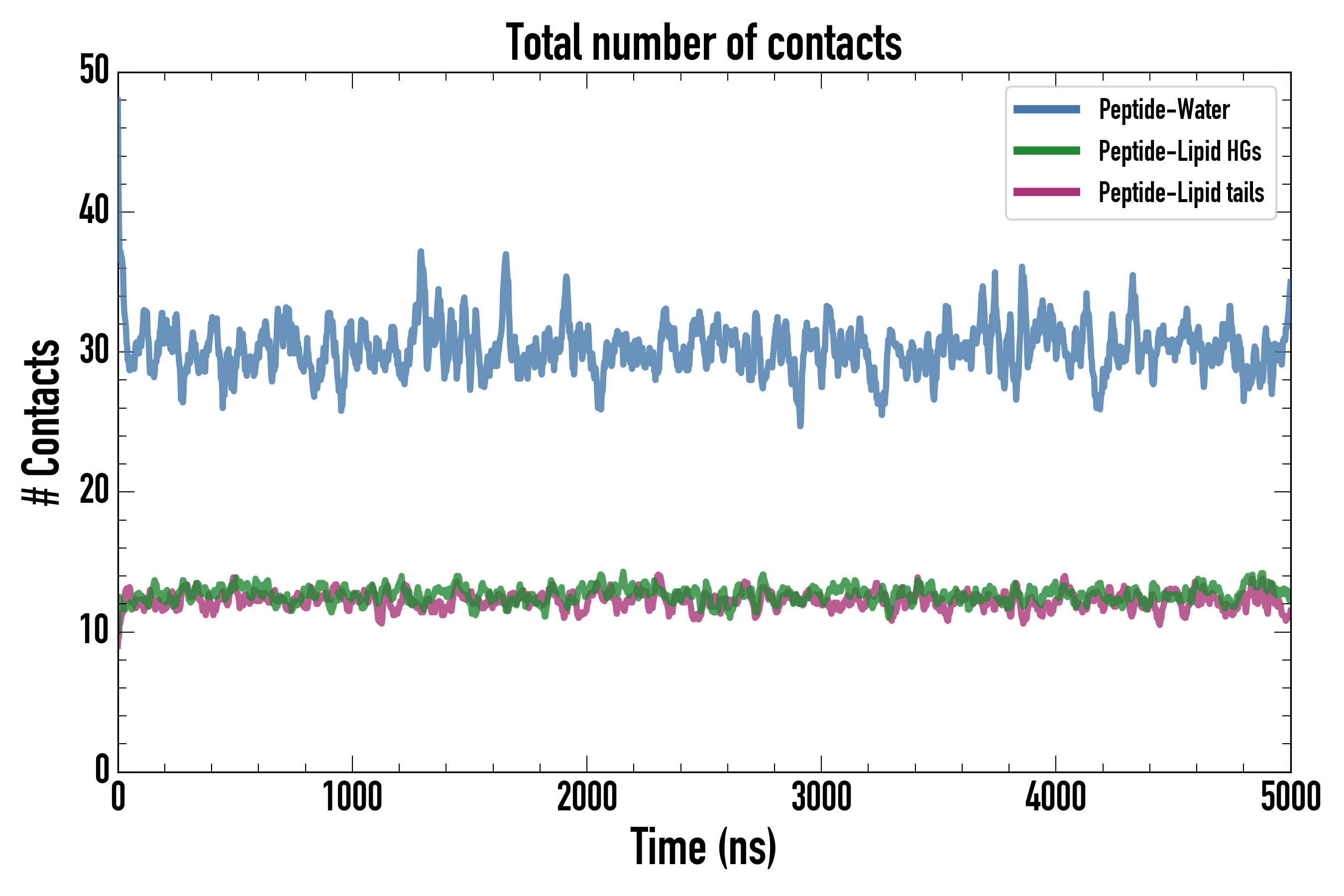 Number of contacts between each residue of the peptide backbone and the different lipid types, averaged over the last microsecond and using a cut-off of 0.6 nm.