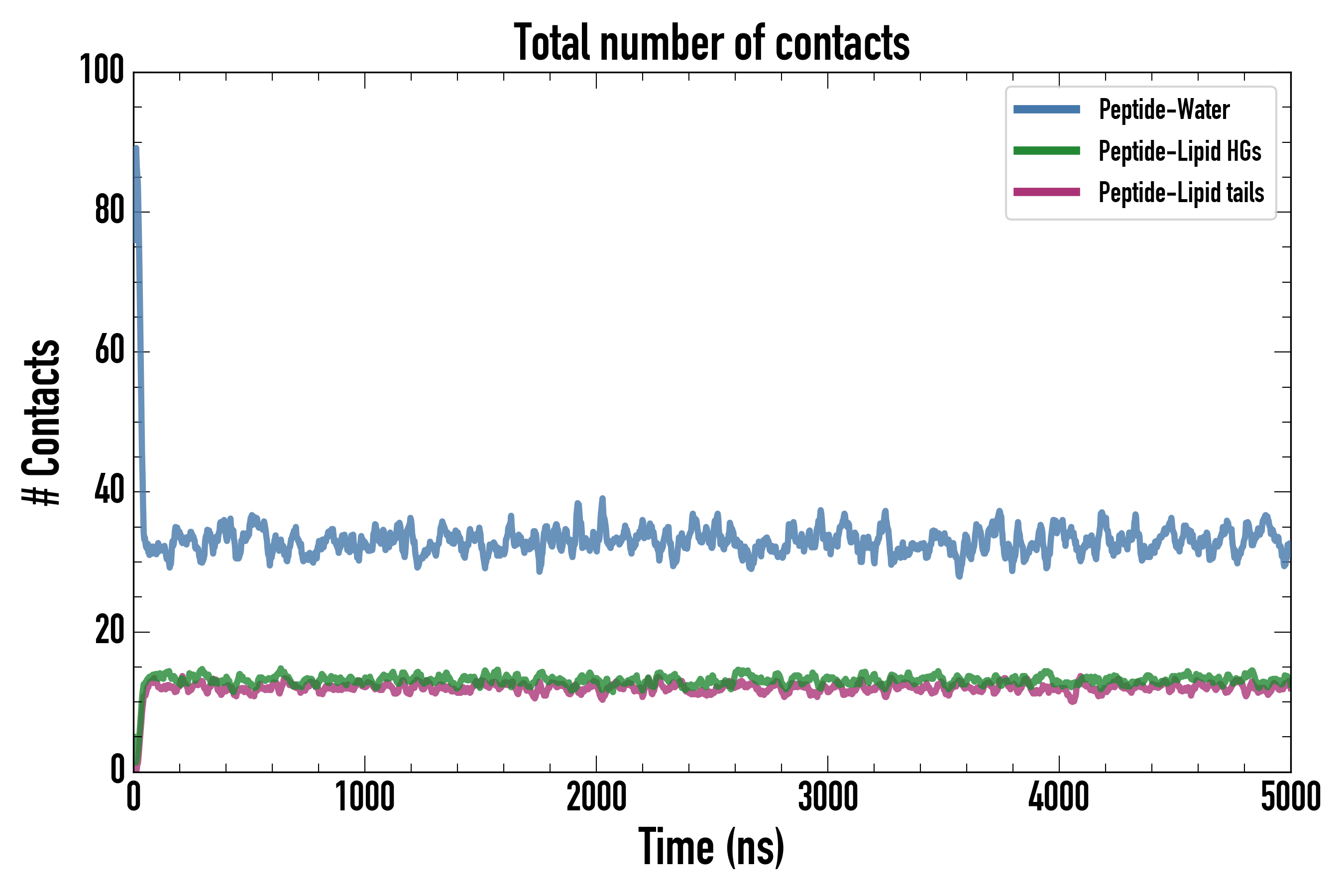 Number of contacts between each residue of the peptide backbone and the different lipid types, averaged over the last microsecond and using a cut-off of 0.6 nm.
