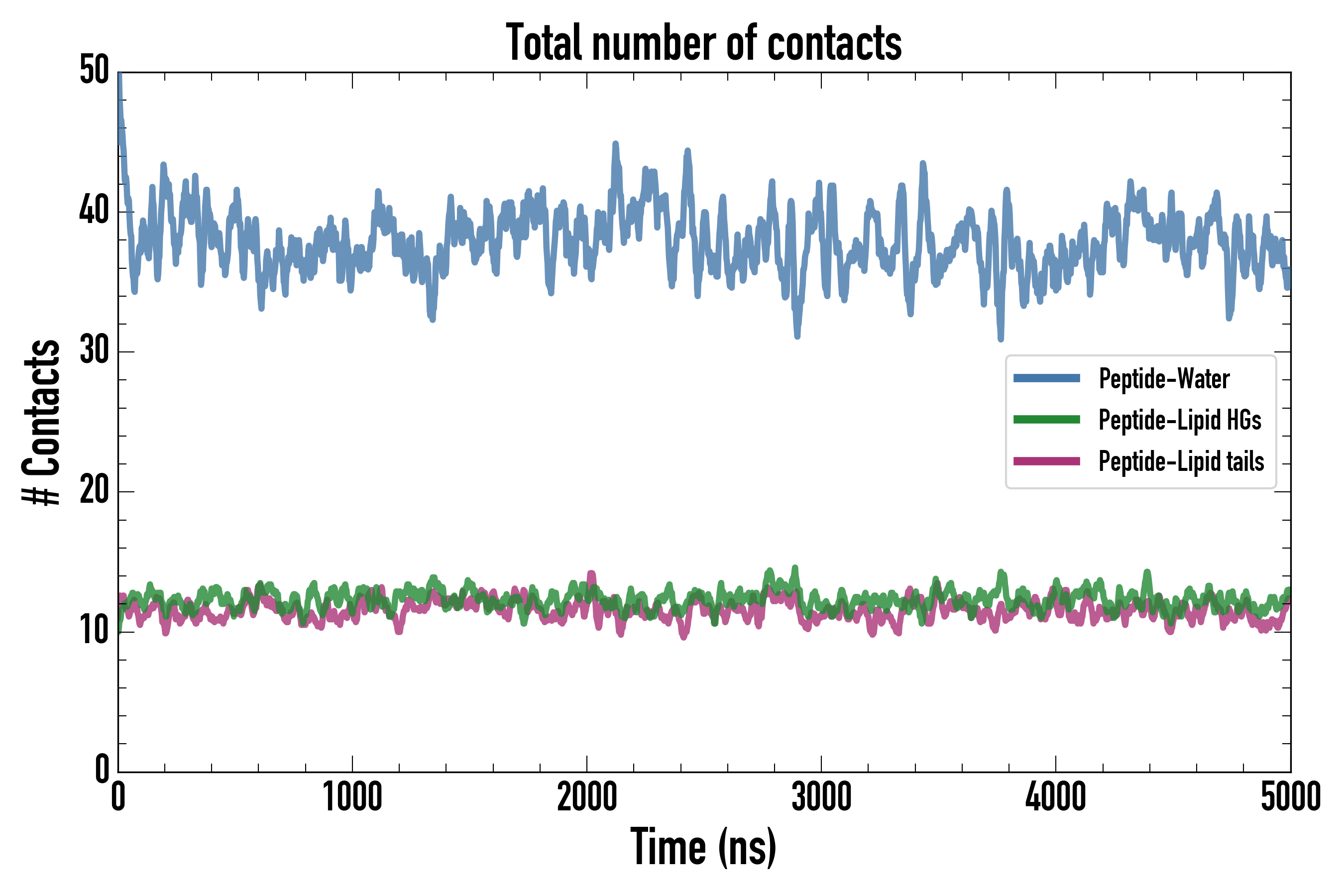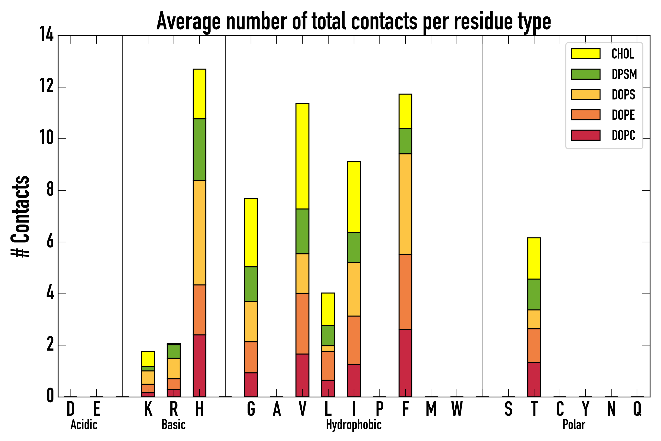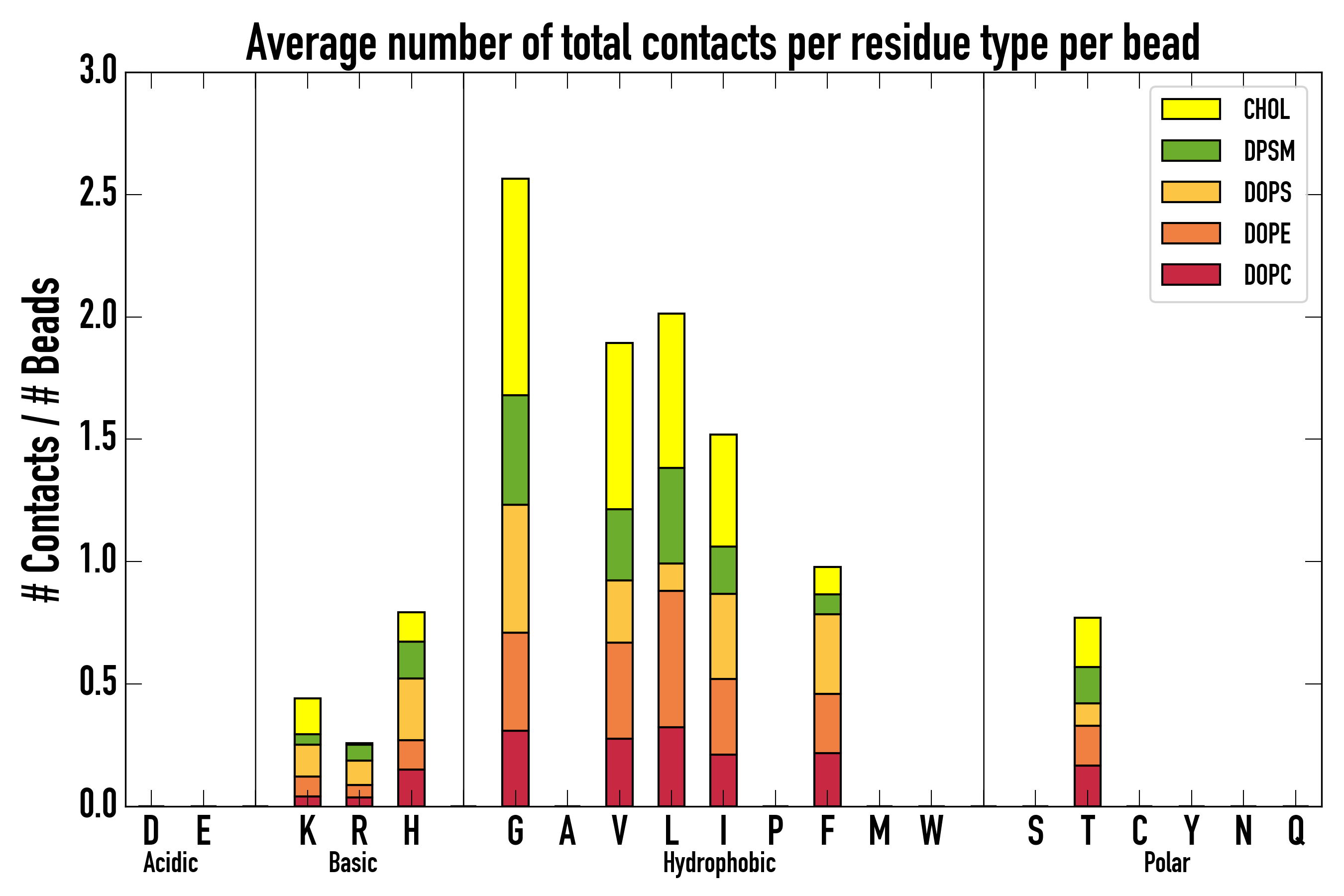 Number of contacts between each residue of the peptide backbone and the different lipid types, averaged over the last microsecond and using a cut-off of 0.6 nm.