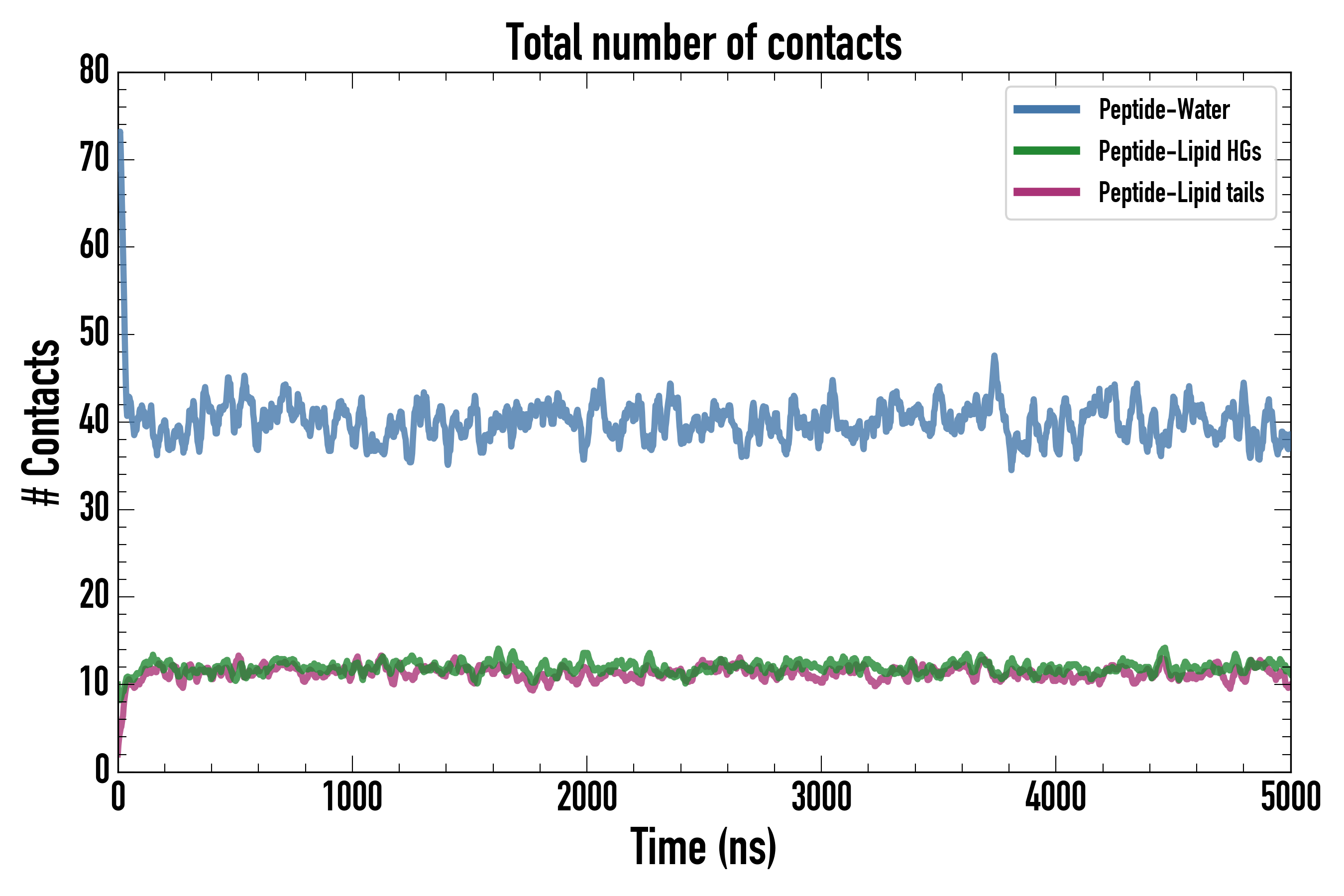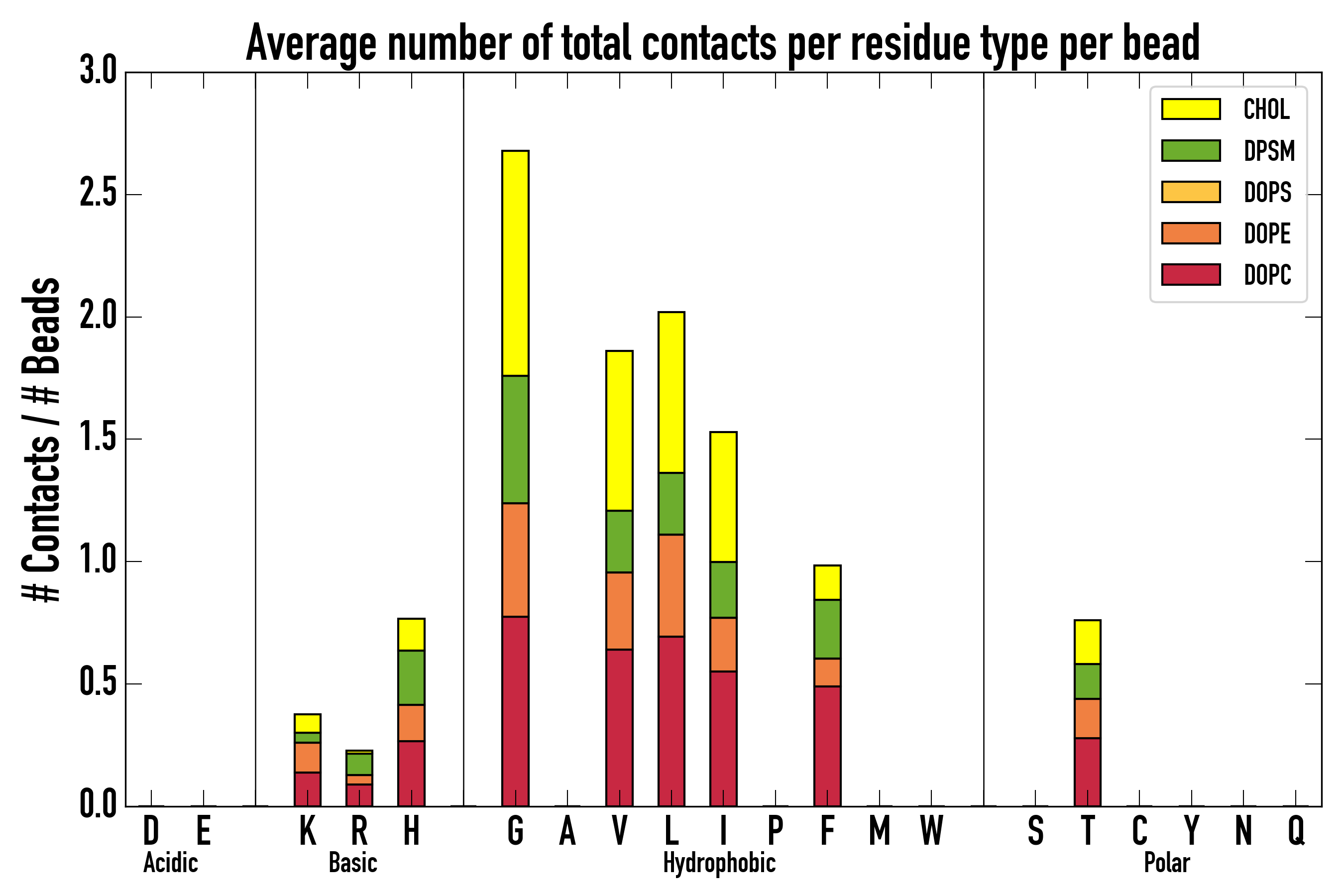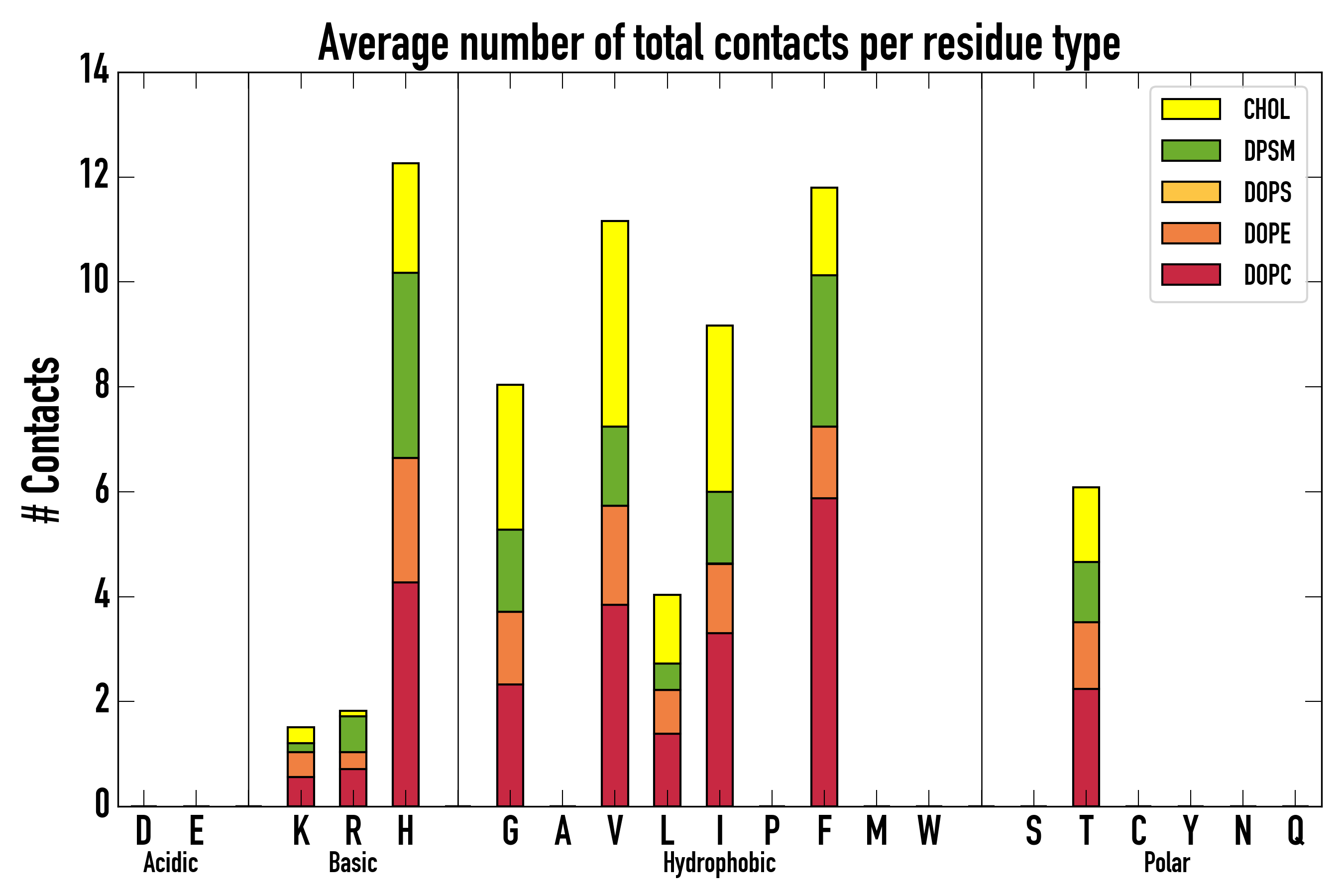 Number of contacts between each residue of the peptide backbone and the different lipid types, averaged over the last microsecond and using a cut-off of 0.6 nm.